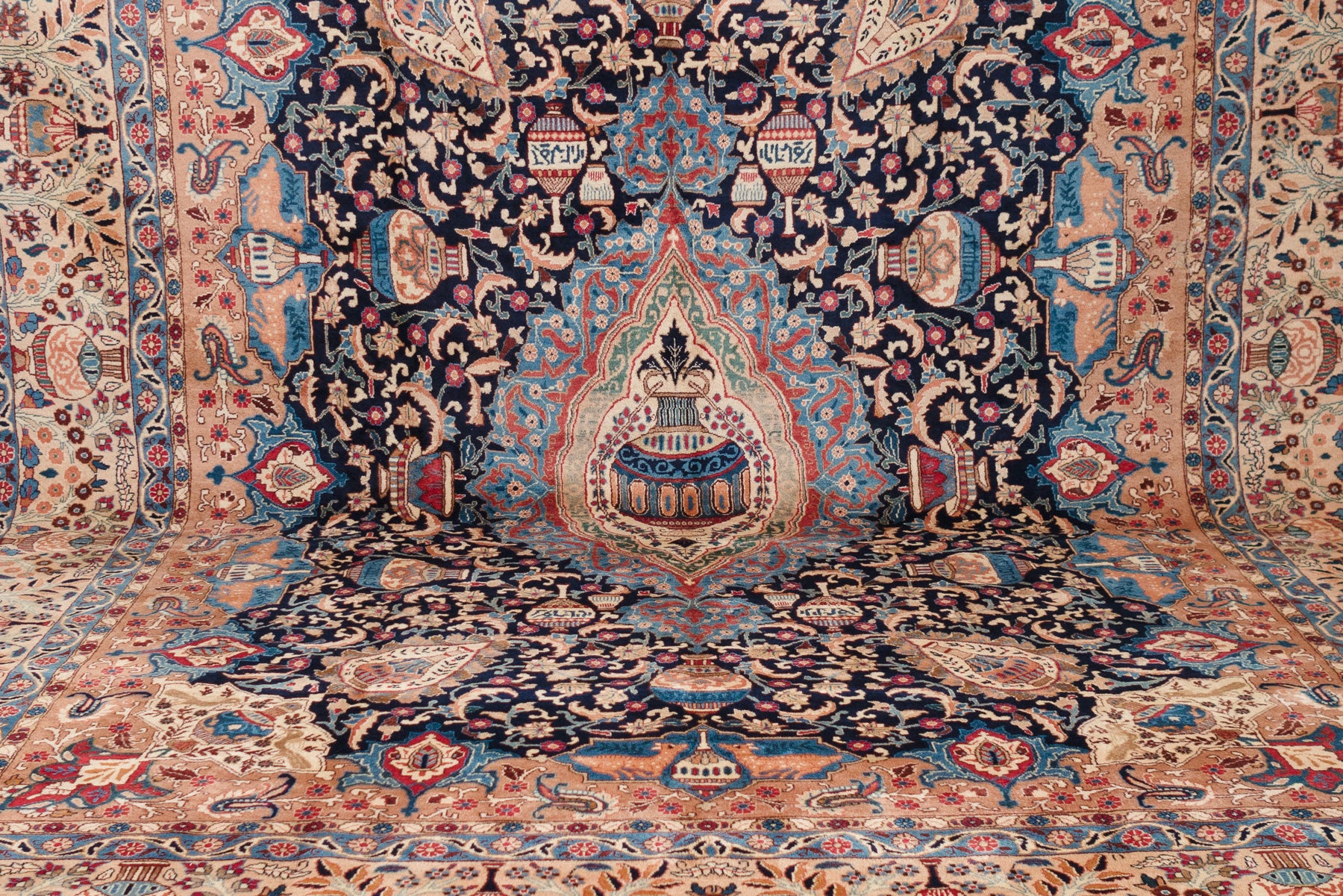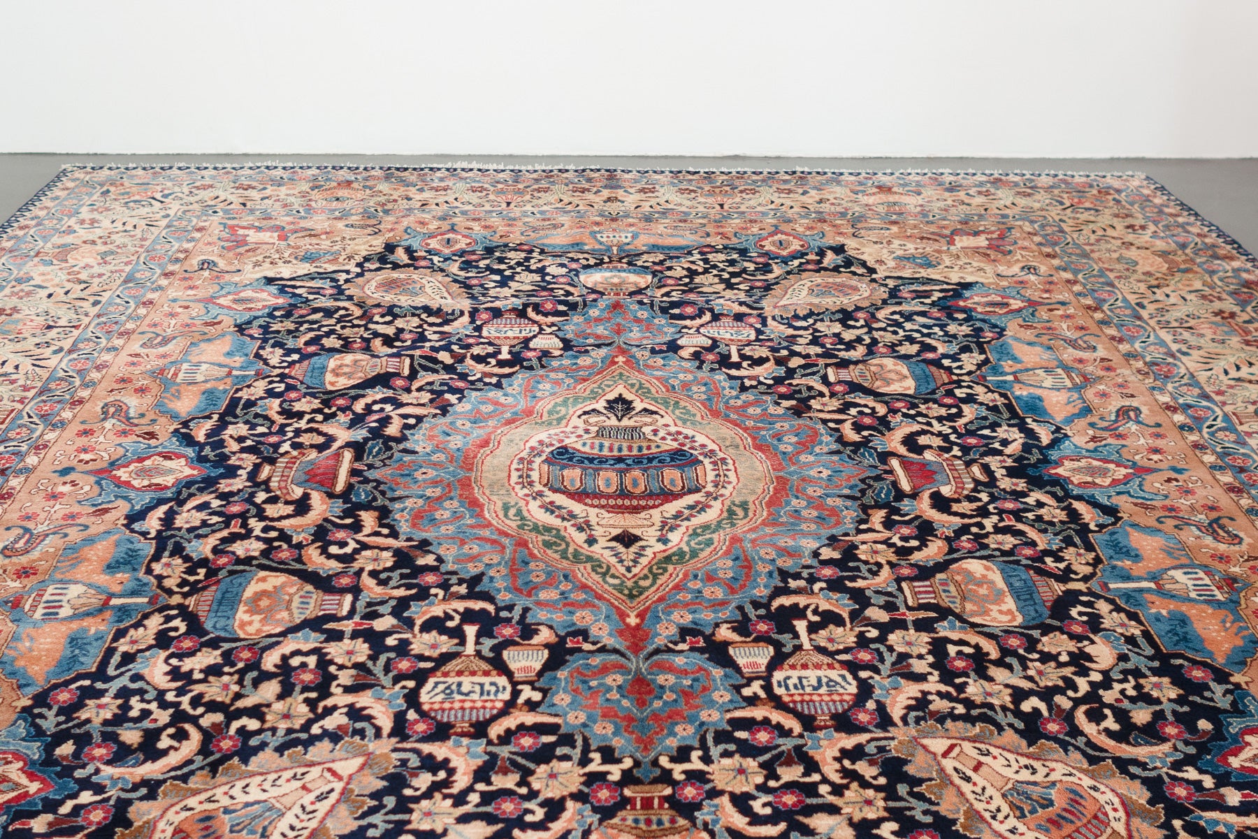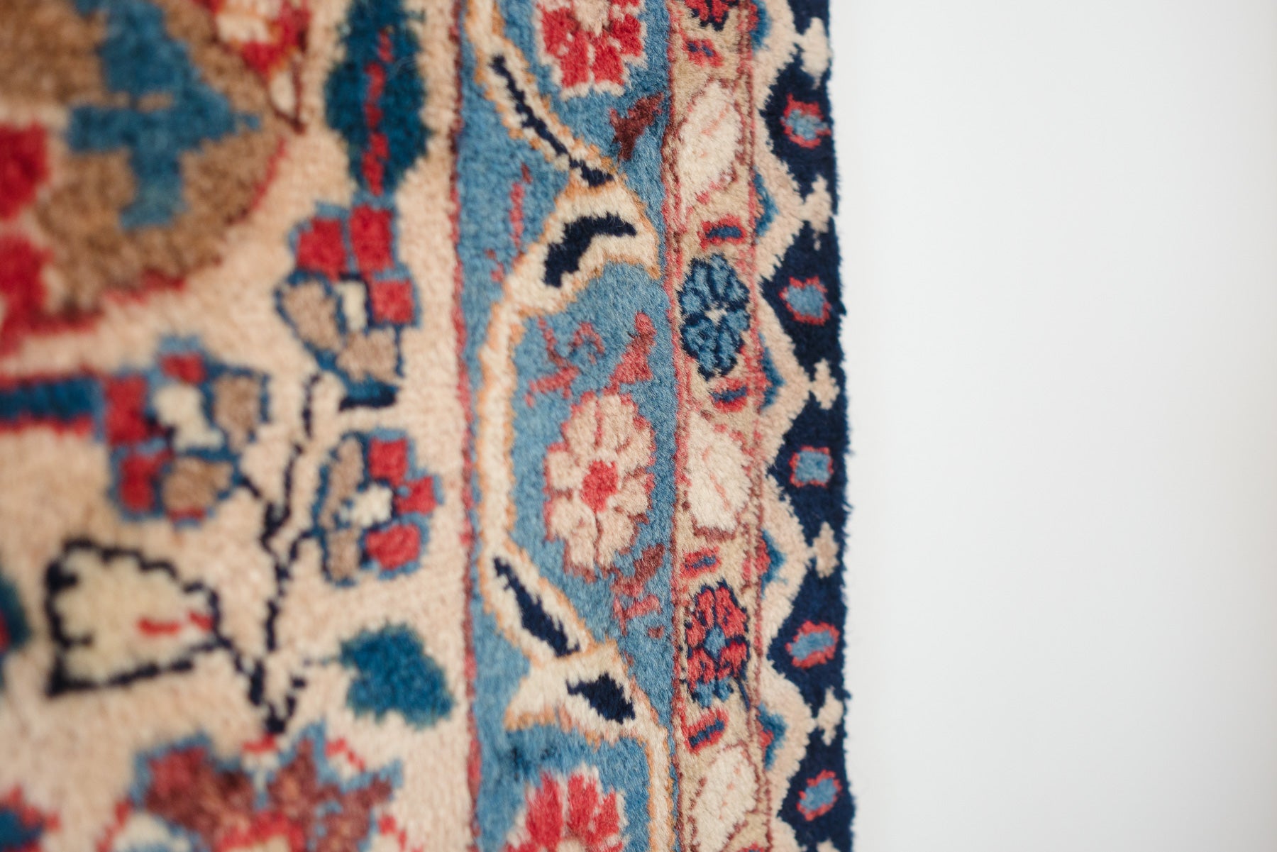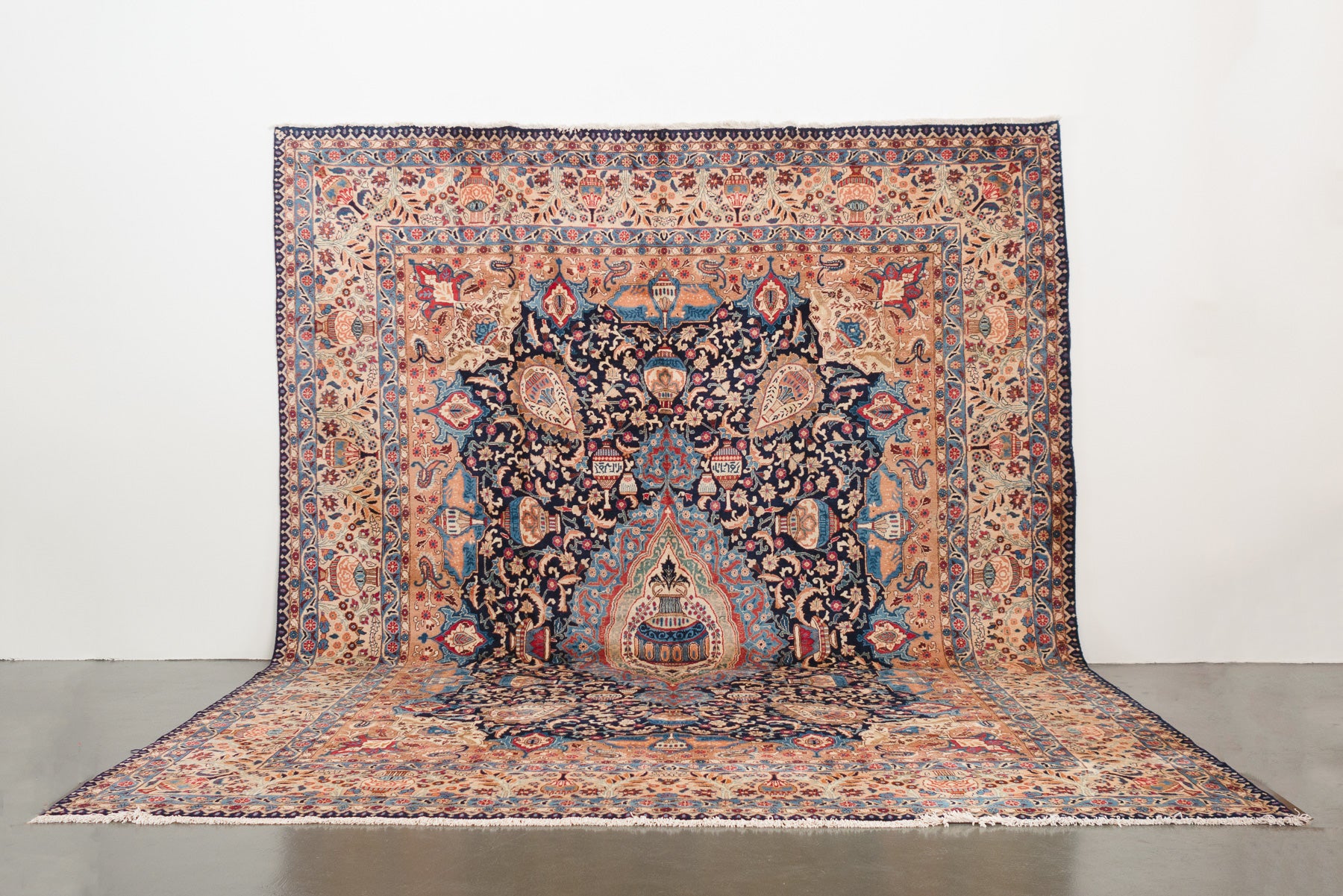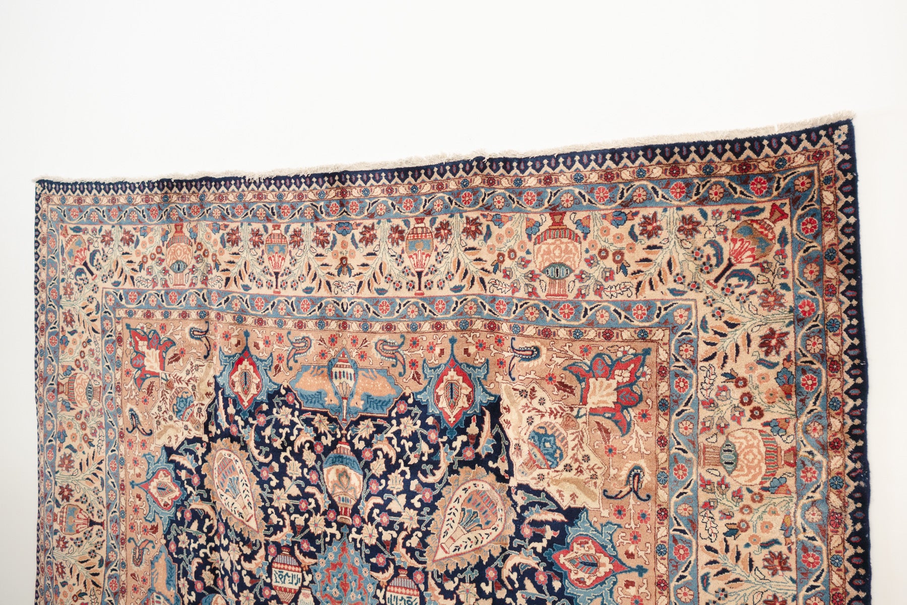 name: Zazehorigin: Iran (Persian), Kashmarstyle: rug, carpetmaterial: hand knotted woolcolors: blues, navy, red, pink, green, camel, black, cream age: vintage, 1950-1960condition: good, age related wear - see picturesappraised value: $4,700114" x 157" (closest standard rug size is 9.5x13)Free domestic shipping on all rugs.Contact us for an international shipping quote.