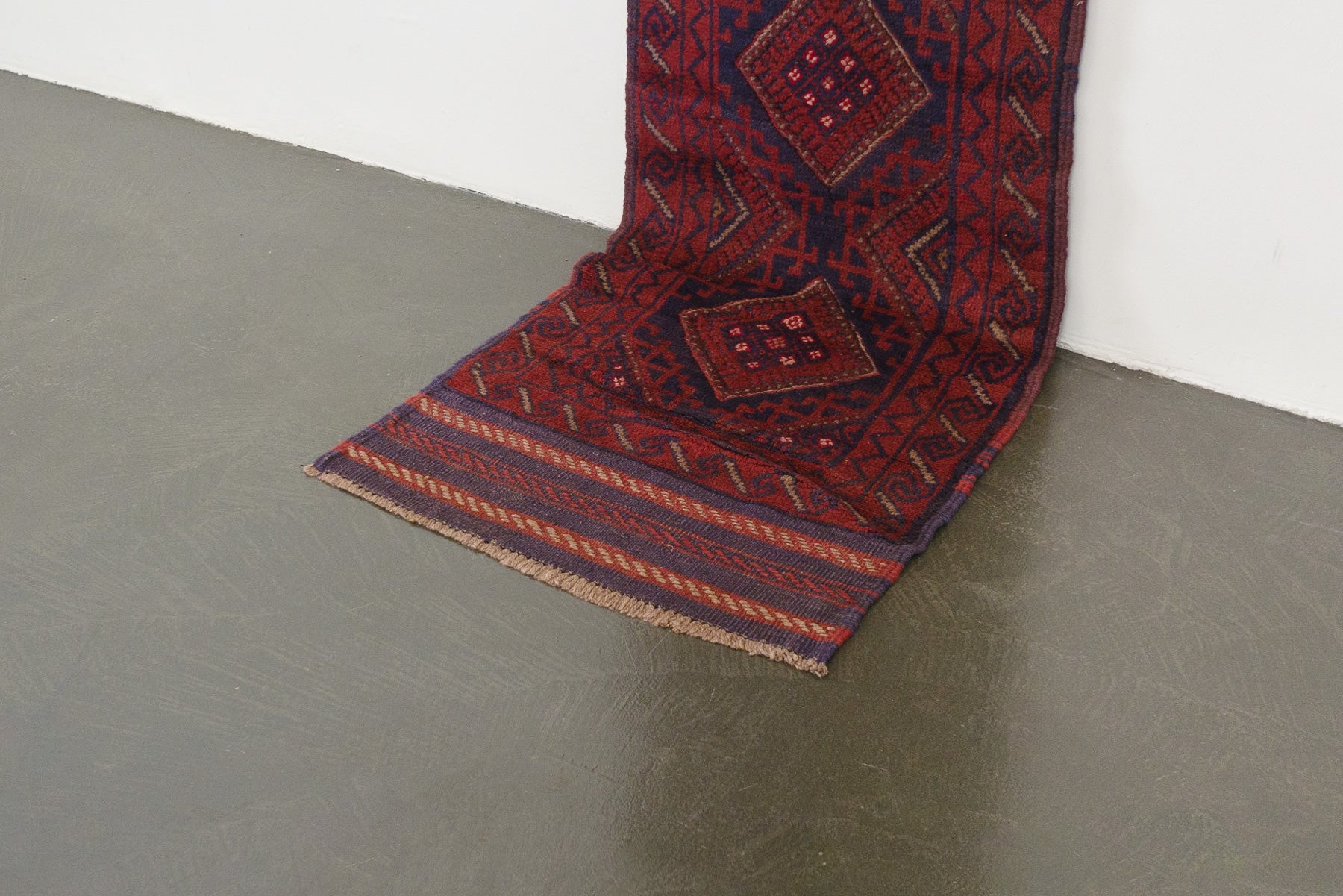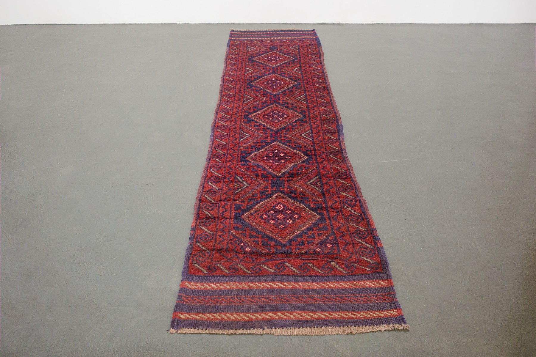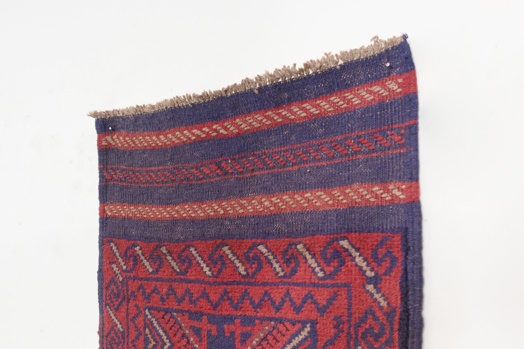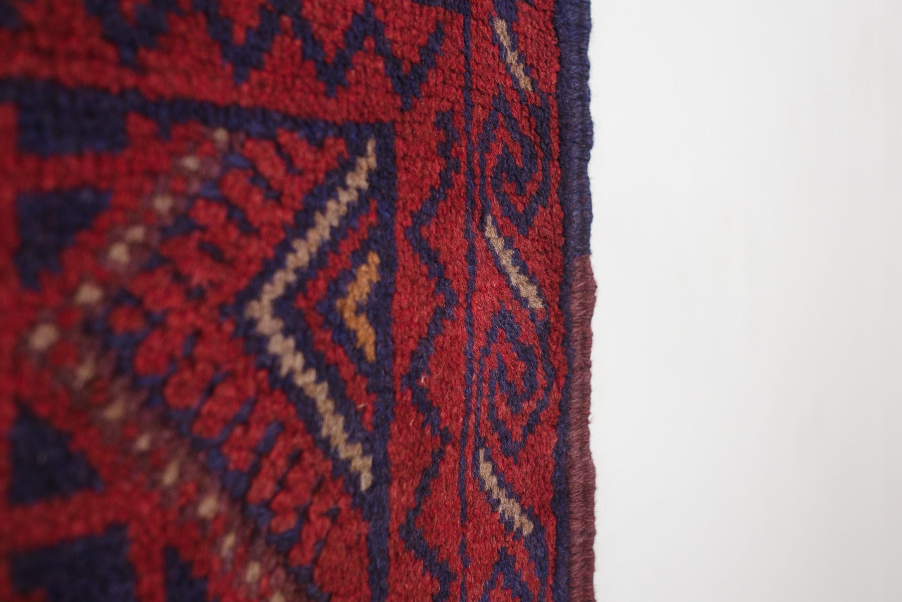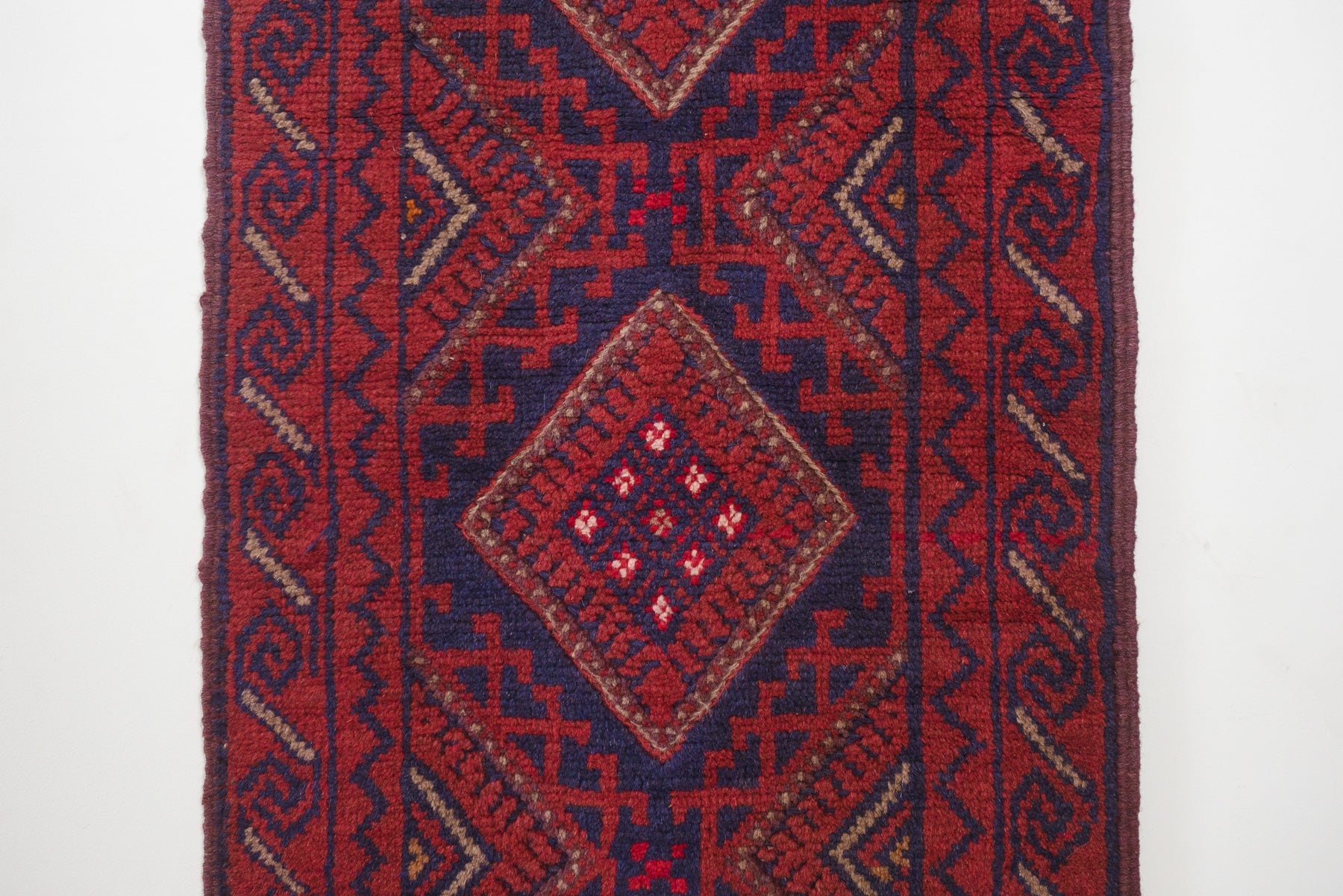 name: Zarbatorigin: Afghanistan, Tajikstyle: rug, runner, carpetmaterial: hand knotted woolcolors: red, navy, camelage: vintagecondition: good, age related wear - see picturesappraised value: $600