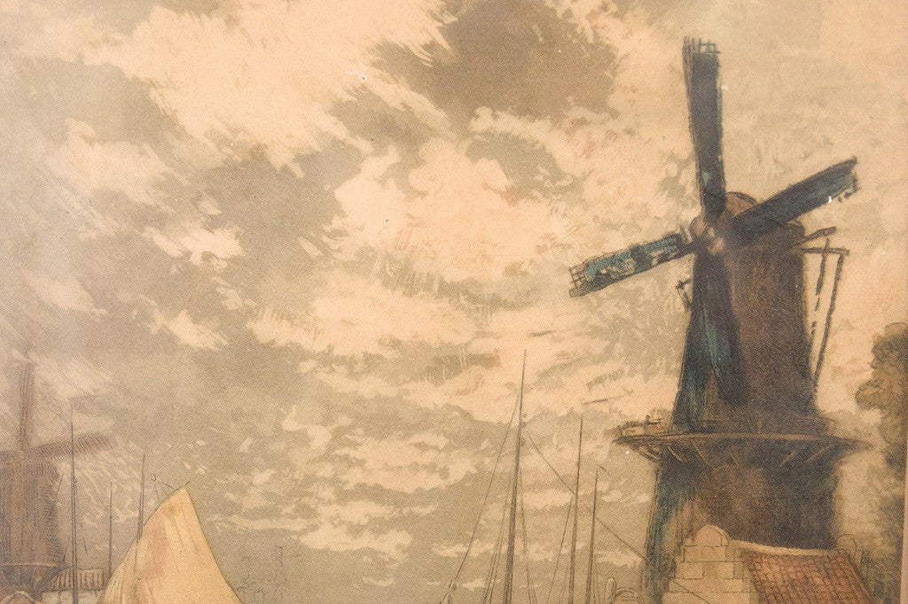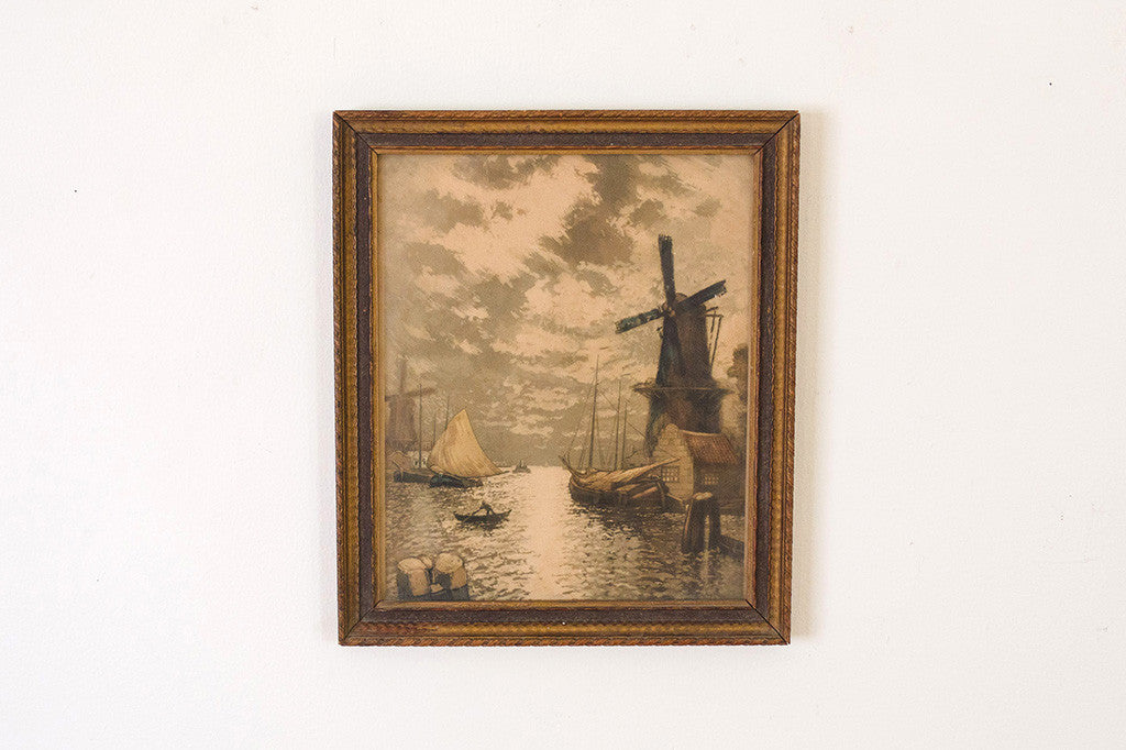 This framed Dutch print features boats and a windmill on a cloudy day at sea. It's in great overall shape with some light age related wear. Please see pictures for detailed condition of this piece.