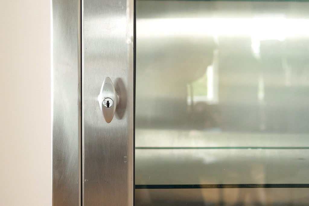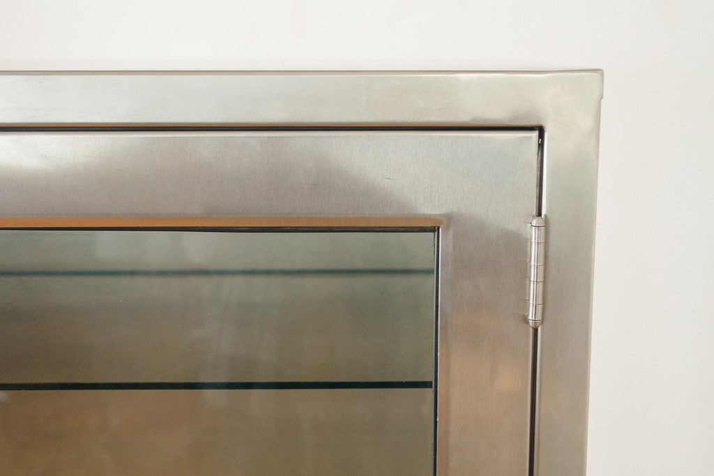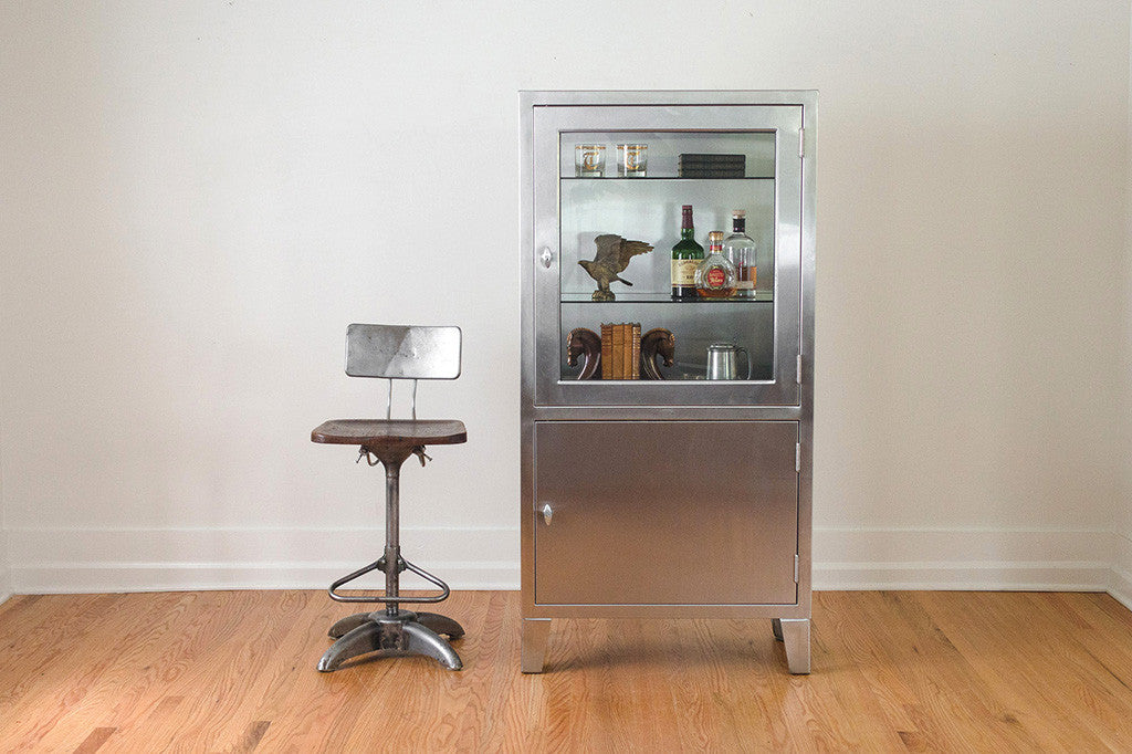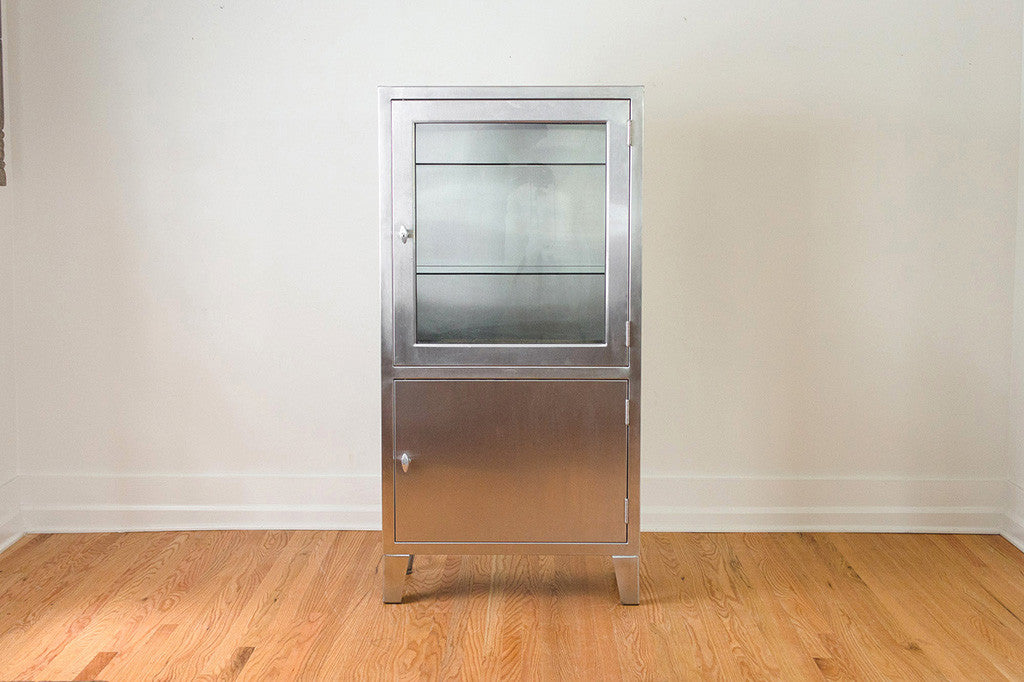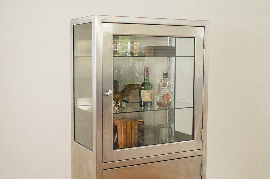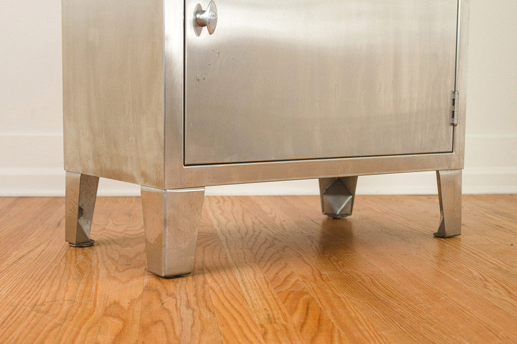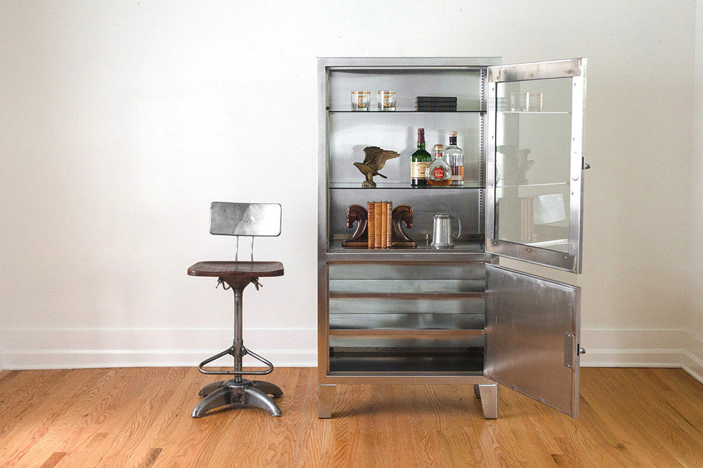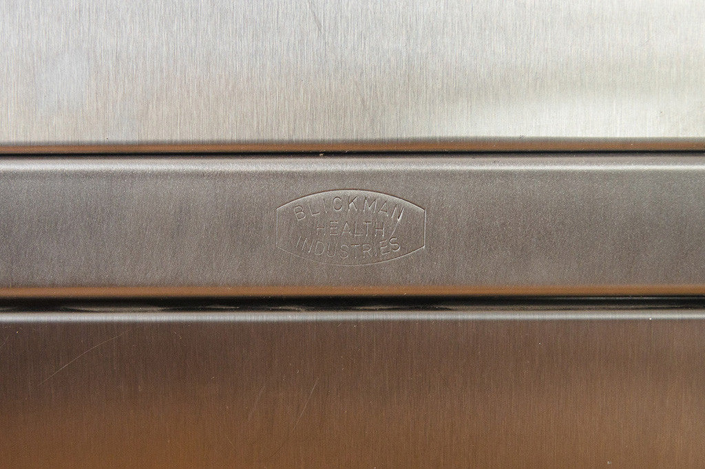 This vintage stainless steel medical cabinet was made by Blickman in the 1940s. Its intended use was to safely store narcotics. Today this cabinet would be a perfect bar, pantry, bathroom storage piece, bookcase, store display or armoire. It's in excellent overall shape with some age related wear. Please see pictures for detailed condition of this piece.