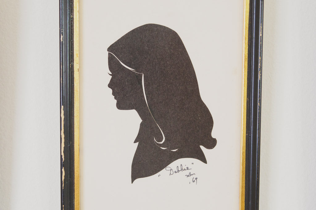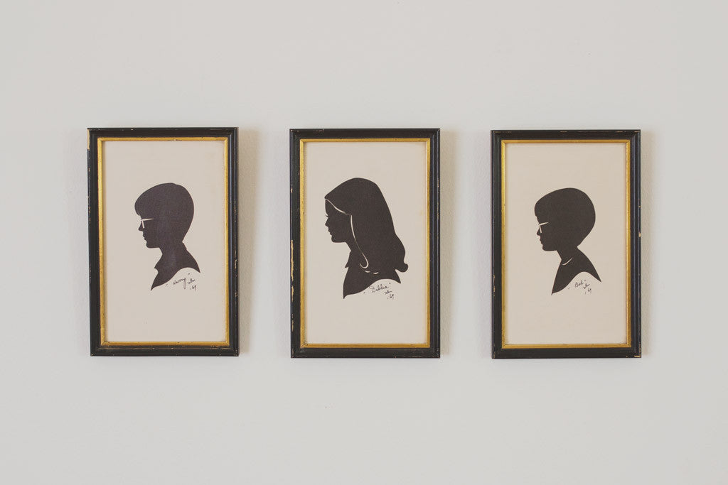 This set of detailed vintage paper silhouettes are dated '67 with the names, "Harry", "Debbie" and "Bob". They have black and gold frames, glass fronts and show some age related wear. Please see pictures for detailed condition.