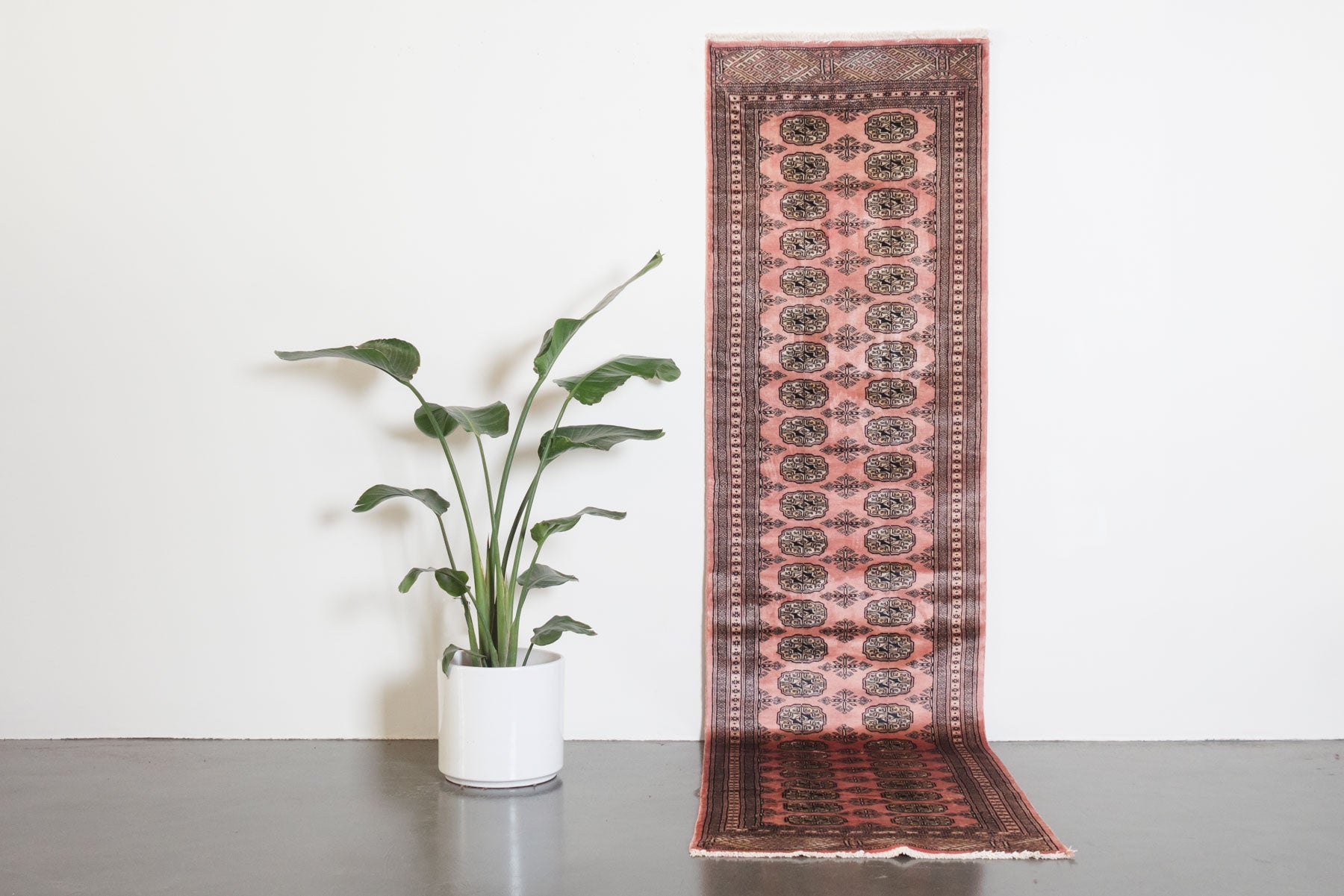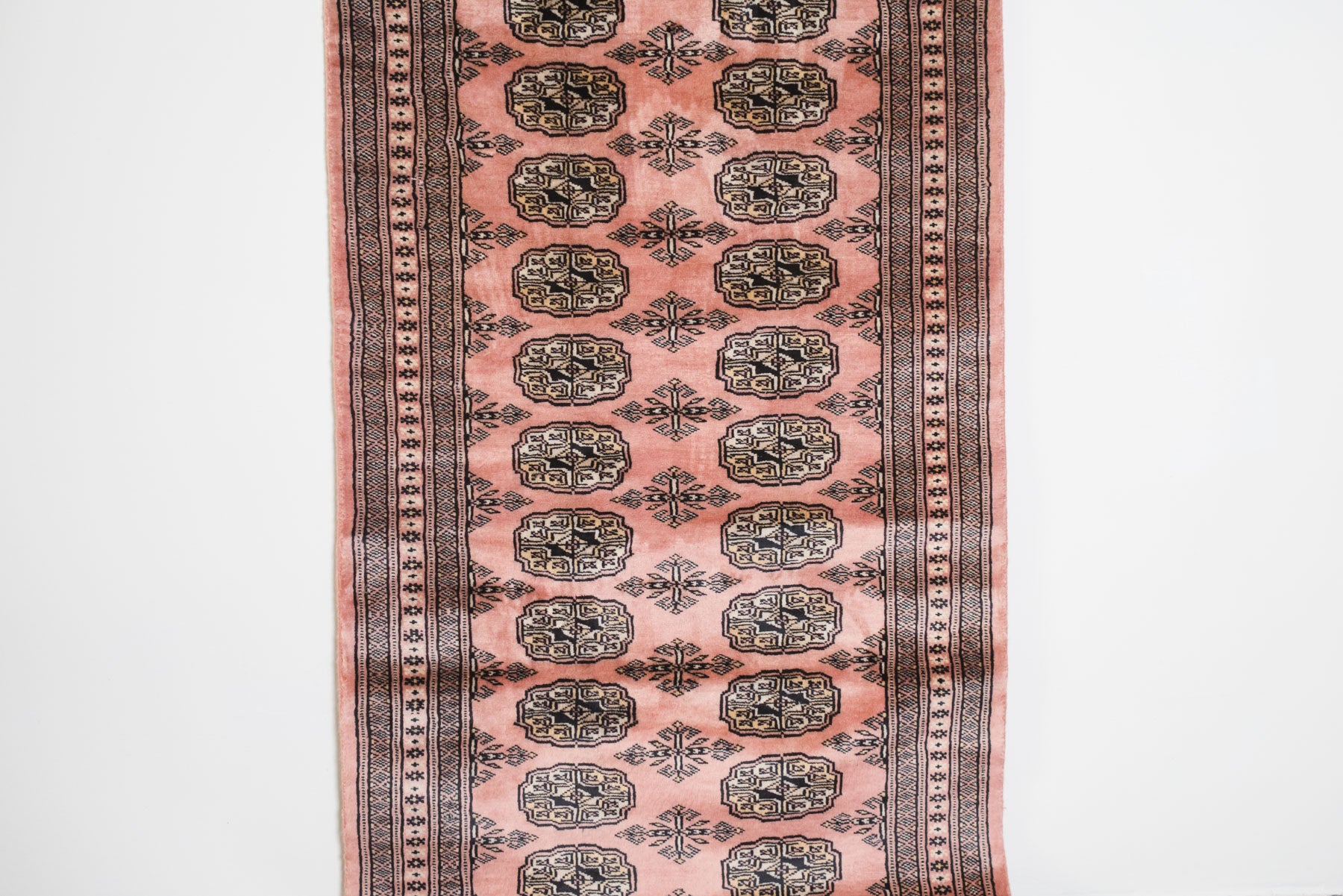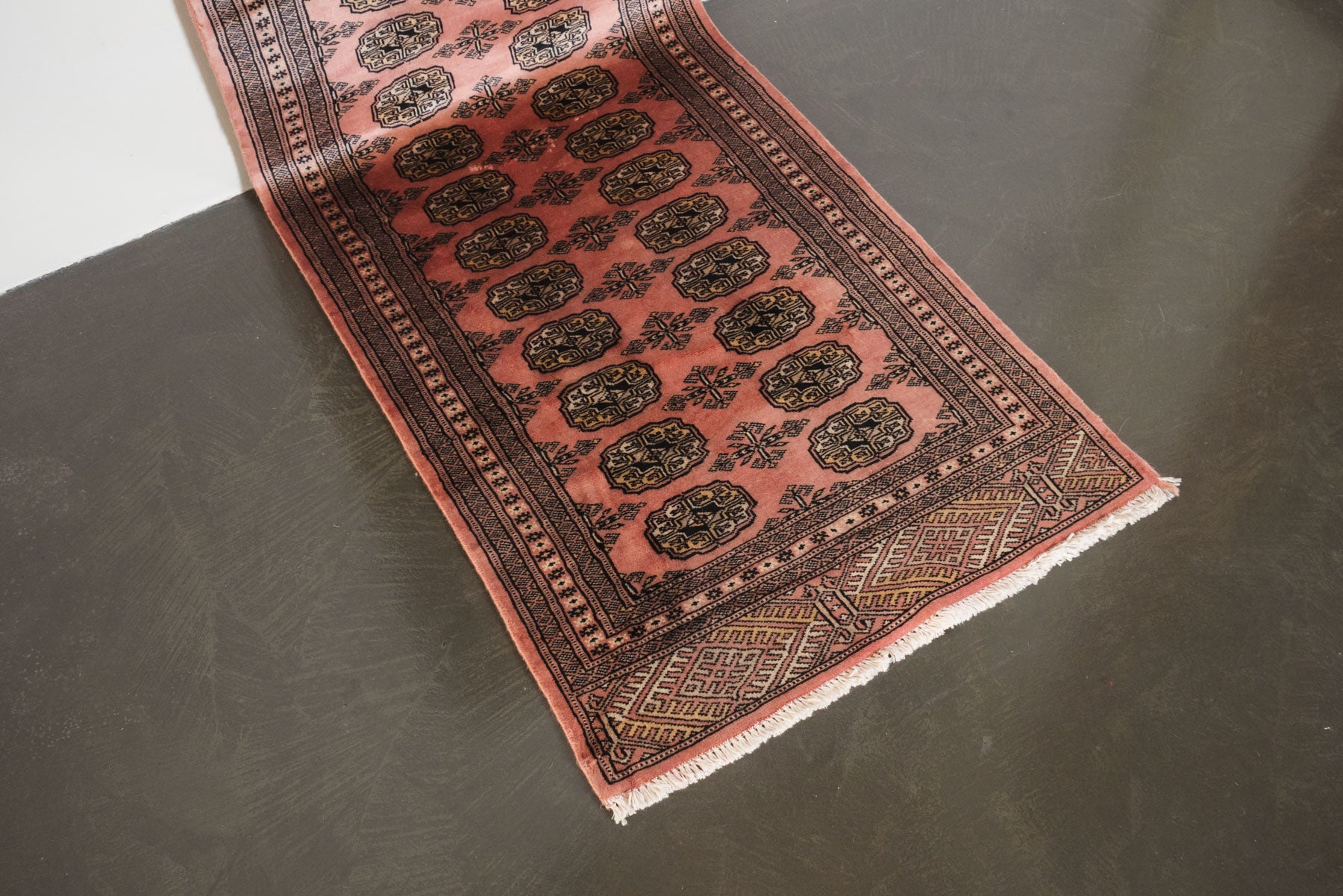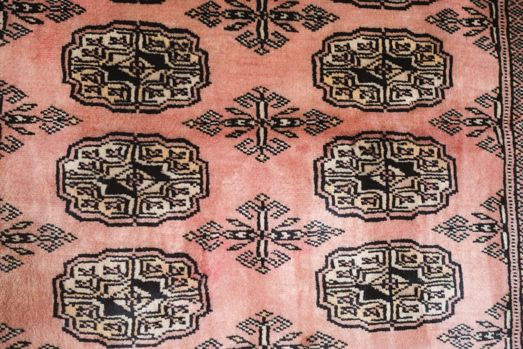 name: Aizadstyle: hand knotted, Pakistani, Peshawar, Bokhara, rug, runner, carpetmaterial: woolcolors: pink, salmon, yellow, black, creamage: vintagecondition: good, age related wear - see pictures