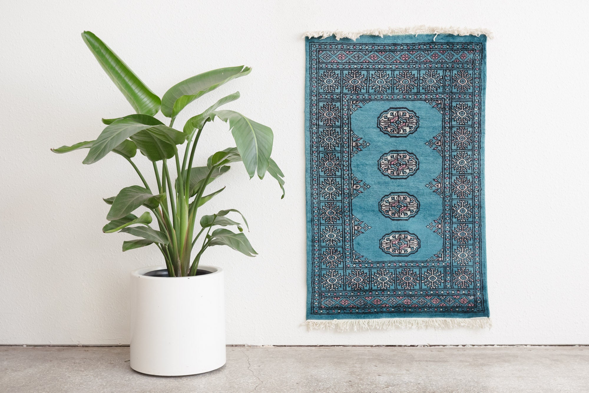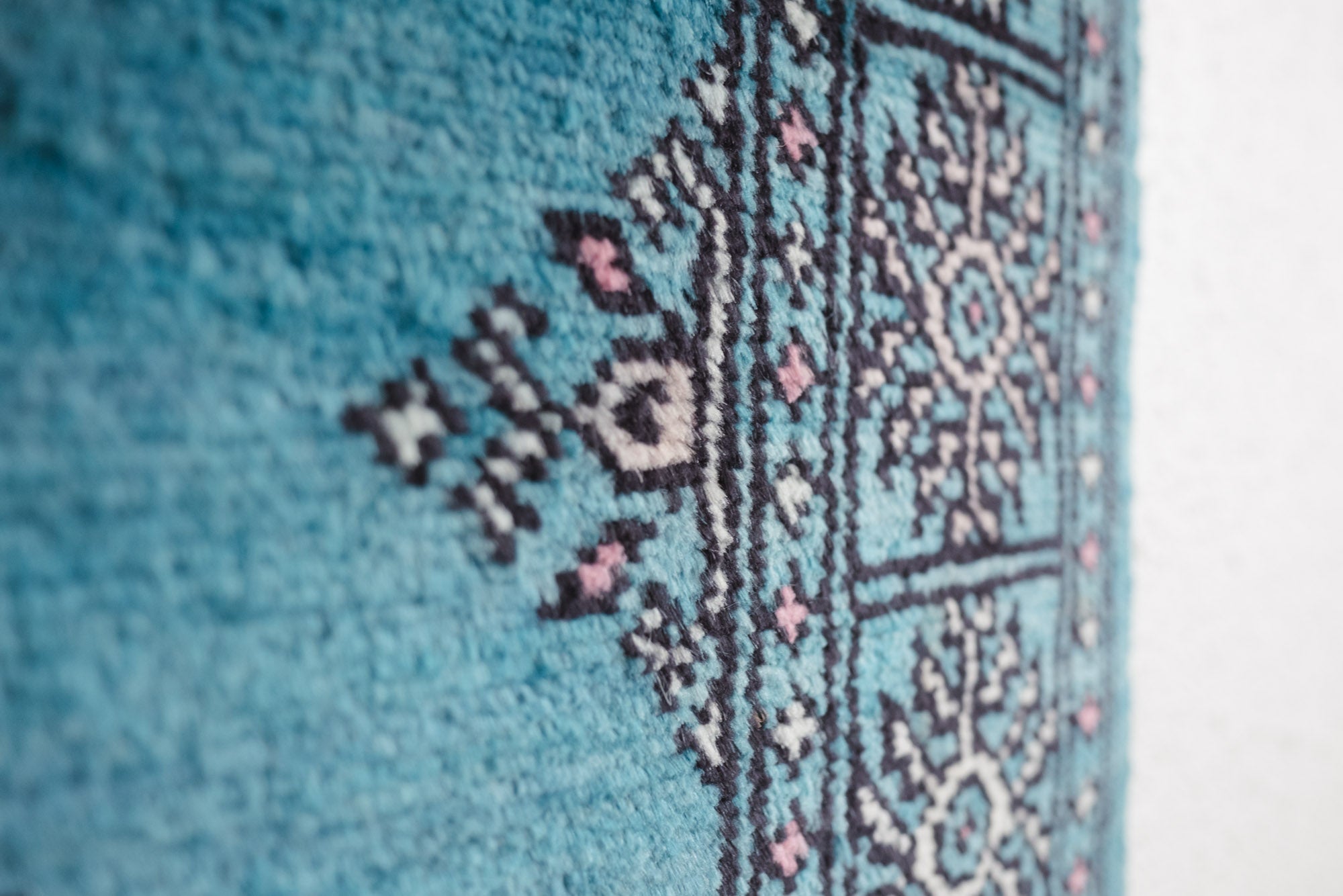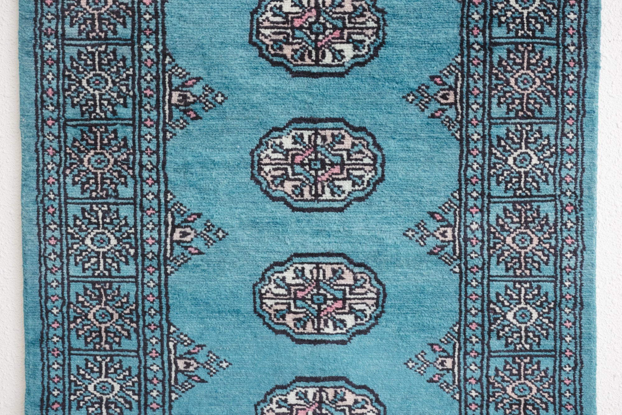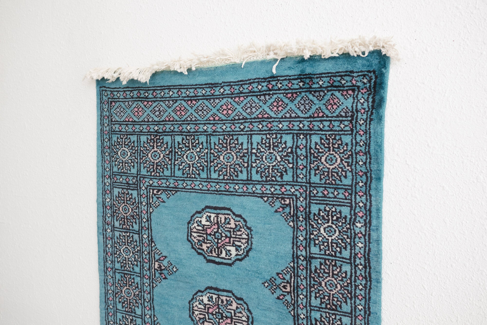 name: Kalesh style: hand knotted, Pakistani, Peshawar, Bokhara, rug, carpet material: wool colors: teal, pink, mauve, black, mint, blue age: new condition: good, age related wear - see pictures