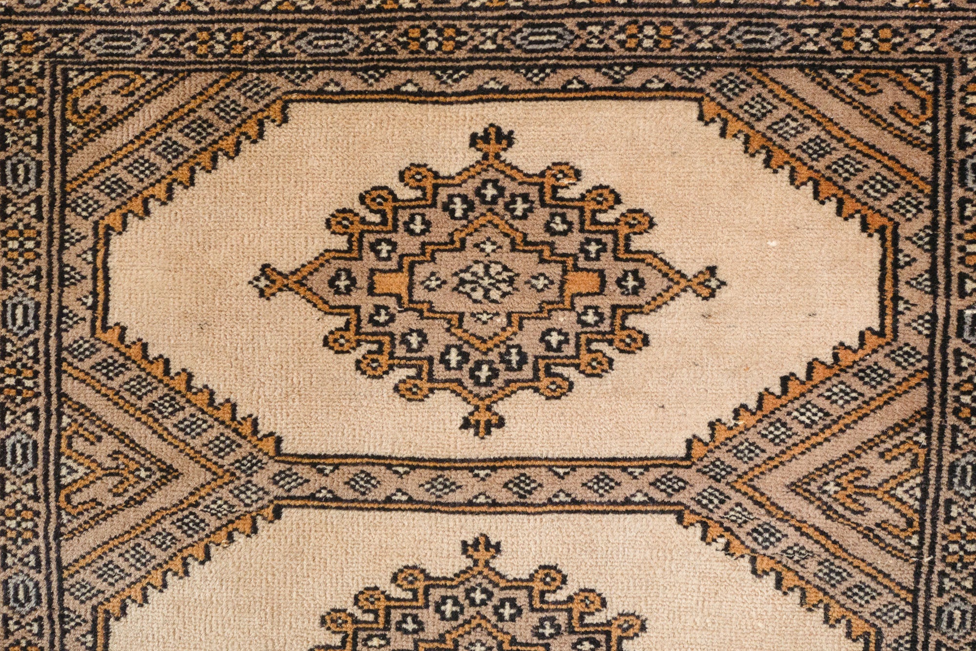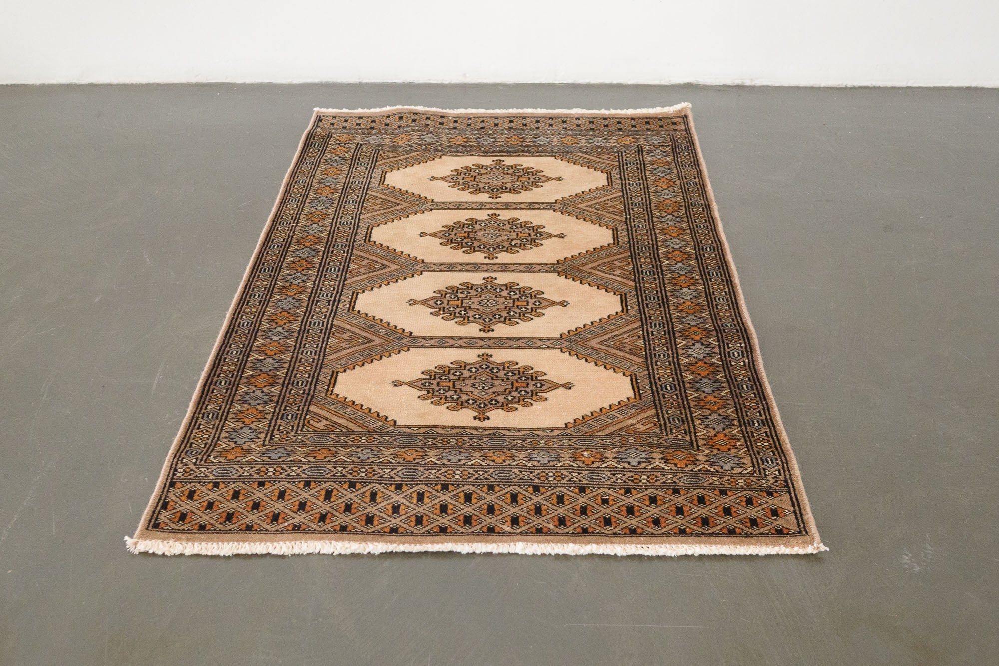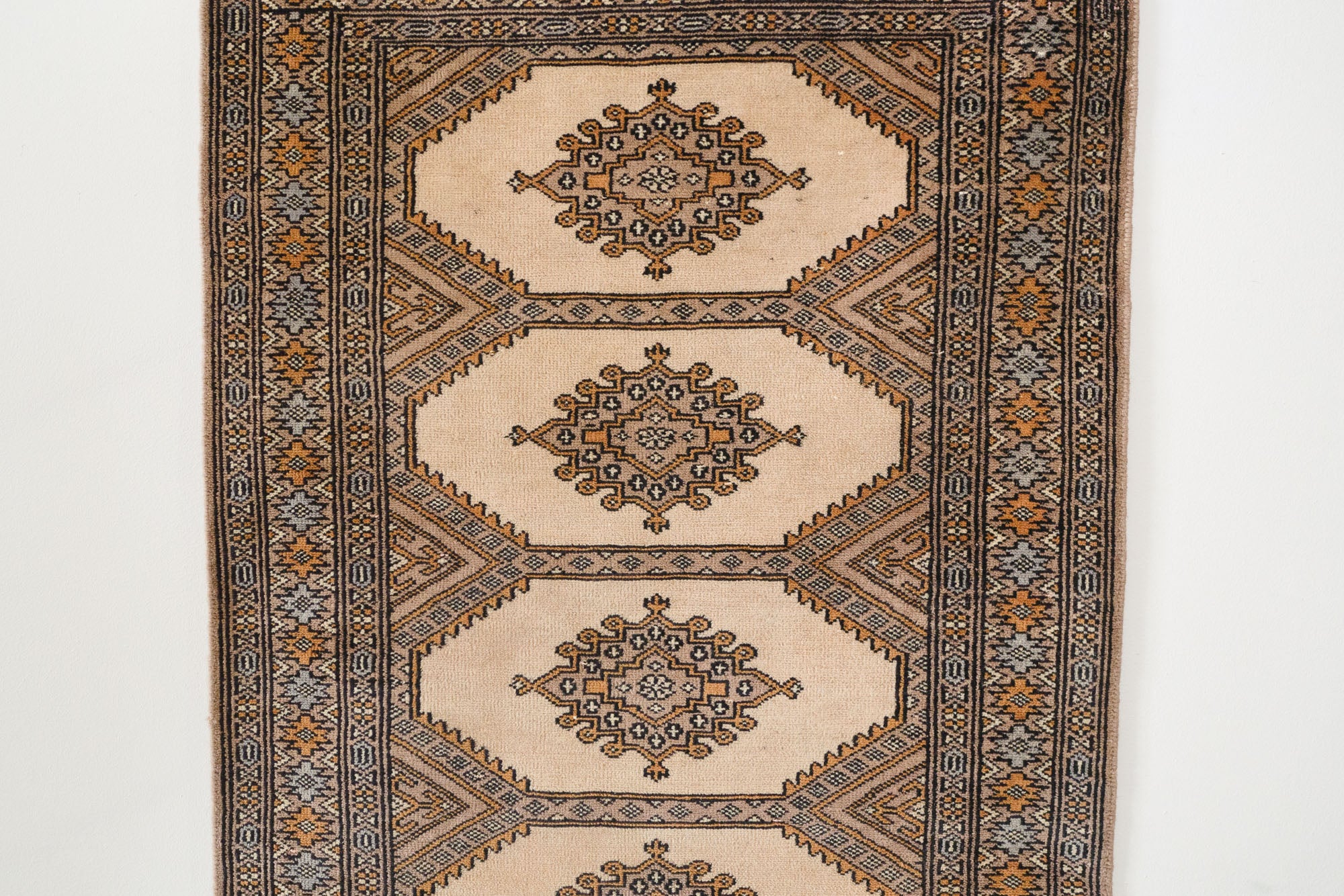 name: Barsinaorigin: Pakistanstyle: peshawar bokhara, rug, carpetmaterial: hand knotted woolcolors: cream, tan, brown, gray, pinkage: vintage, 1940-1970condition: good, age related wear - see picturesestimated cost: $572sku: pk-226