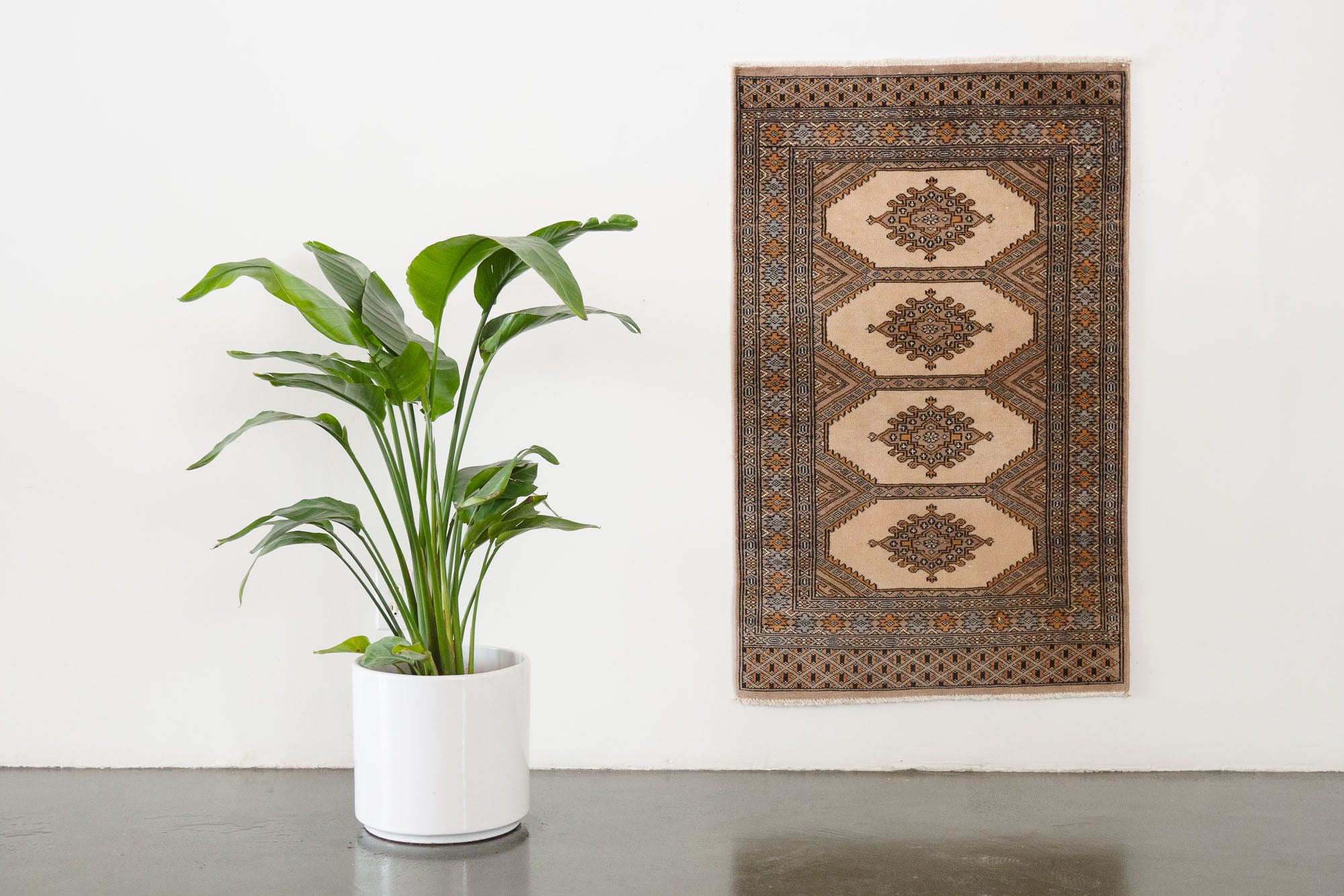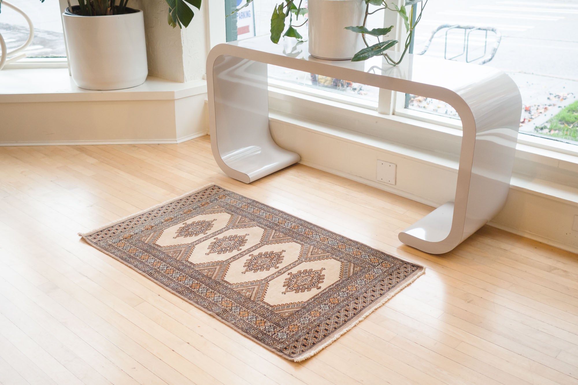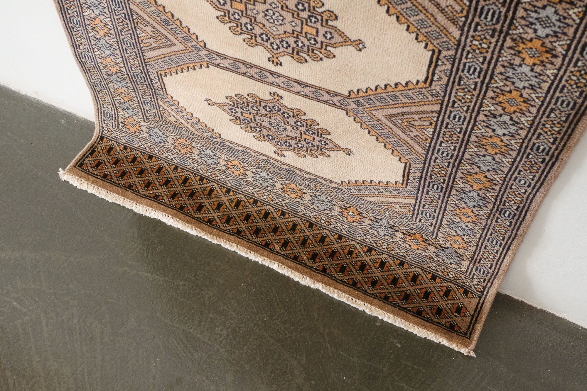 name: Barsinaorigin: Pakistanstyle: peshawar bokhara, rug, carpetmaterial: hand knotted woolcolors: cream, tan, brown, gray, pinkage: vintage, 1940-1970condition: good, age related wear - see picturesestimated cost: $572sku: pk-226