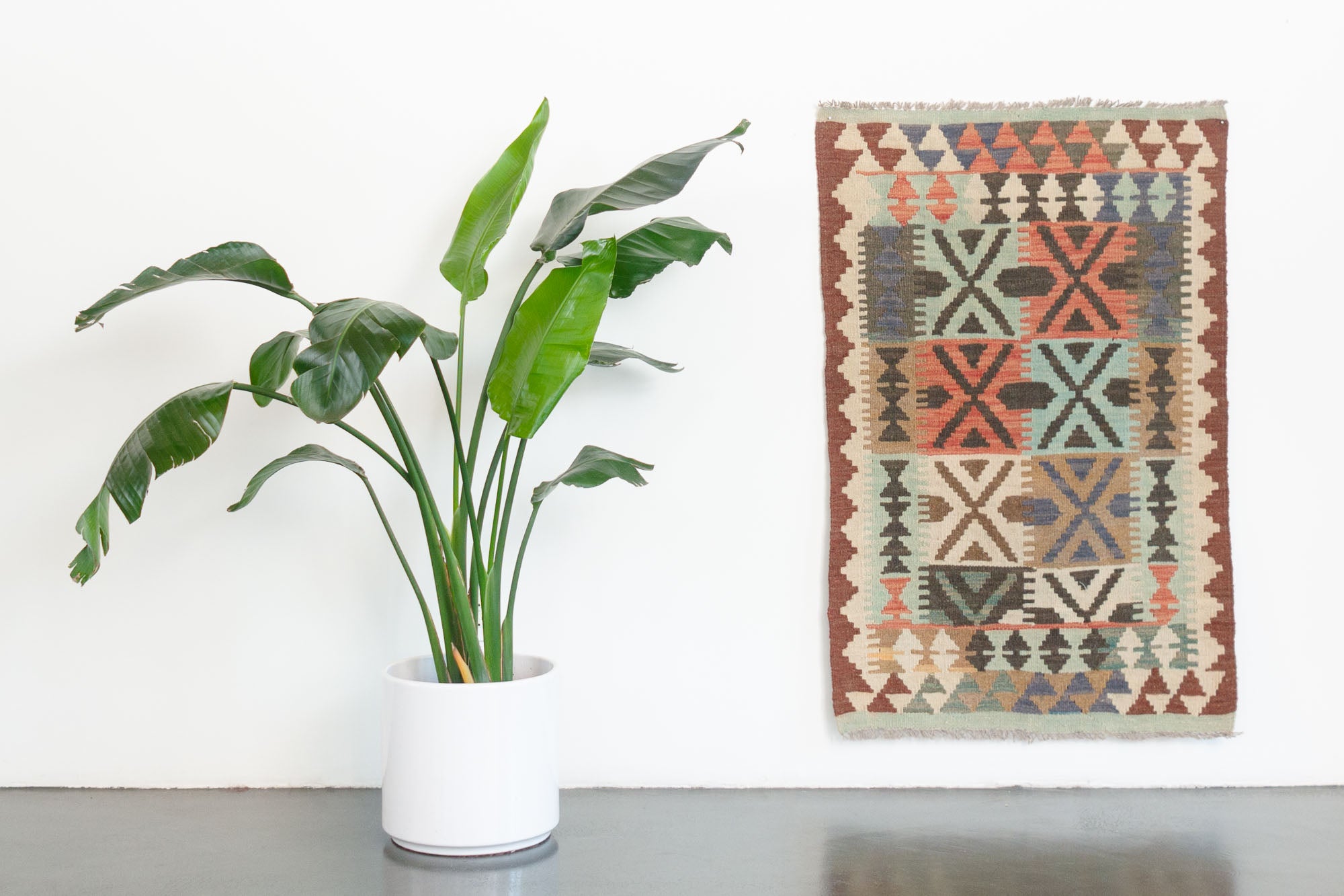name: Nisan origin: Turkey style: kilim, rug, carpet material: hand woven wool color: reds, blues, gray, cream, brown age: vintage condition: good, age related wear - see pictures