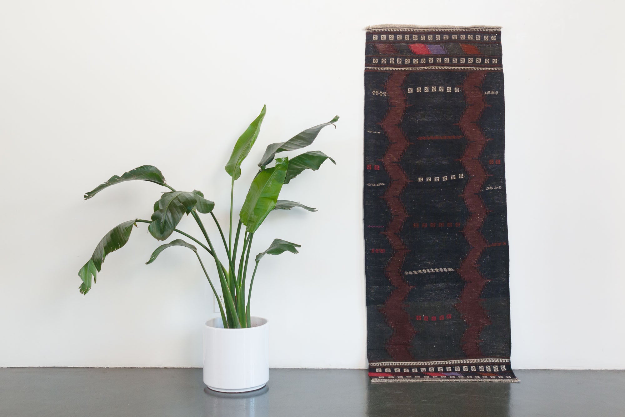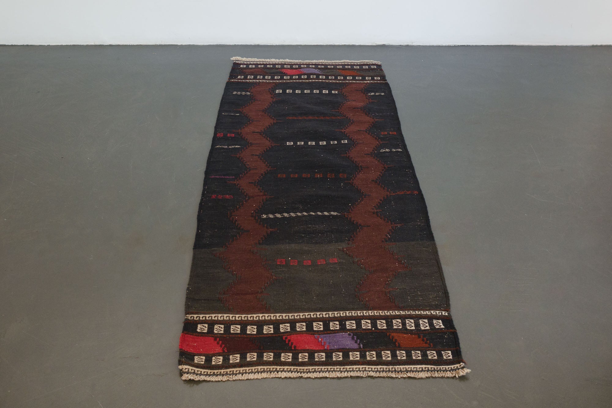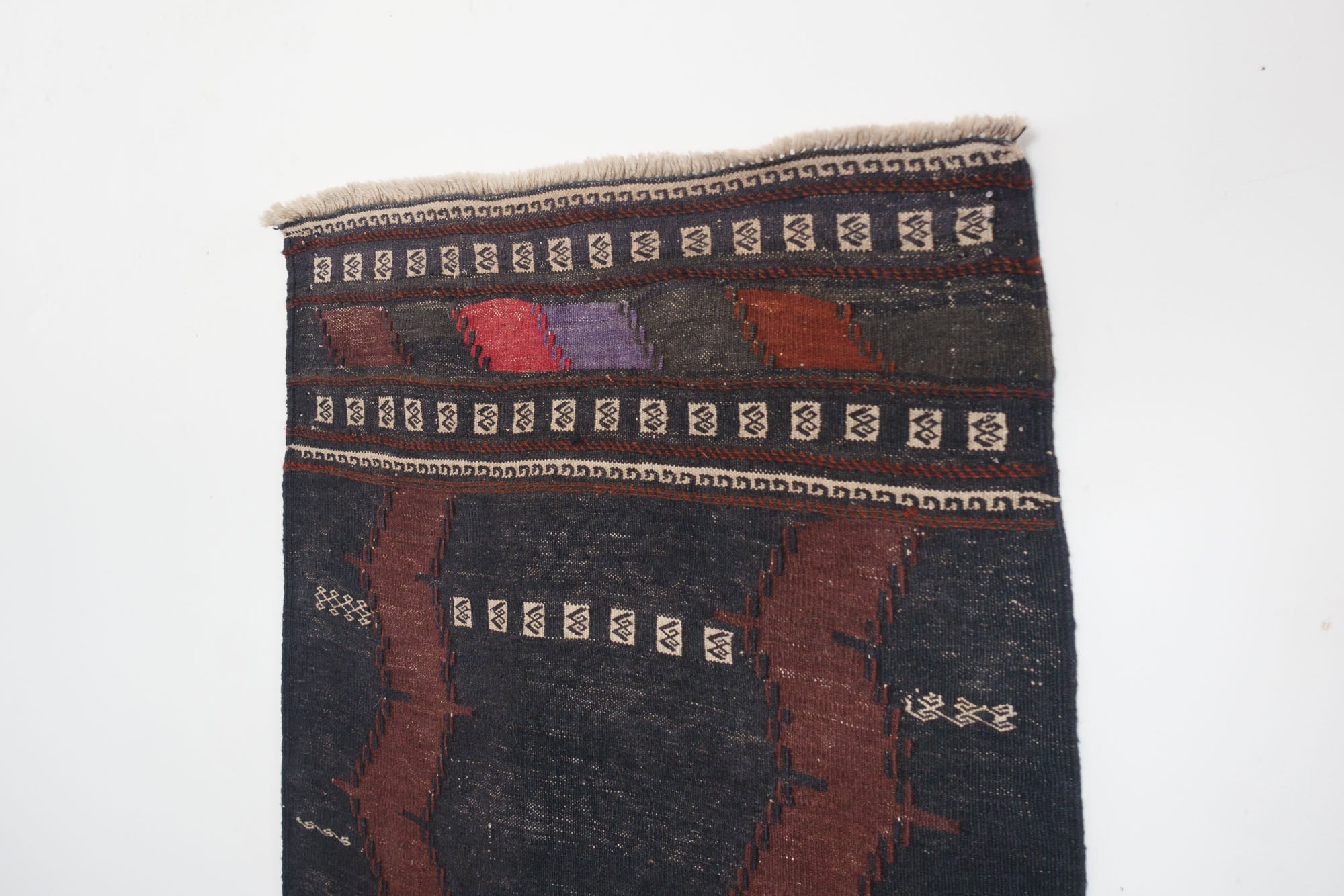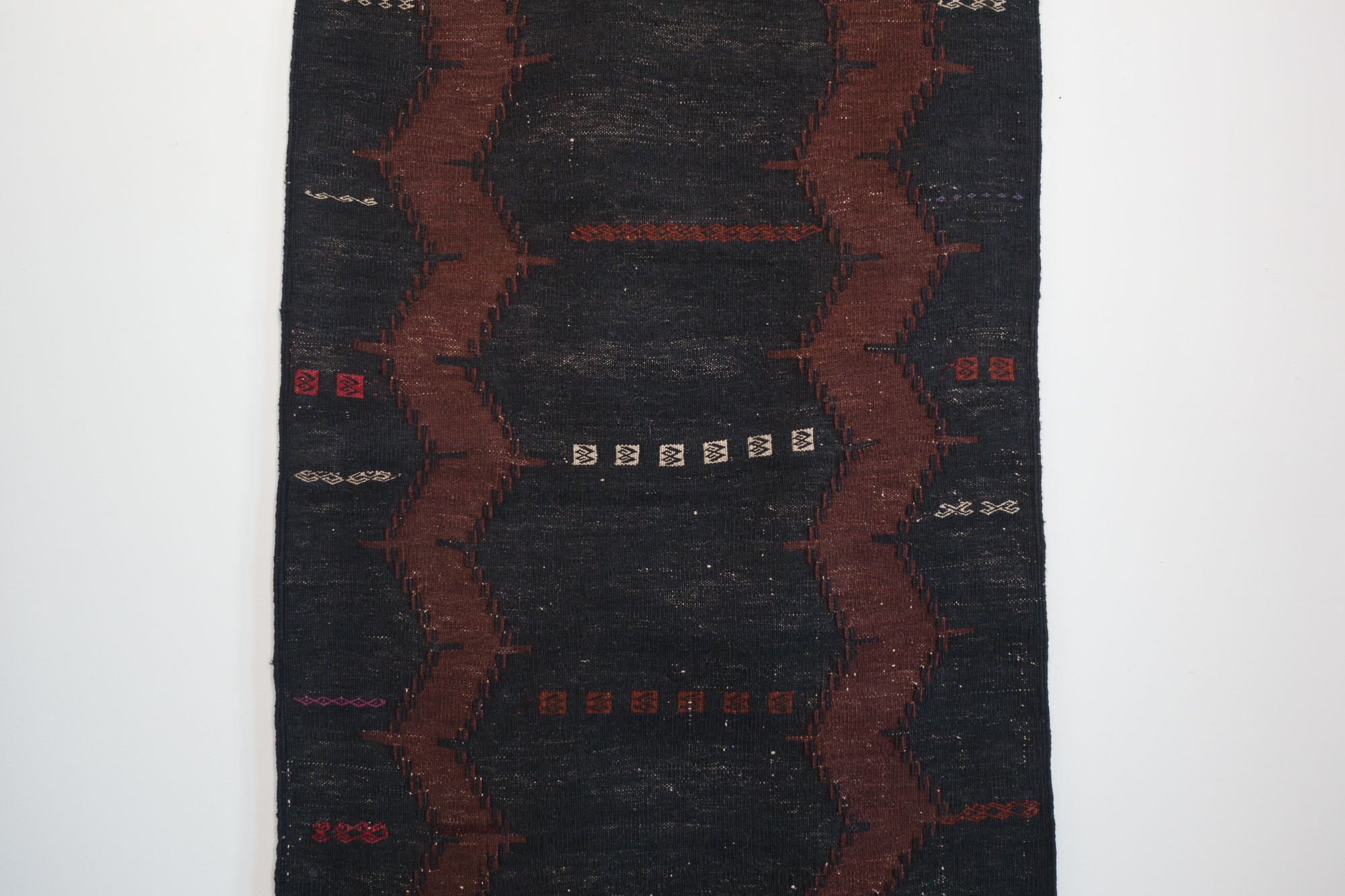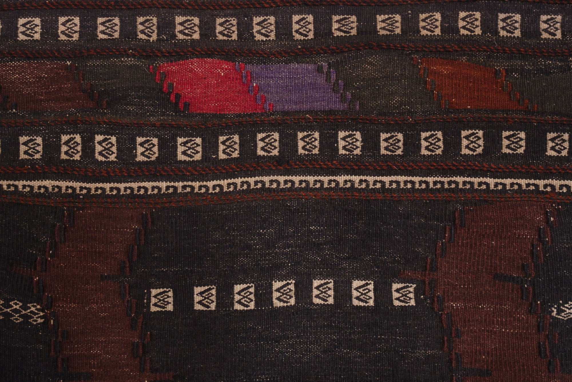 name: Shireenorigin: Afghanistanstyle: shirvan, kilim, rug, carpetmaterial: hand woven woolcolors: brown, black, cream, purple, redage: vintage, 1940-1970condition: good, age related wear - see picturesappraised value: $544sku: a-251