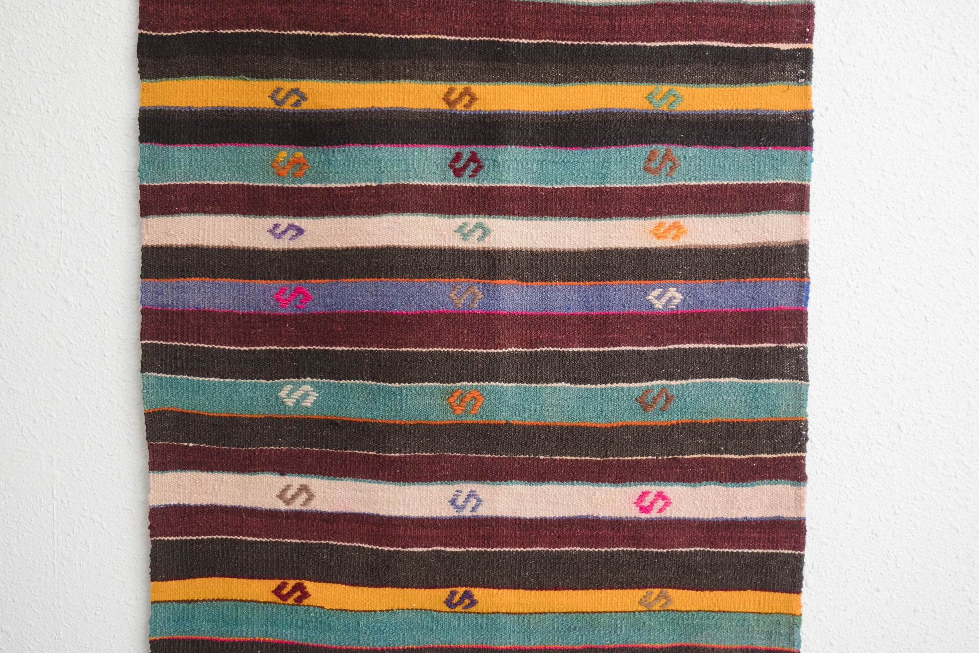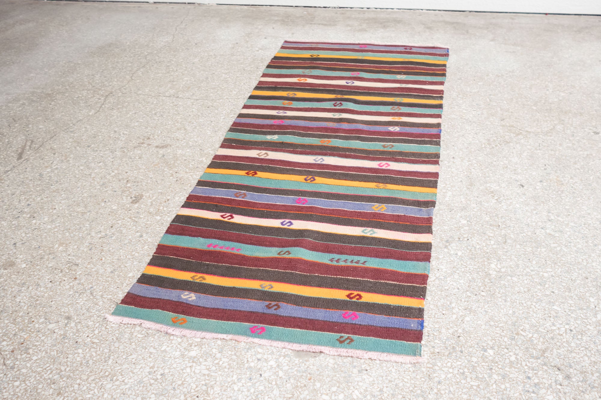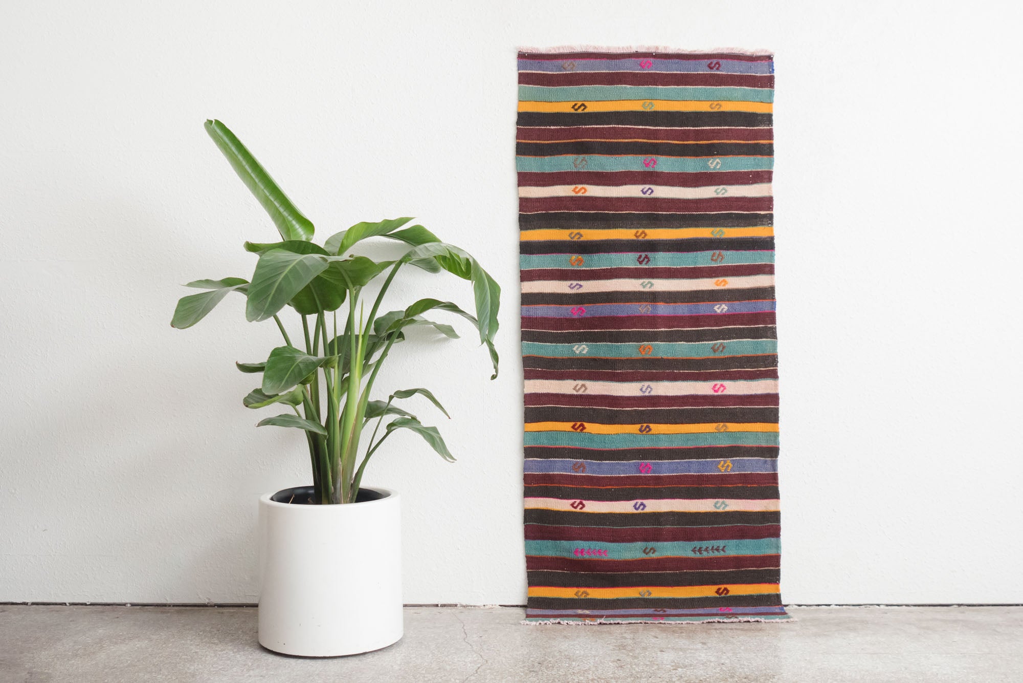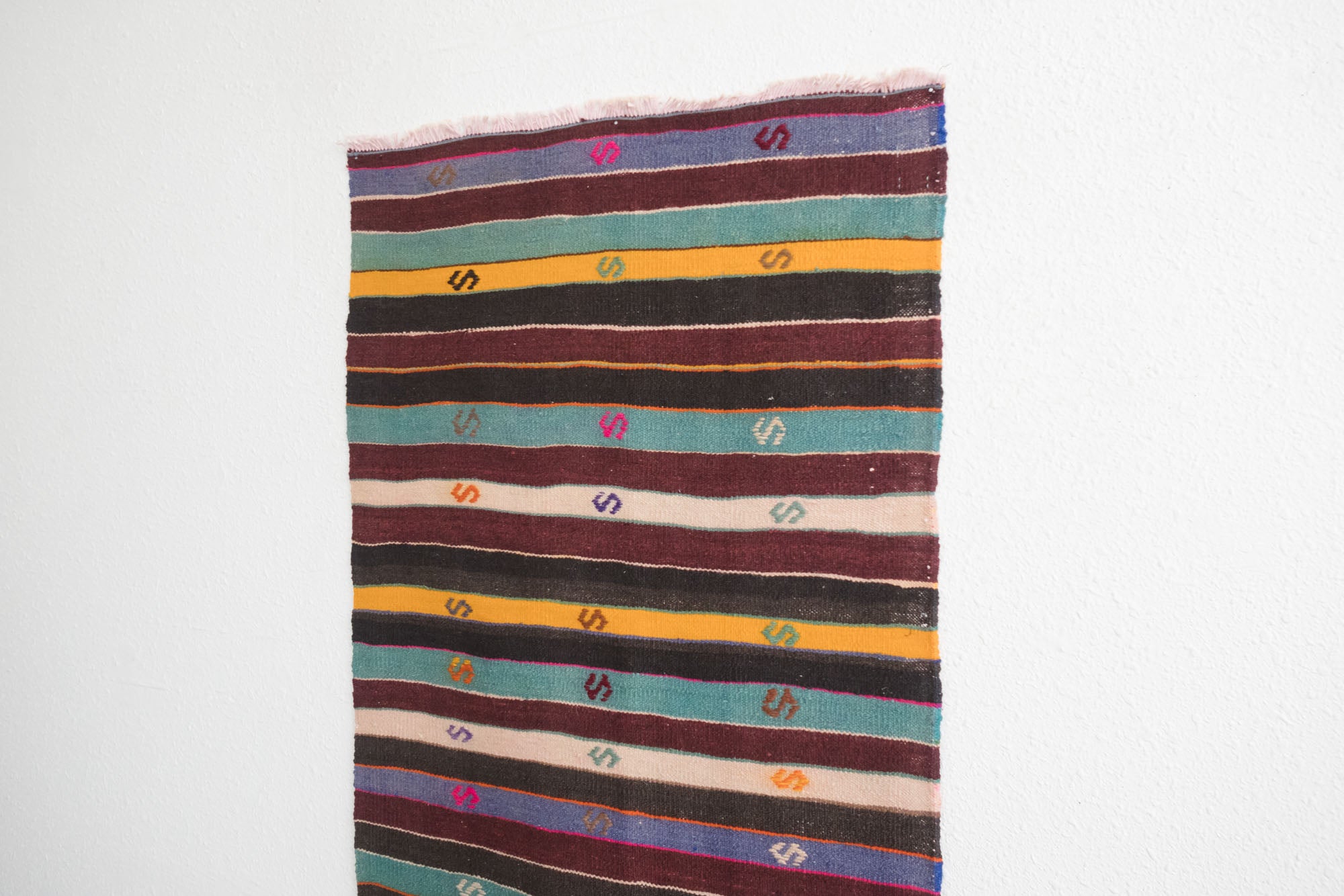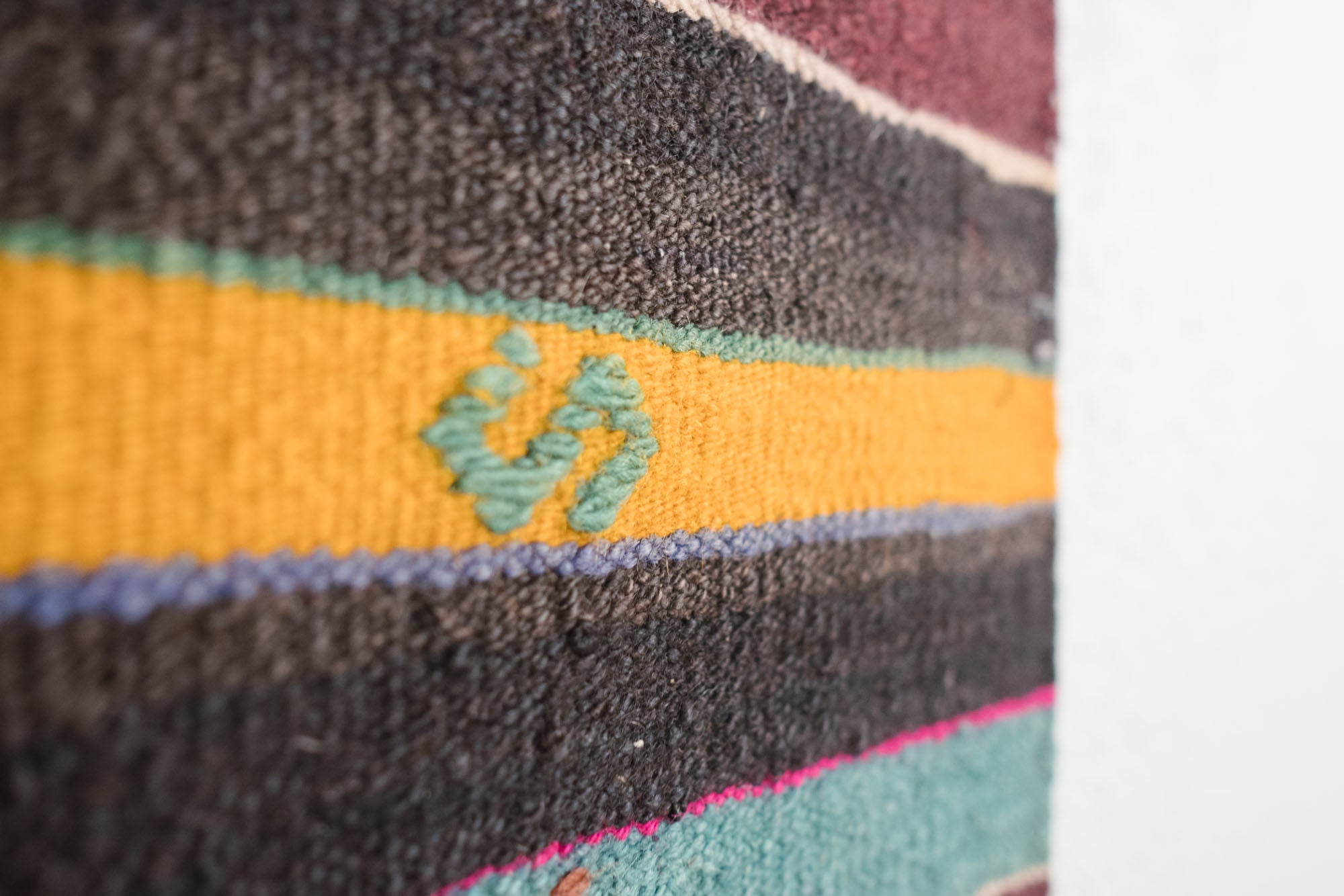 name: Aliyeorigin: Turkeystyle: flat weave, kilim, rug, carpet, flat-weavematerial: hand woven woolcolor: burgundy, yellow, orange, green, blues, cream, black age: vintagecondition: good, age related wear - see pictures