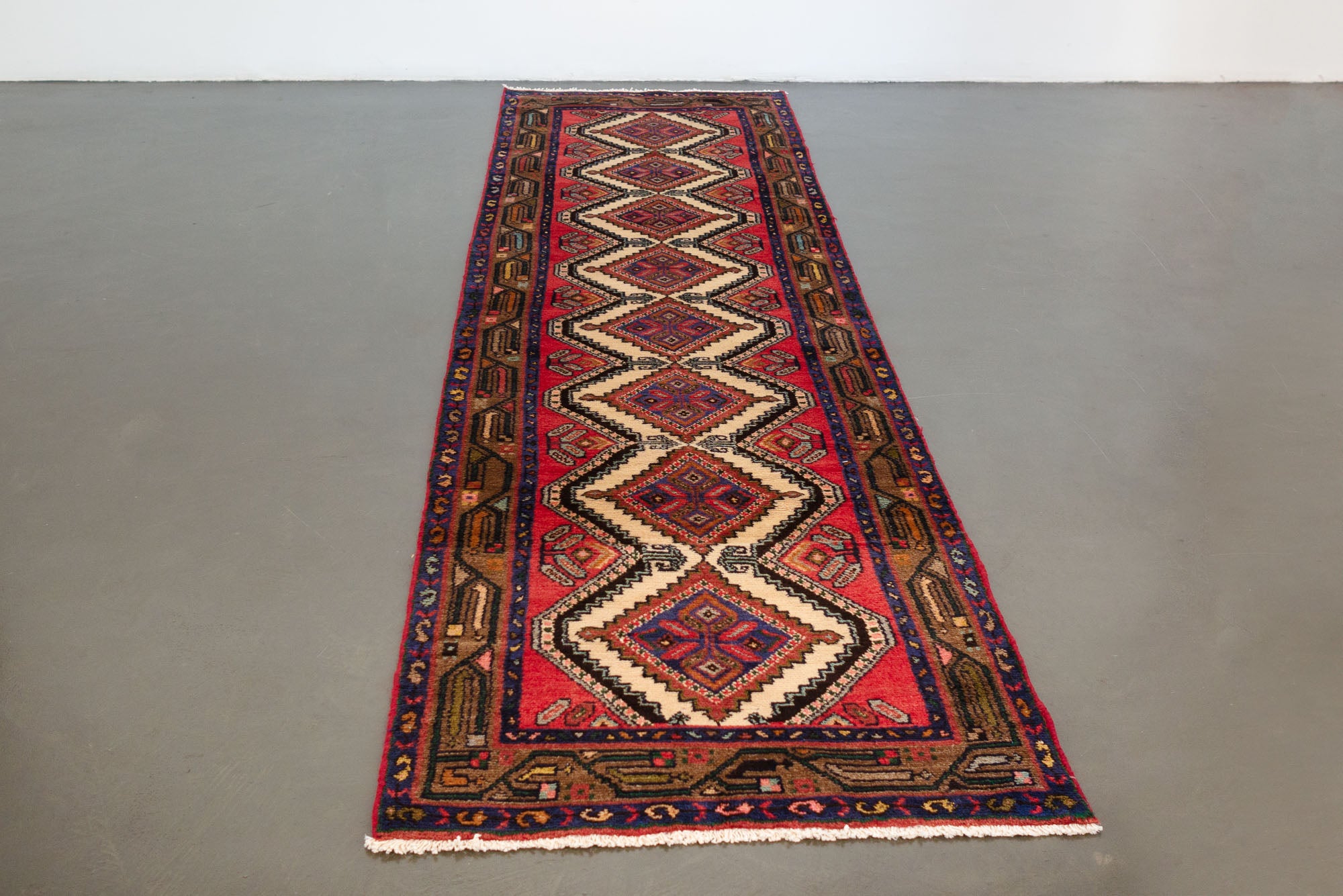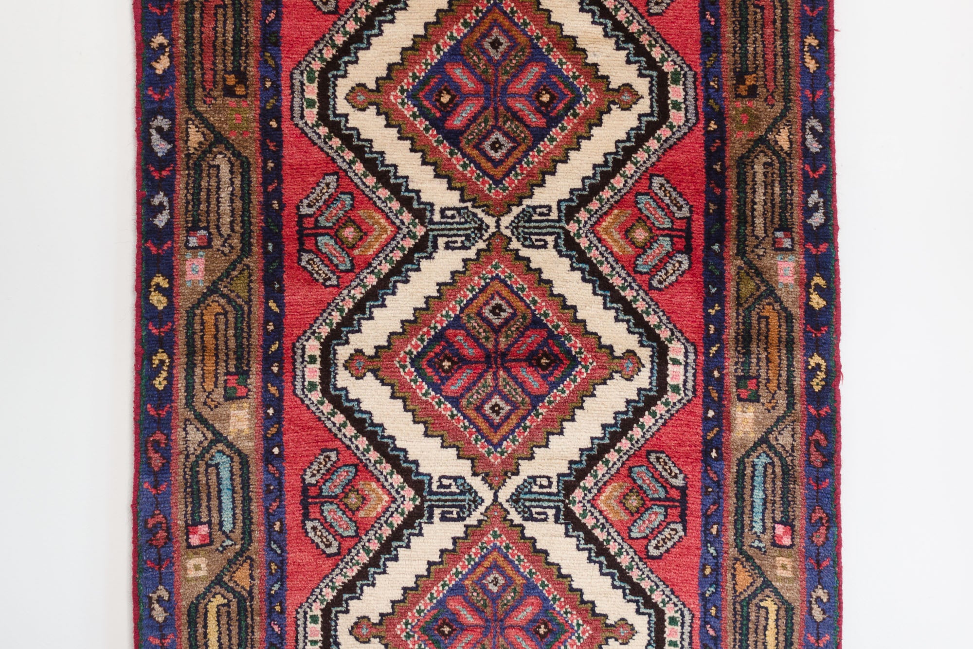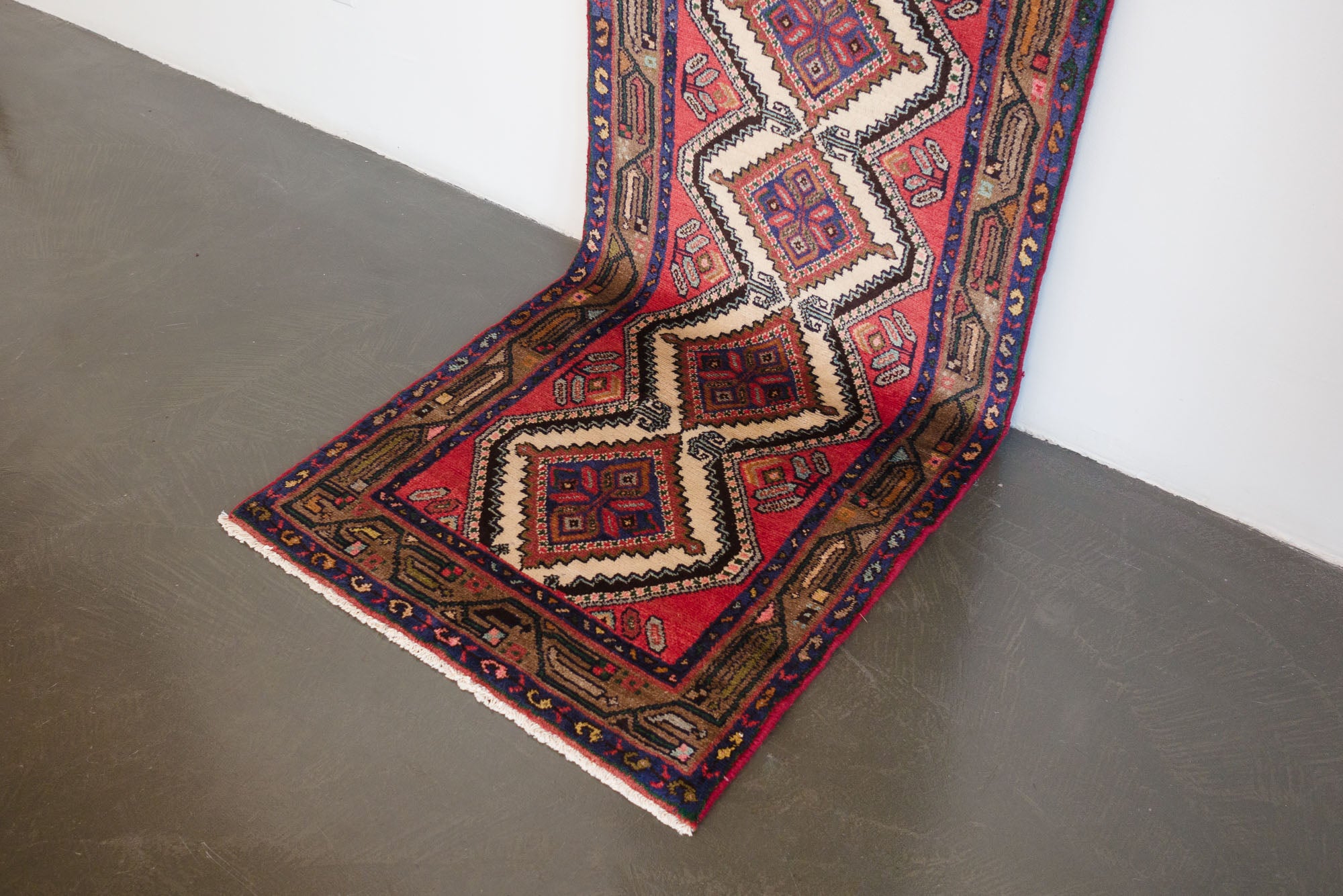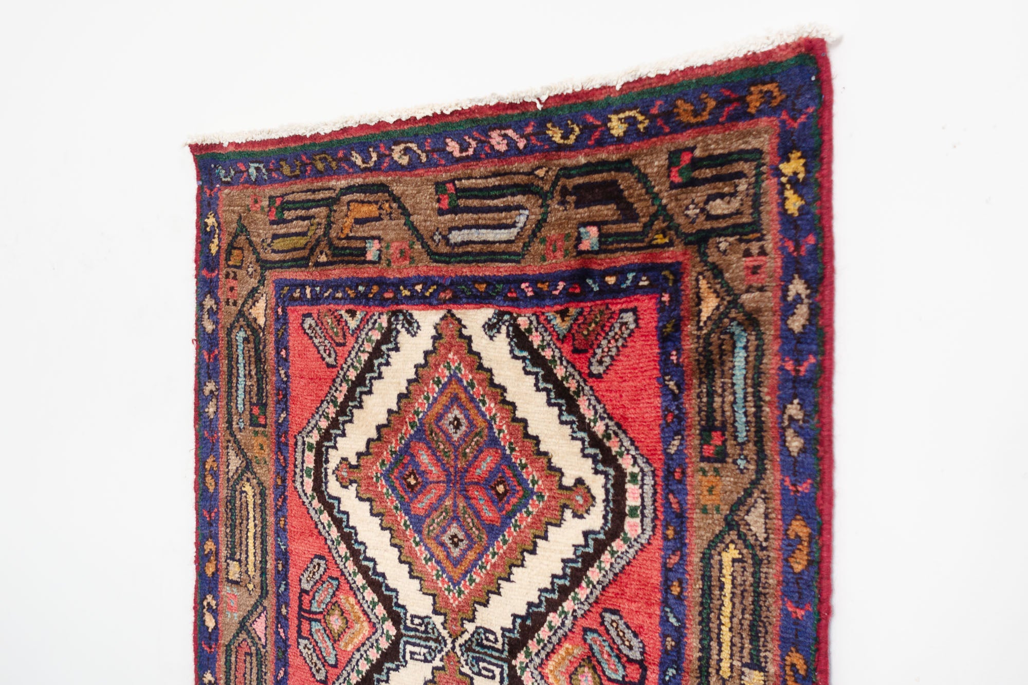 name: Ebrahmorigin: Iran (Persian)style: koliai, rug, carpetmaterial: hand knotted woolcolors: red, blue, navy, black, cream, brown, yellow, greenage: vintage, 1940-1970condition: good, age related wear - see picturesappraised value: $1040sku: p-1119