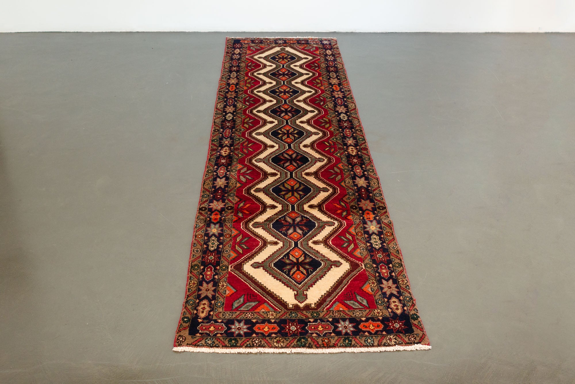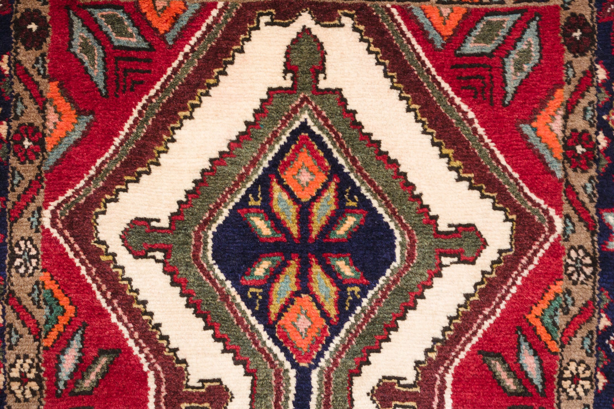 name: Kavehorigin: Iran (Persian)style: koliai, rug, carpetmaterial: hand knotted woolcolors: red, cream, navy, yellow, brown, orange, blue, tanage: vintage, 1940-1970condition: good, age related wear - see picturesappraised value: $1040sku: p-1122