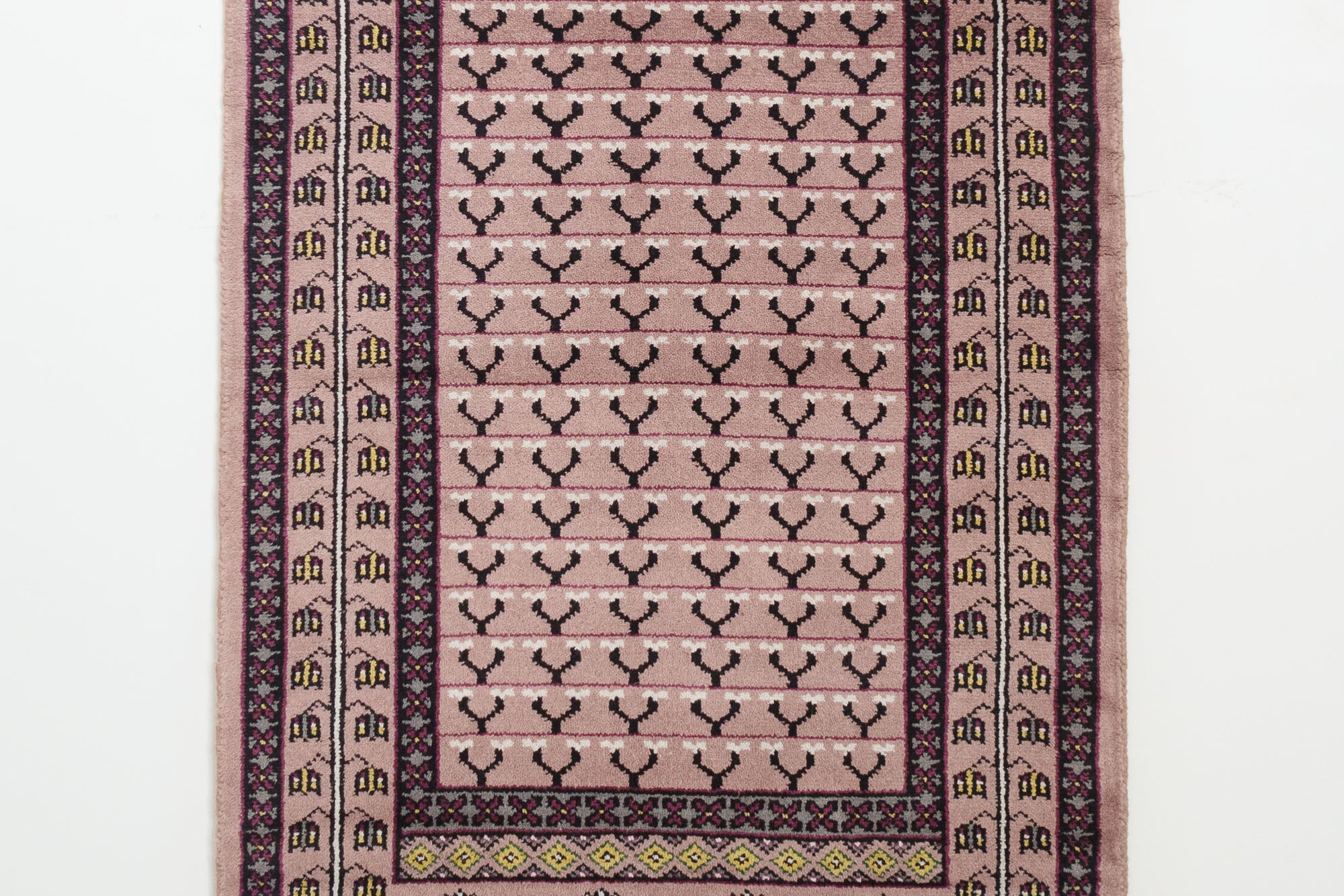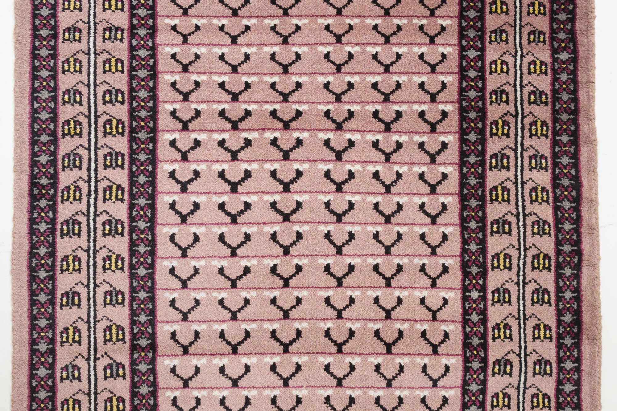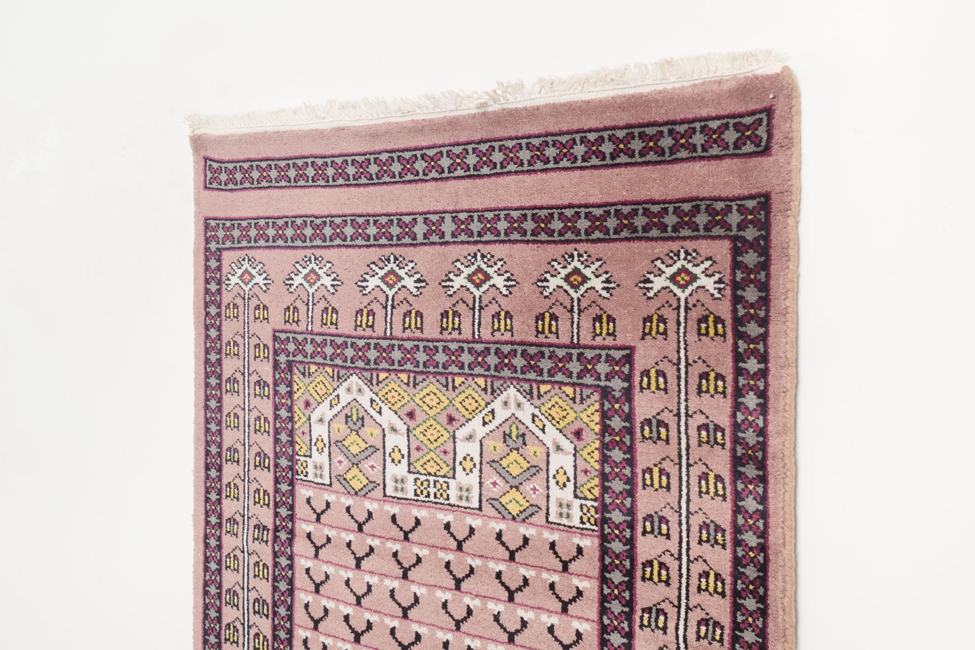 name: Jaavonorigin: Pakistan, Peshawar Bokhara style: runner, rug, carpetmaterial: hand knotted woolcolors: lavender, violet, yellow, gray, black, creamage: vintagecondition: good, age related wear - see picturesappraised value: $932