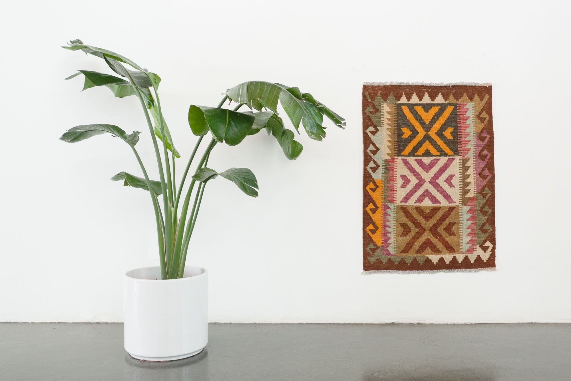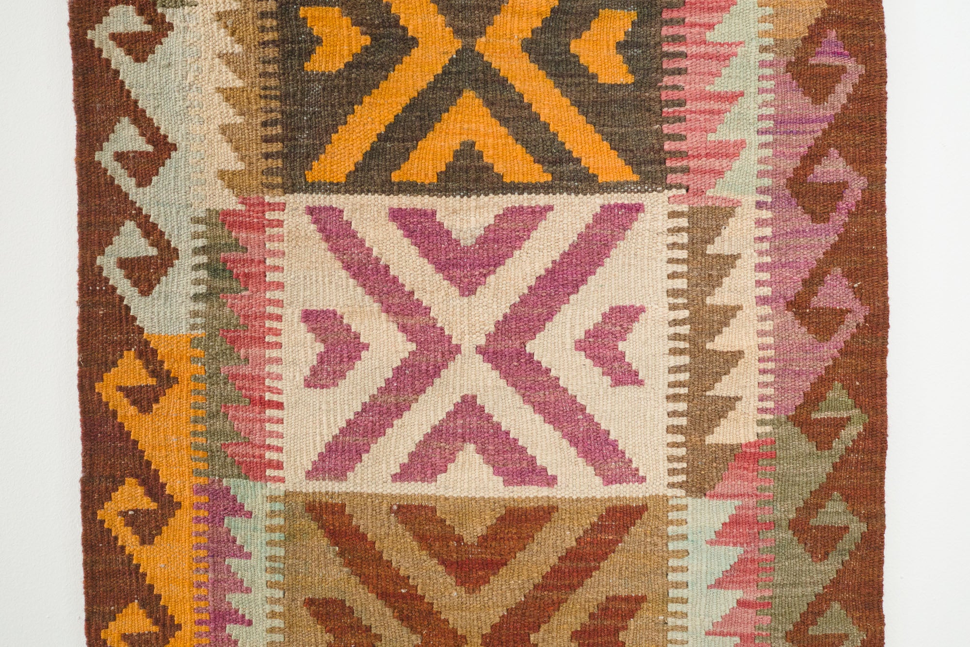 name: Halmanorigin: Turkeystyle: kilim, rug, carpetmaterial: hand woven woolcolors: orange, brown, purple, green, blue, creamage: vintage, 1940-1970condition: good, age related wear - see picturesappraised value: $312sku: t-399