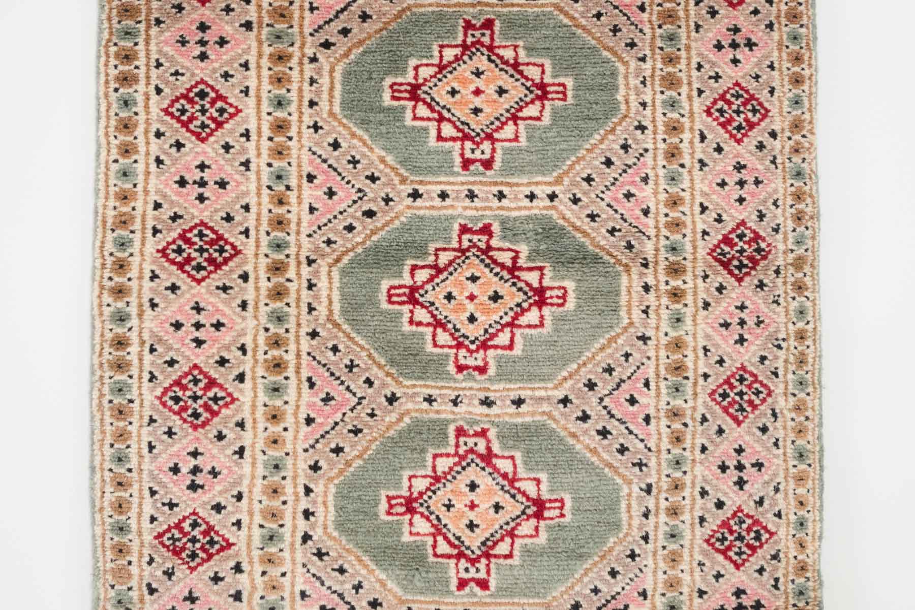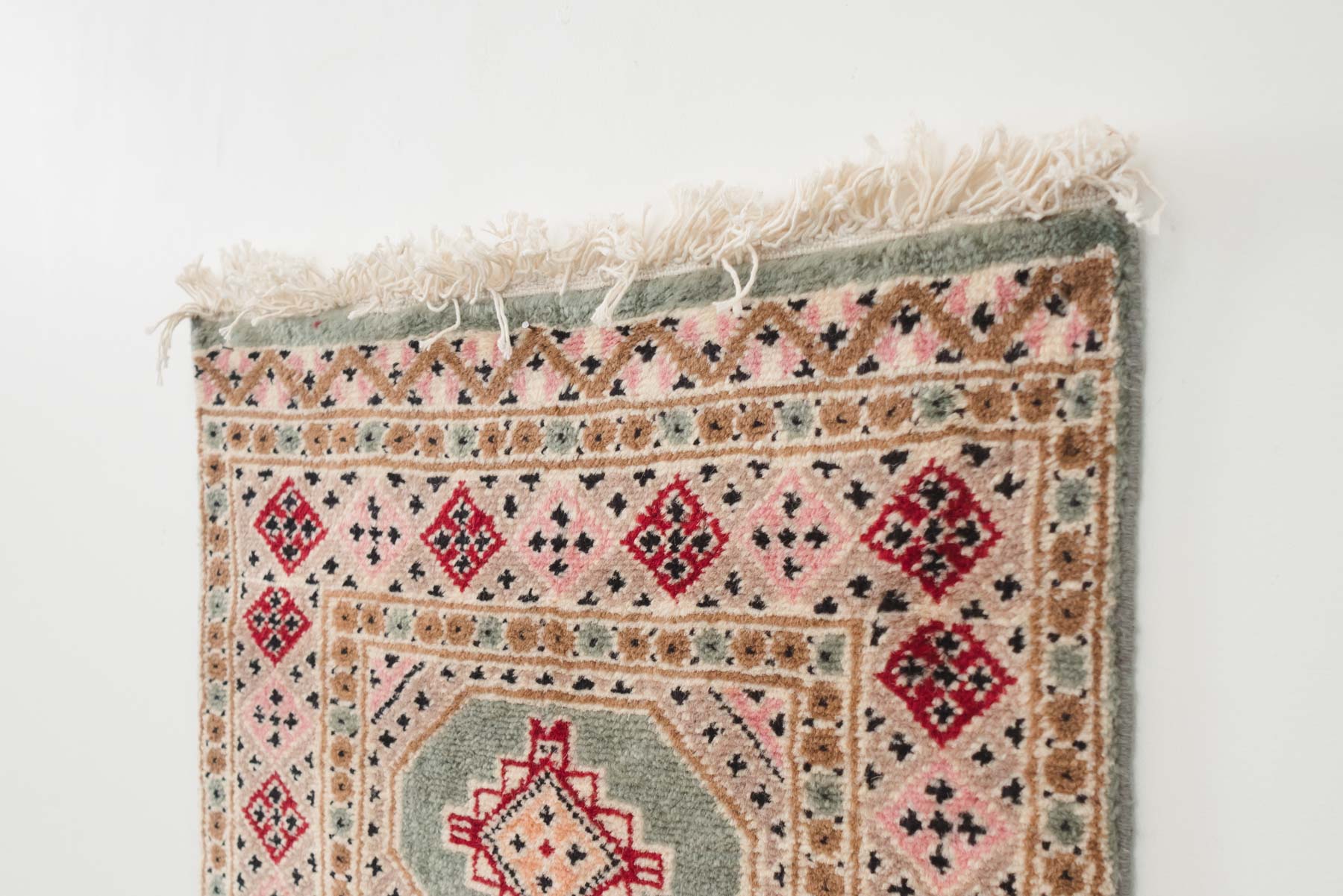 name: Daivik style: hand knotted, Pakistani, Peshawar, Bokhara, rug, carpet material: wool colors: red, pink, orange, tan, sage green age: new condition: good, age related wear - see pictures