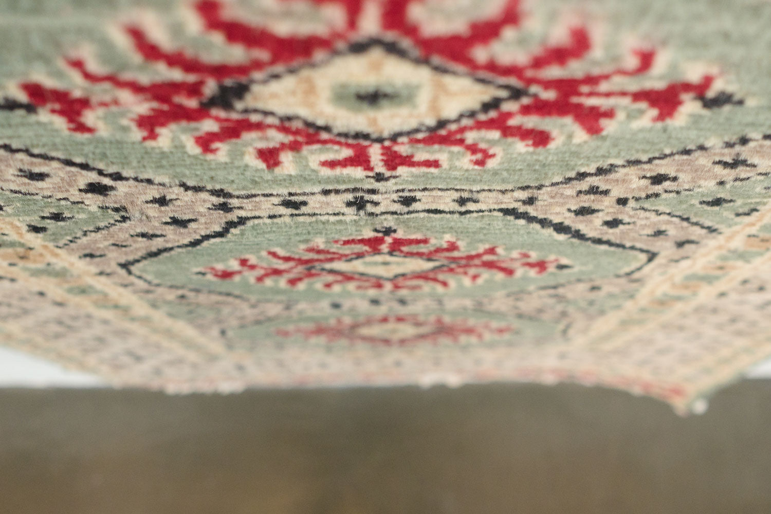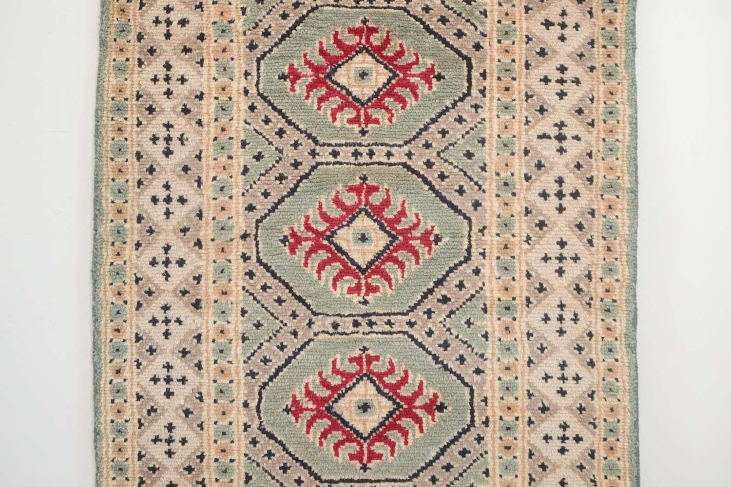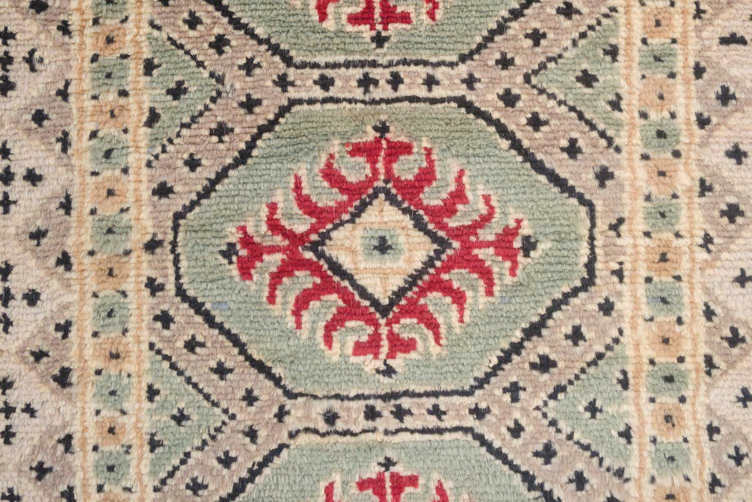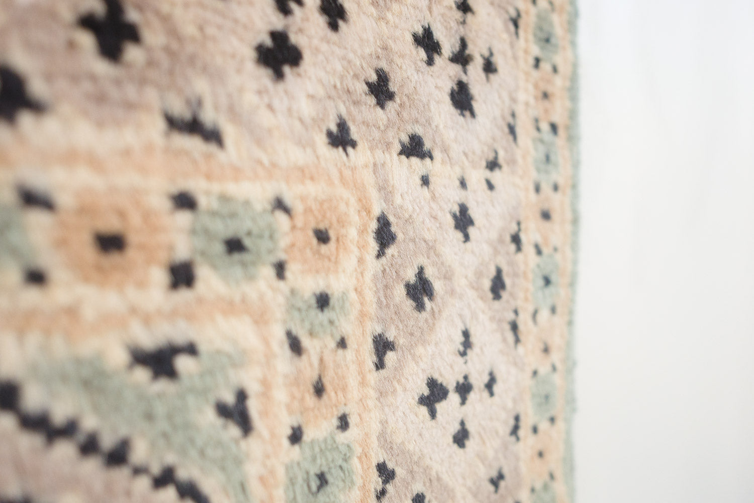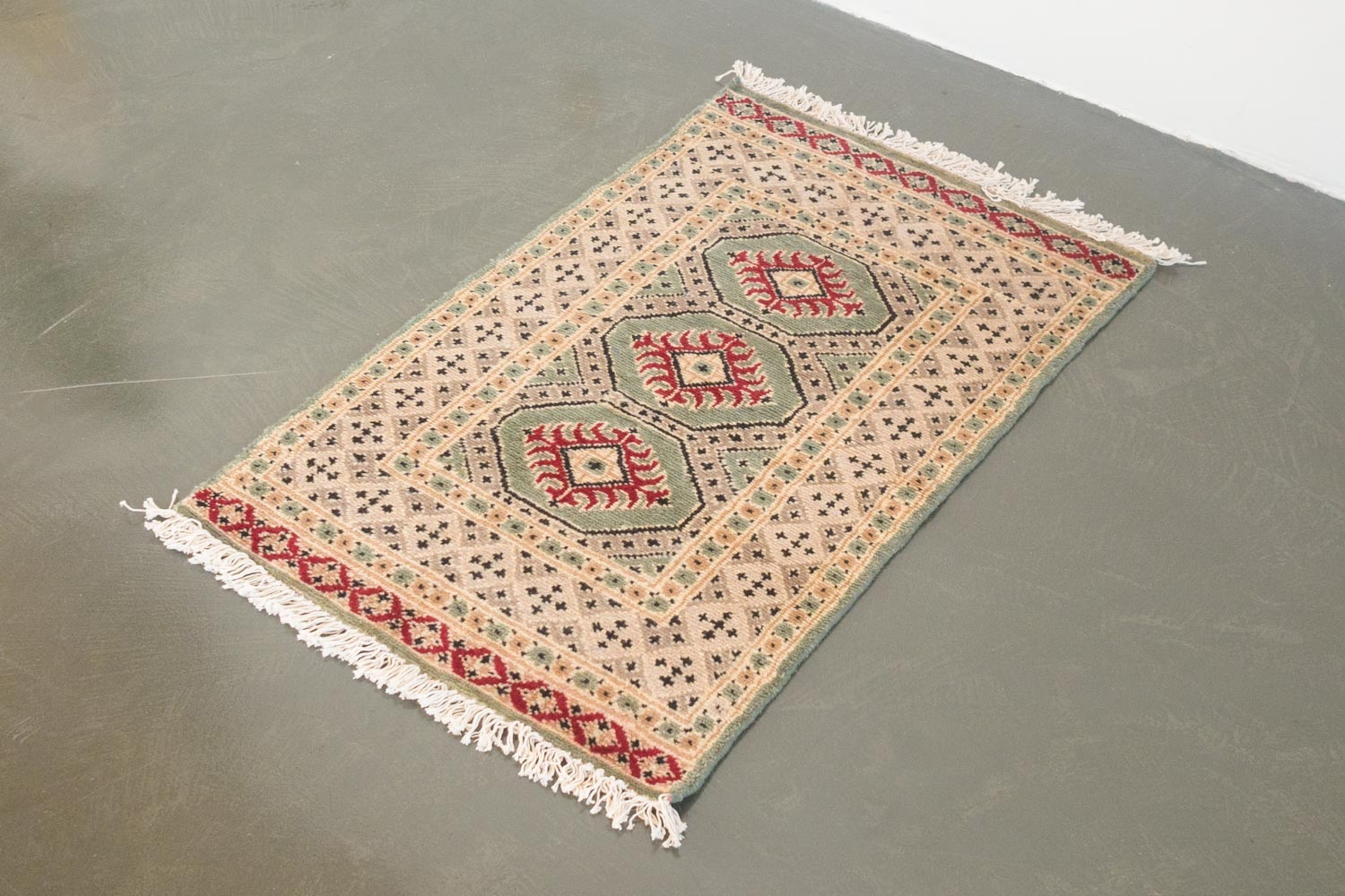 name: Dihyah style: hand knotted, Pakistani, Peshawar, Bokhara, rug, carpet material: wool colors:burgundy, mint, beige, tan black age: vintage condition: good, age related wear - see pictures