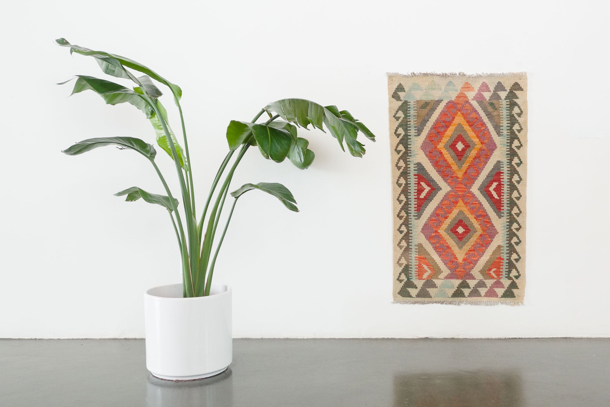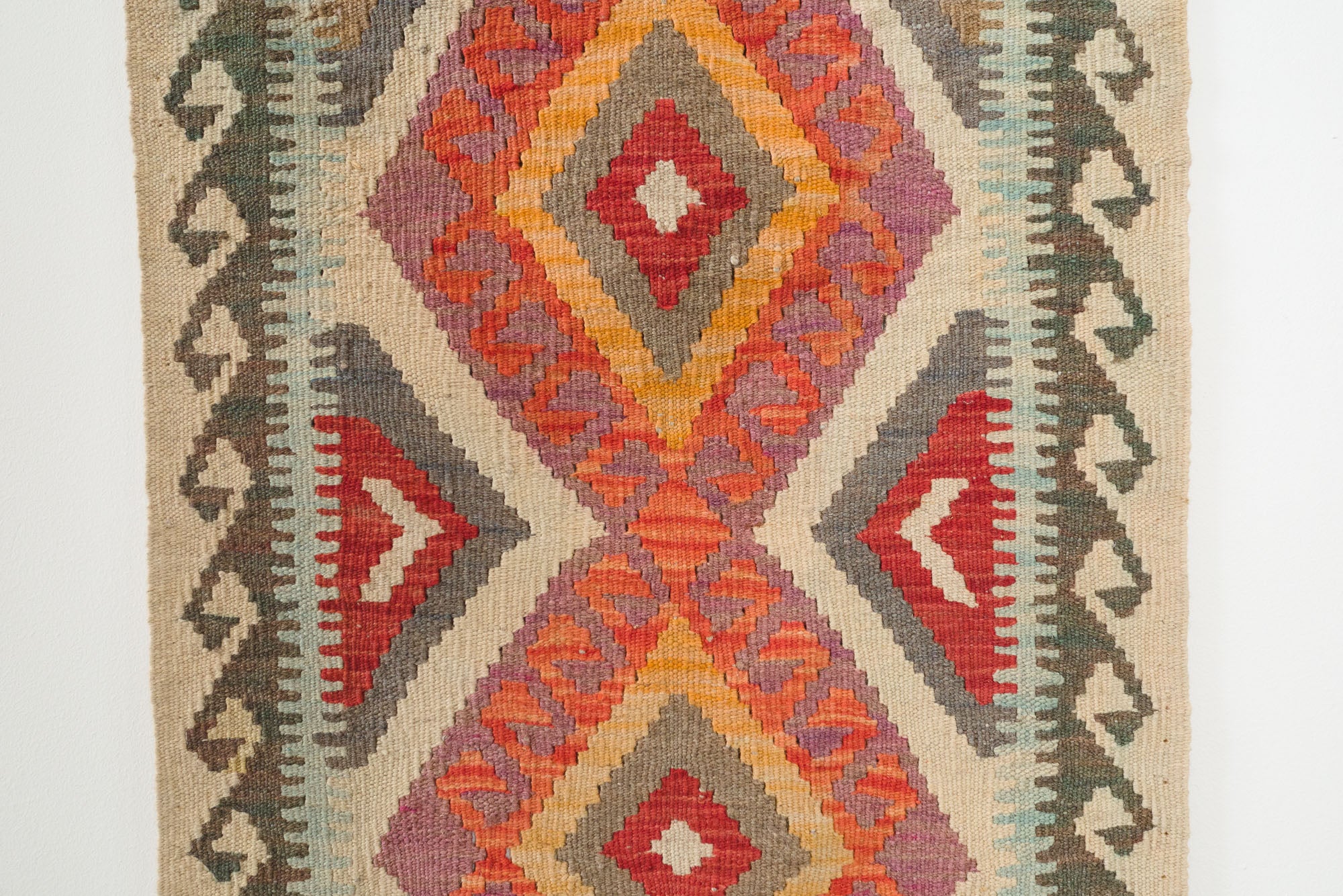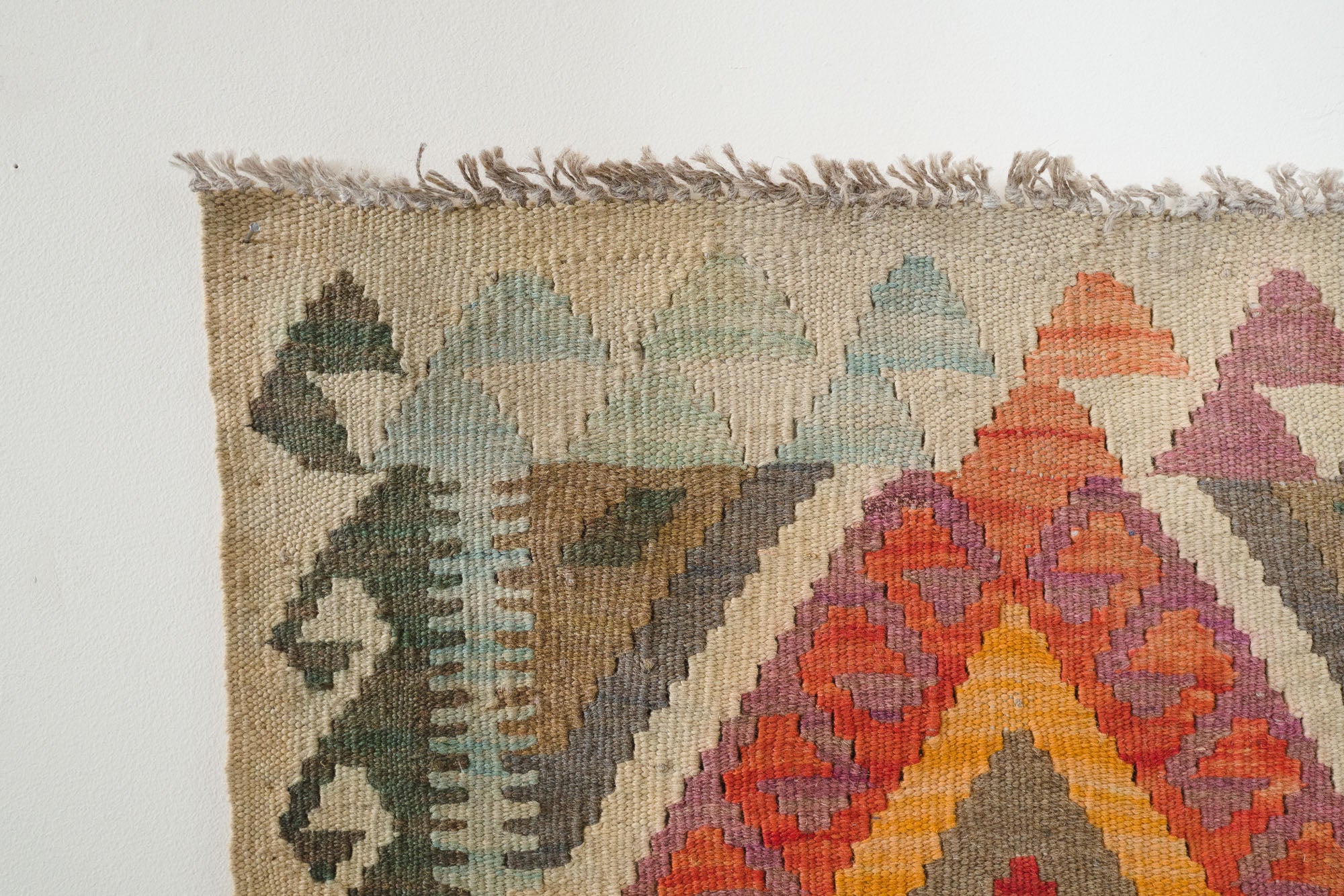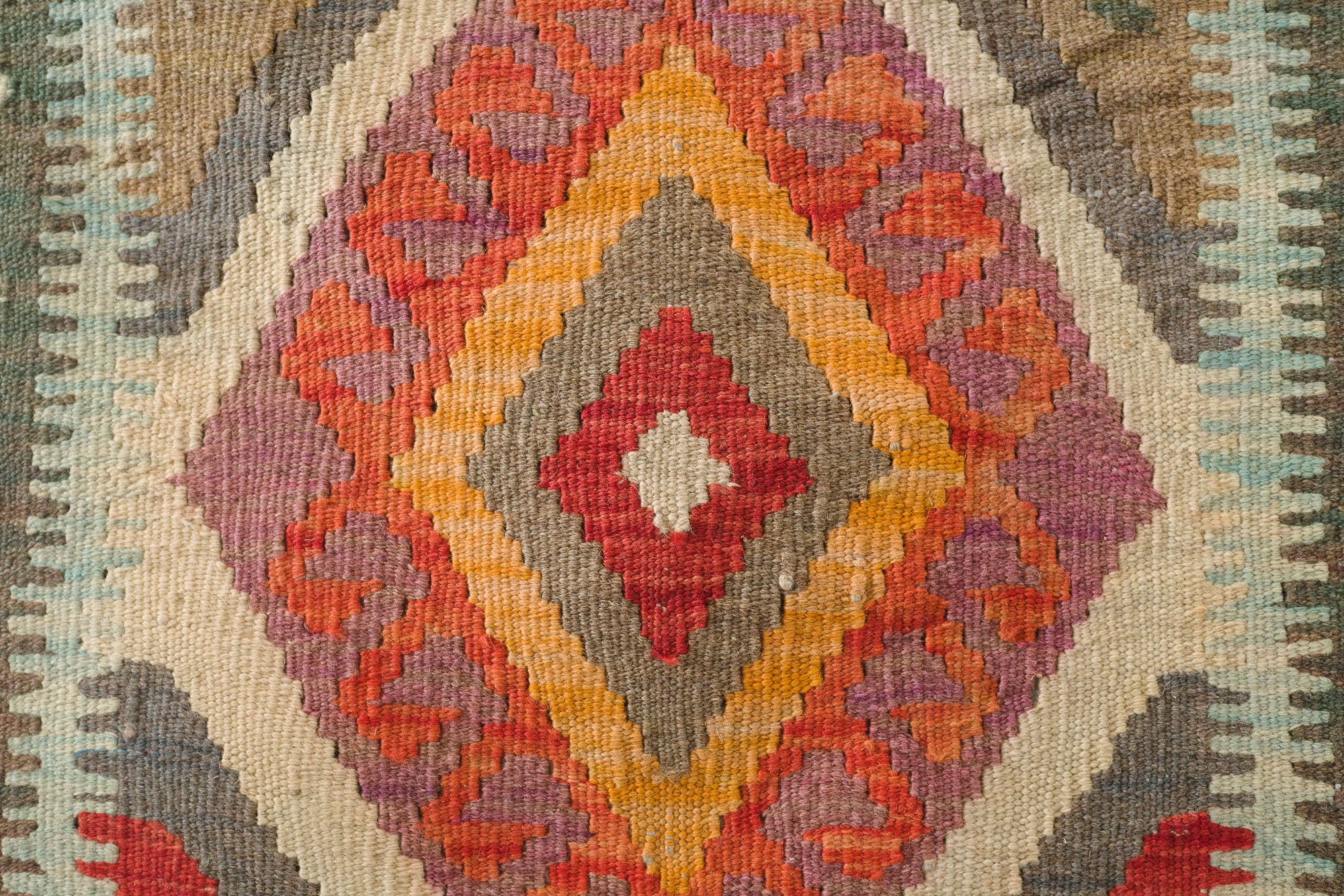 name: Tatliorigin: Turkeystyle: kilim, rug, carpetmaterial: hand woven woolcolors: red, orange, purple, cream, tan, gray, greenage: vintage, 1940-1970condition: good, age related wear - see picturesappraised value: $336sku: t-404
