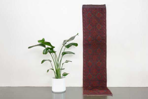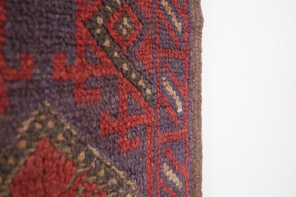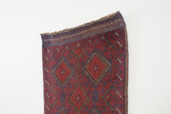 name: Baddarorigin: Afghanistan, Tajikstyle: rug, runner, carpetmaterial: hand knotted woolcolors: red, navy, camel, purpleage: vintagecondition: good, age related wear - see picturesappraised value: $640
