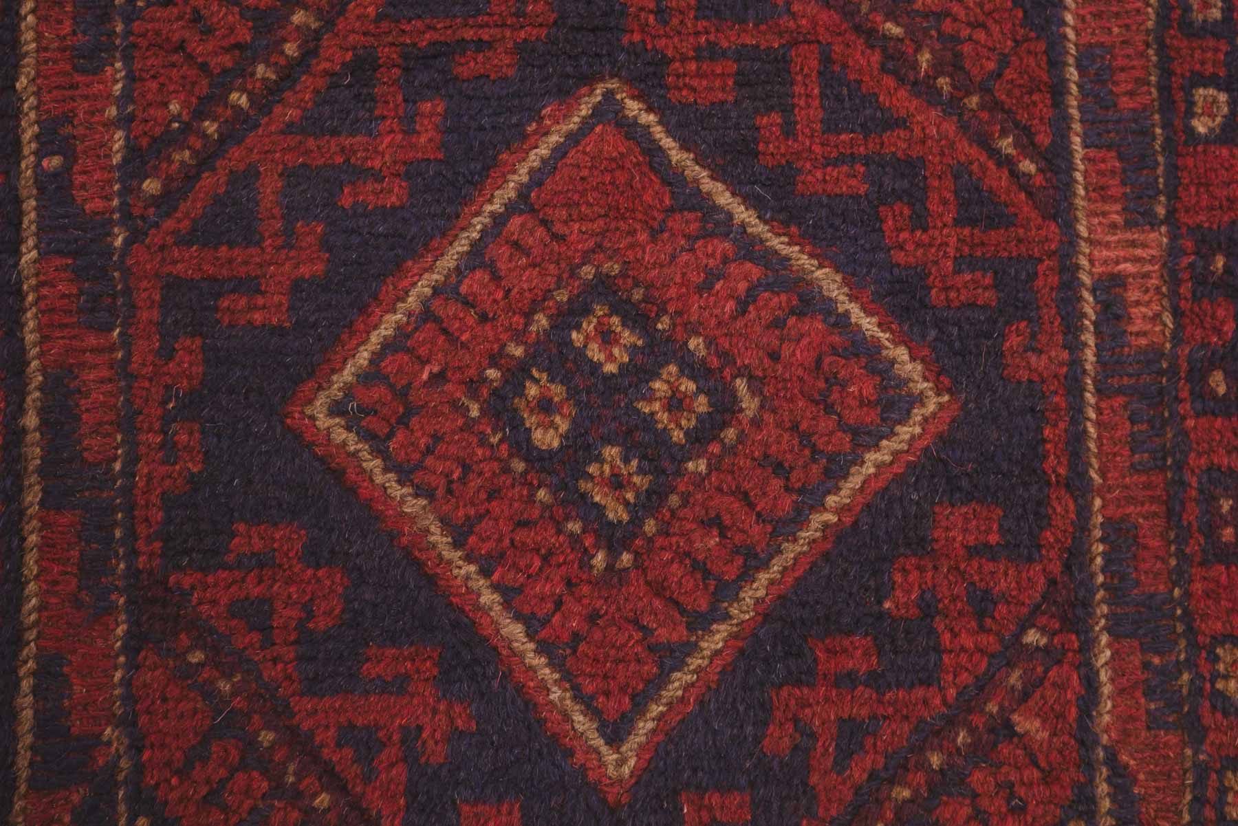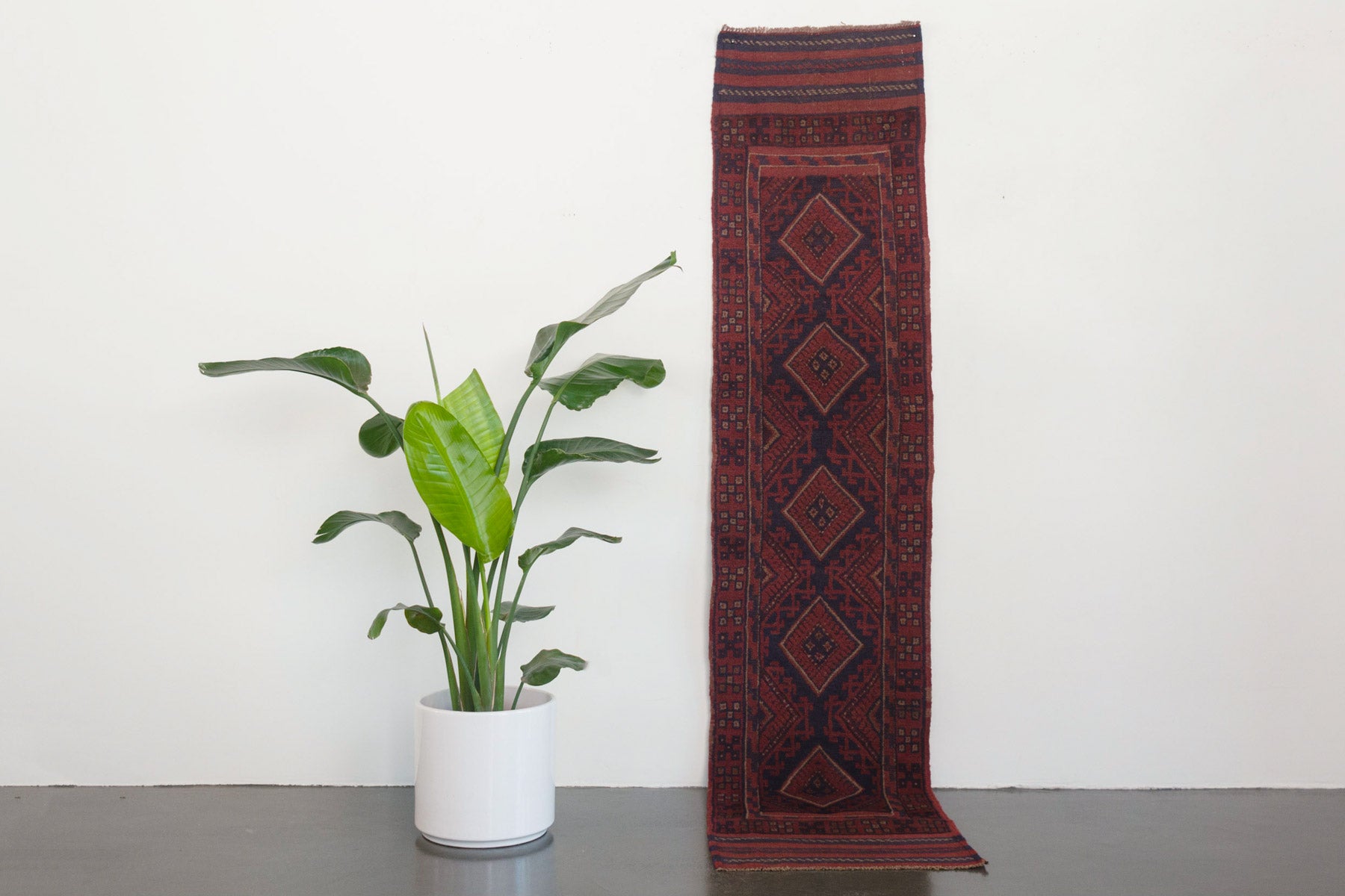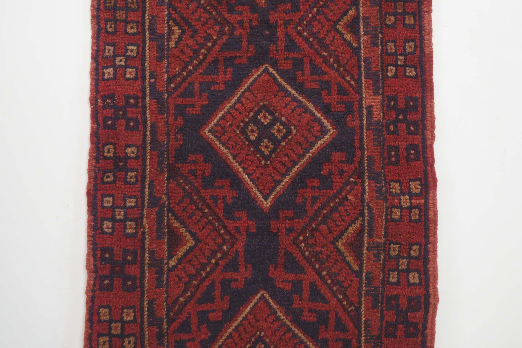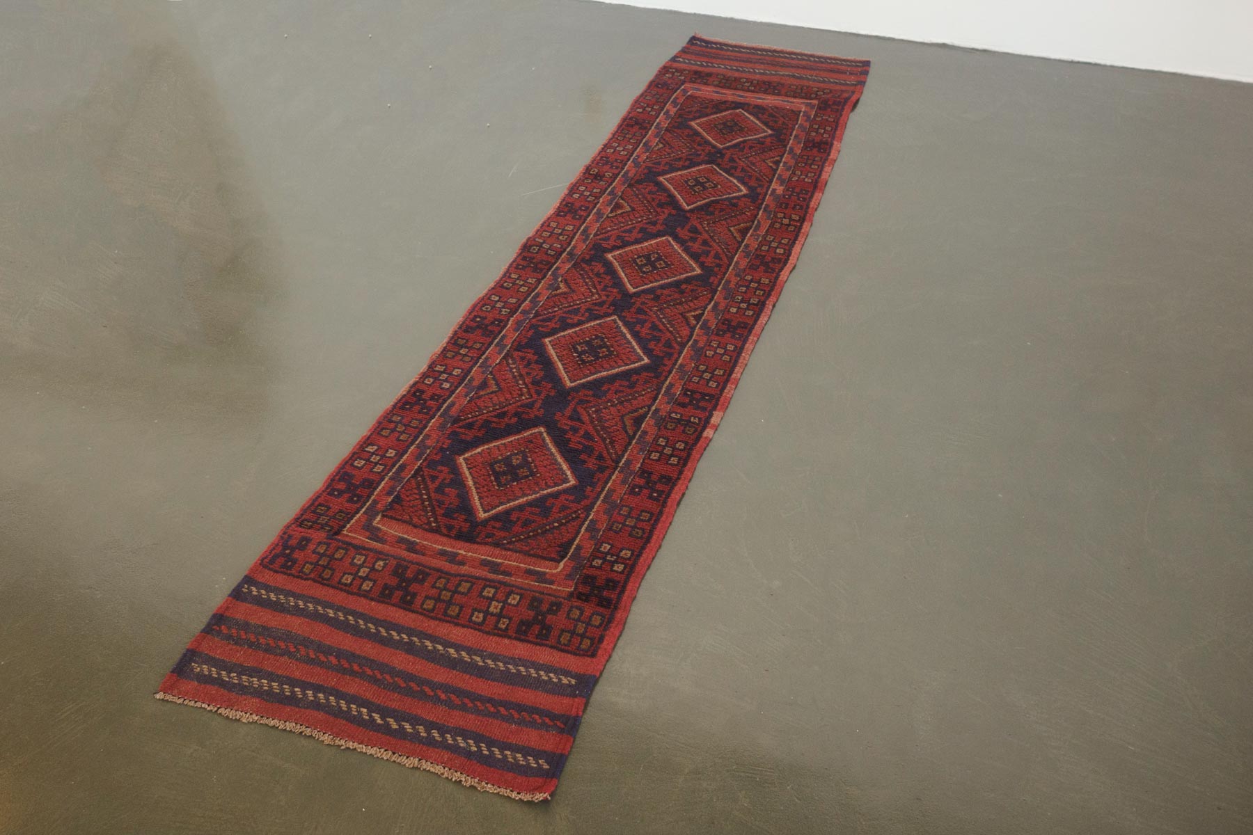 name: Mohambarstyle: hand knotted, Afghan, Tajik, rug, runner, carpetmaterial: woolcolors: red, oxblood, navy, tanage: vintage condition: good, age related wear - see pictures