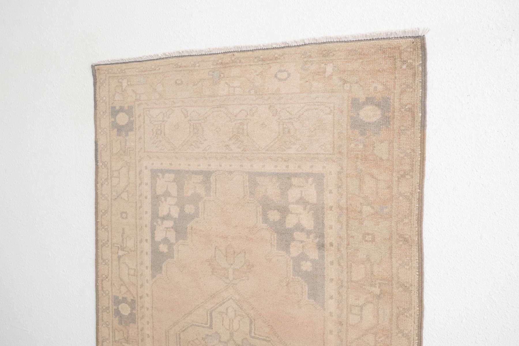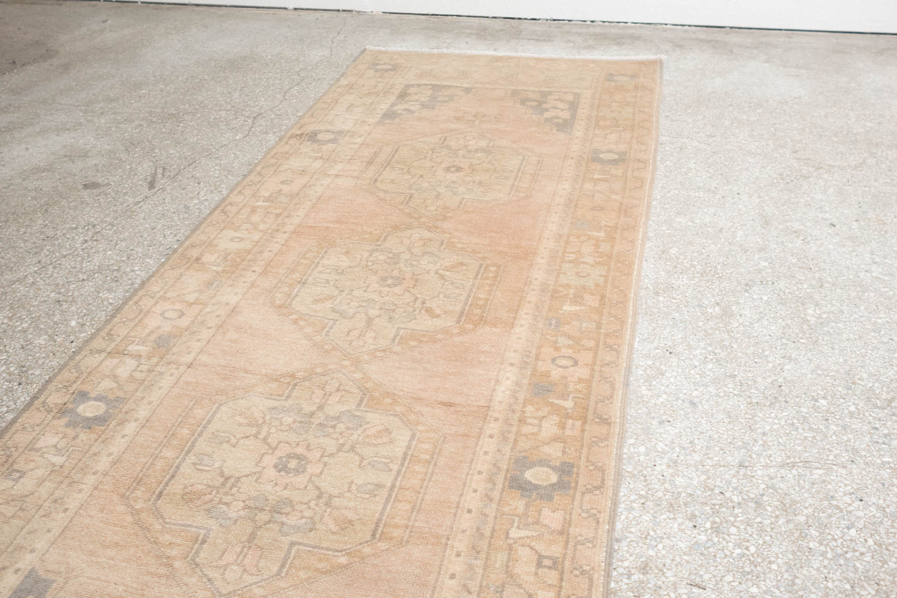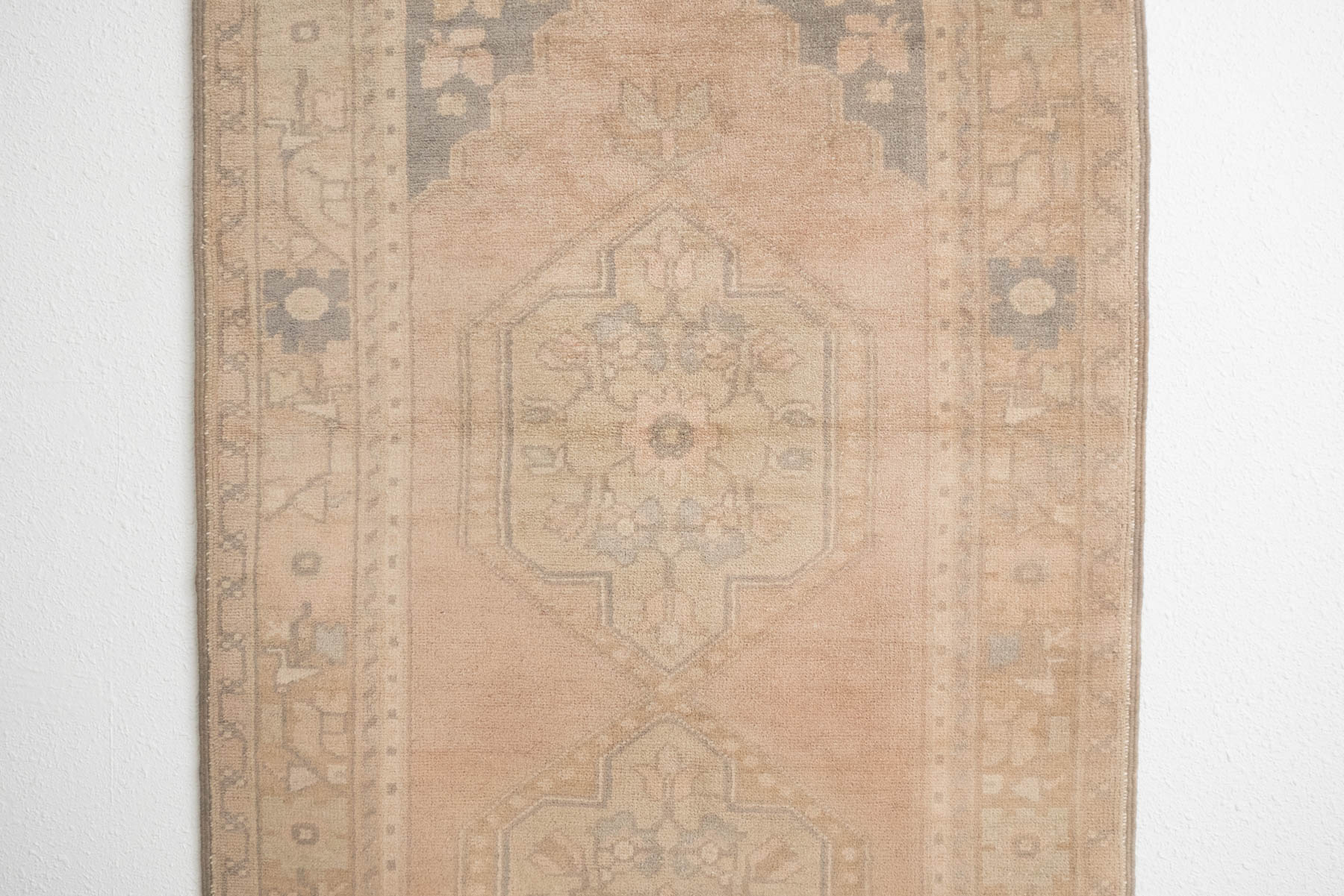 name: Devrimstyle: hand knotted, Turkish, sunwashed, rug, runner, carpetmaterial: woolcolors: pink, gray, mint, tan, camel, creamage: vintage condition: good, age related wear - see pictures