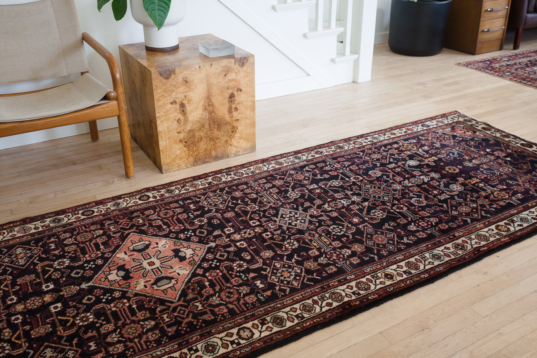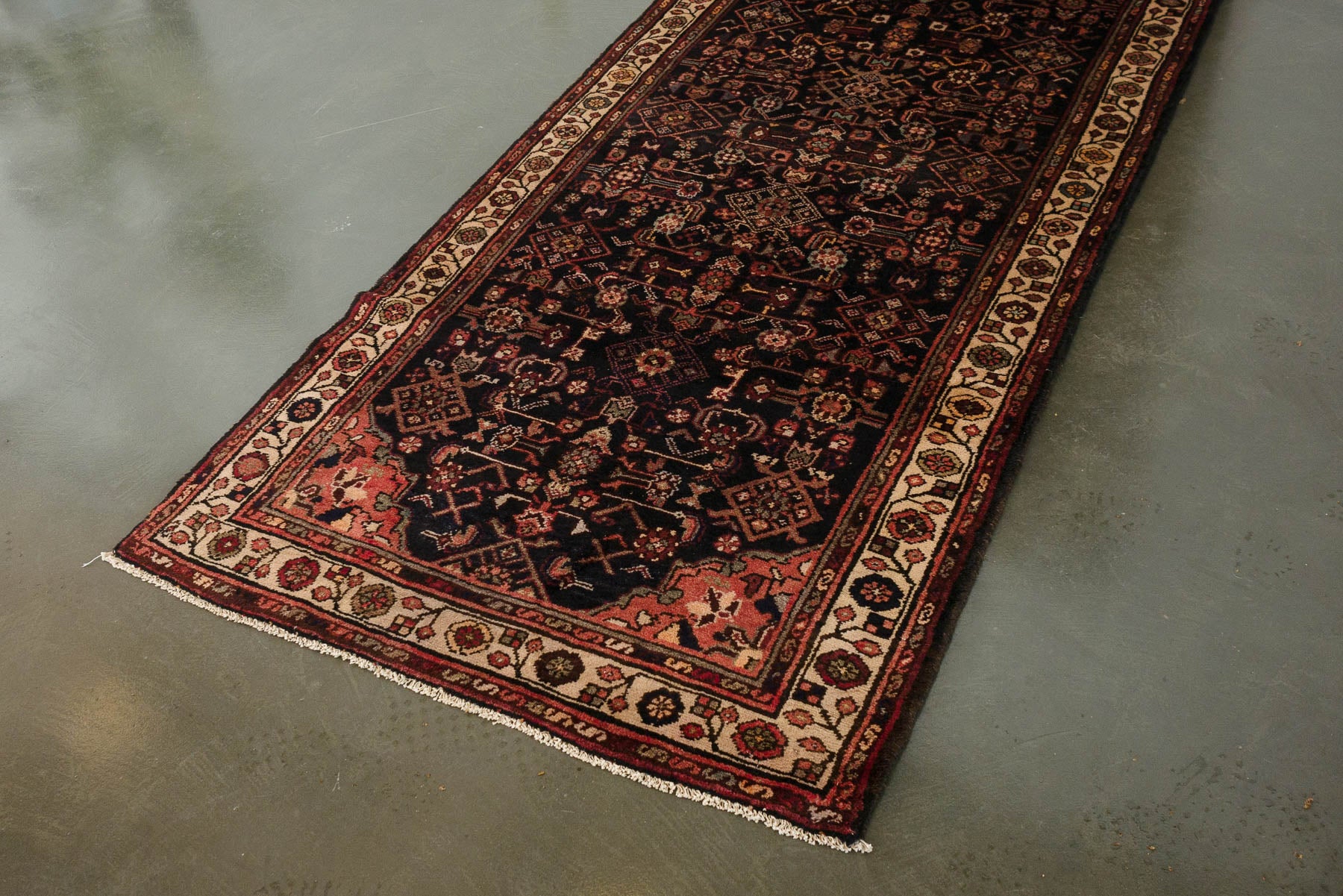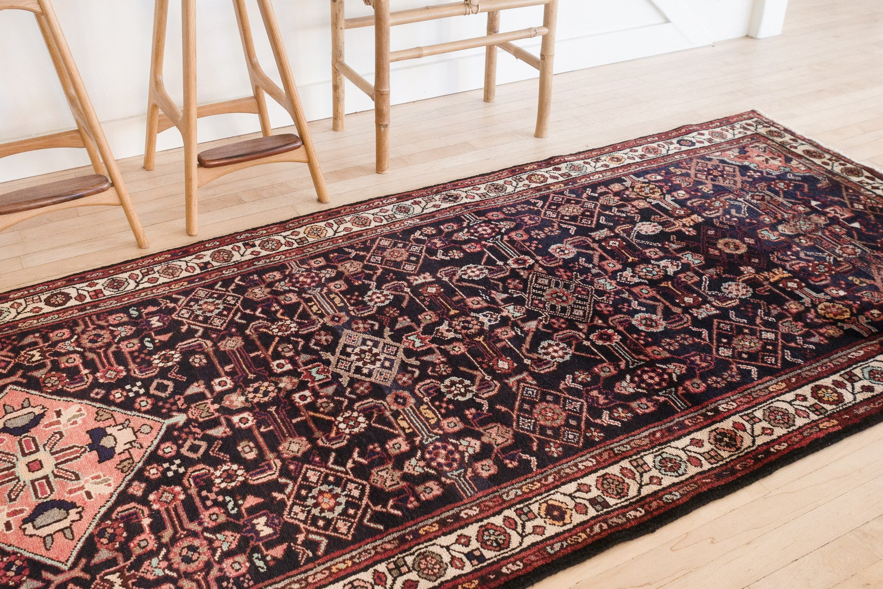 name: Roshakorigin: Iran (Persian)style: rug, runner, carpet material: hand knotted woolcolors: black, reds, pink, green, camel, creamage: vintage condition: good, age related wear - see pictures42" x 164" (closest standard rug size is 3.5x14)Free domestic shipping on all rugs.Contact us for an international shipping quote.