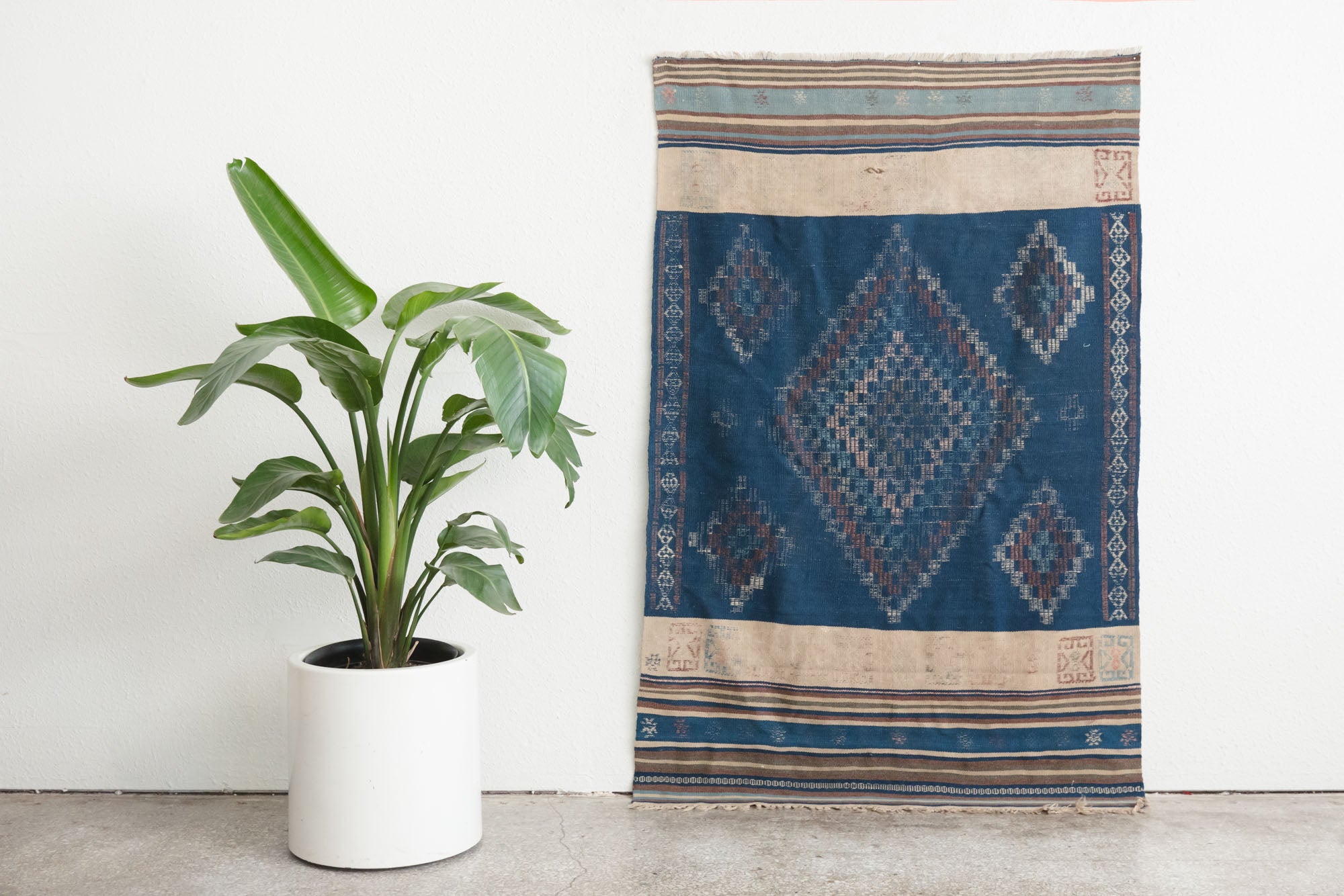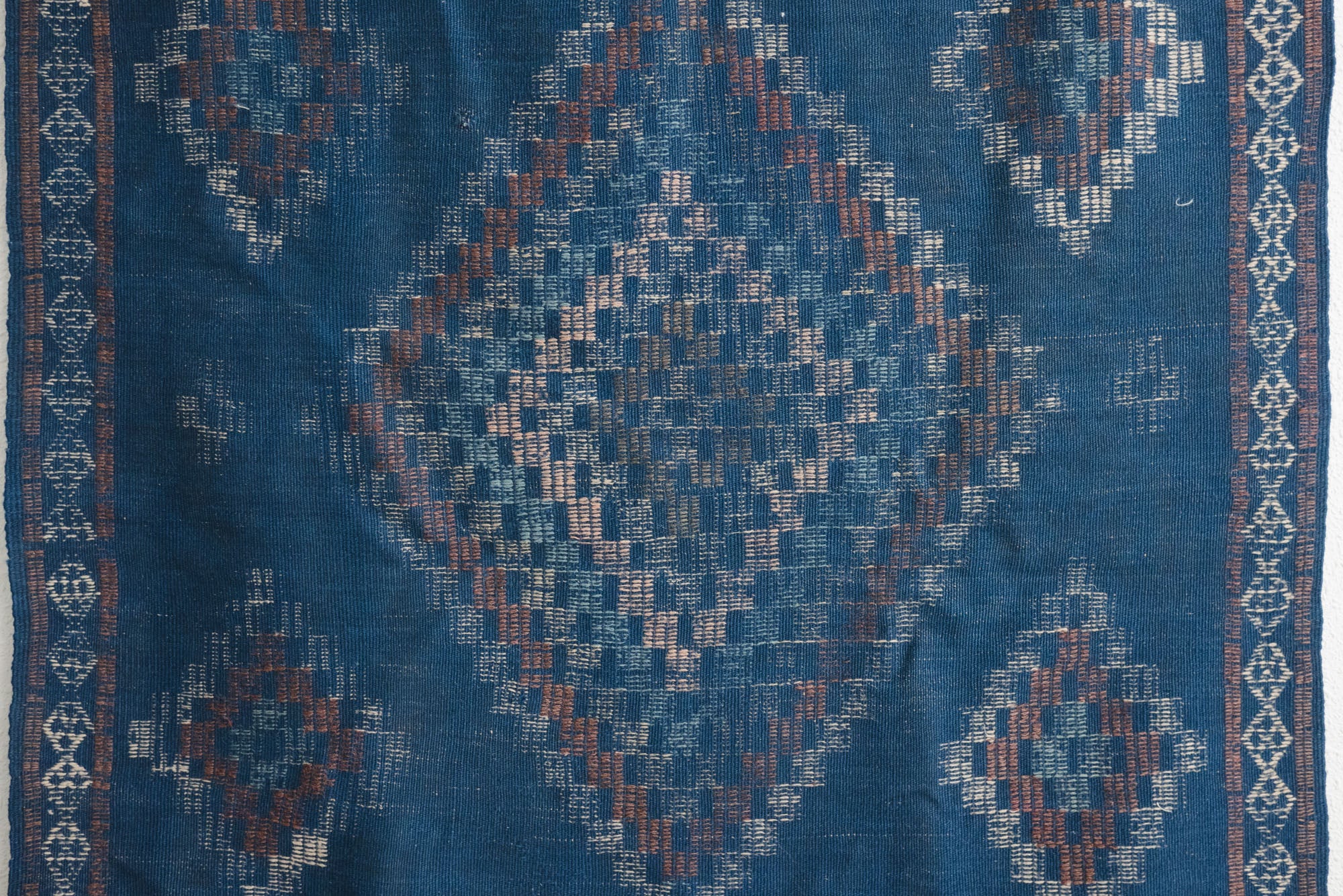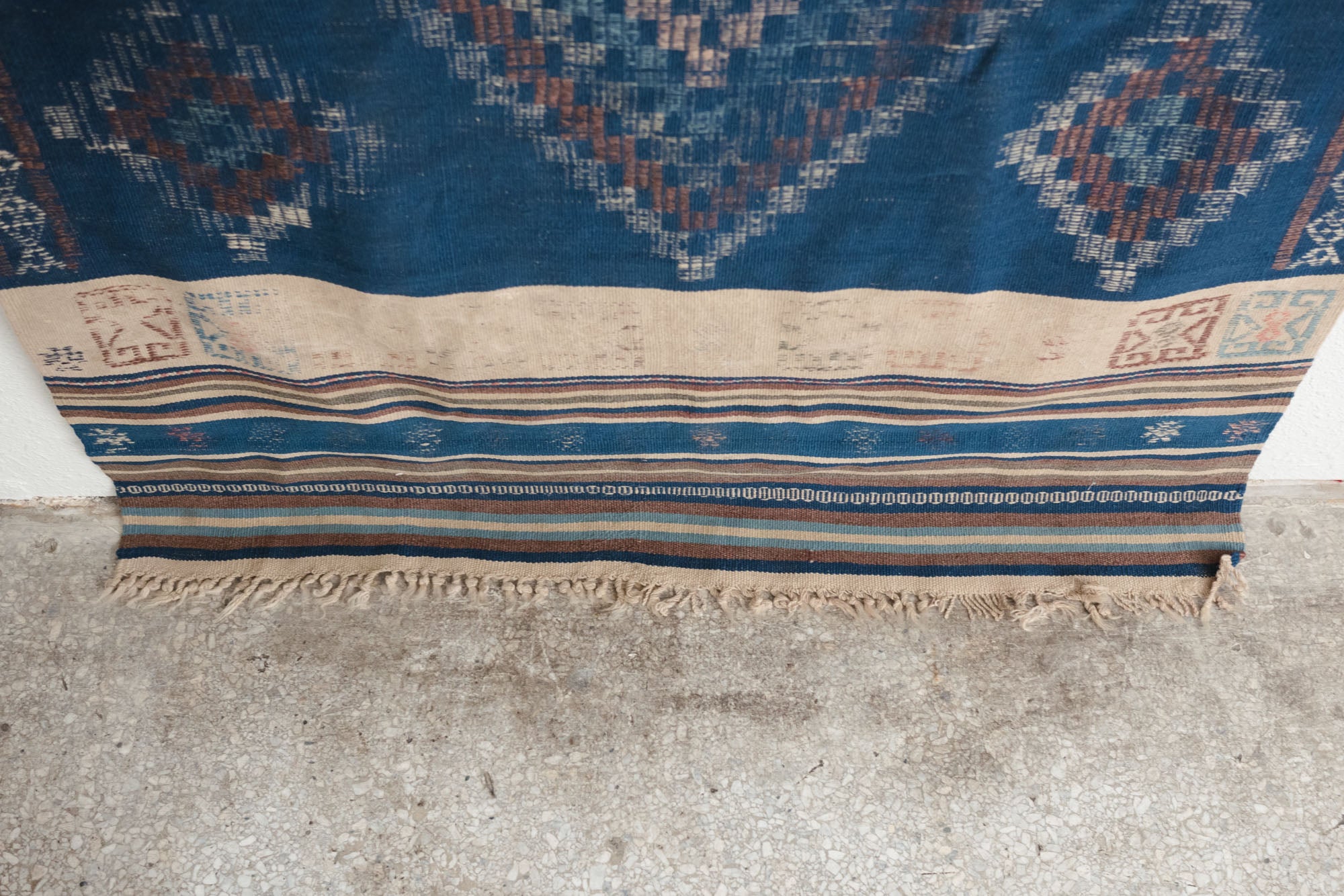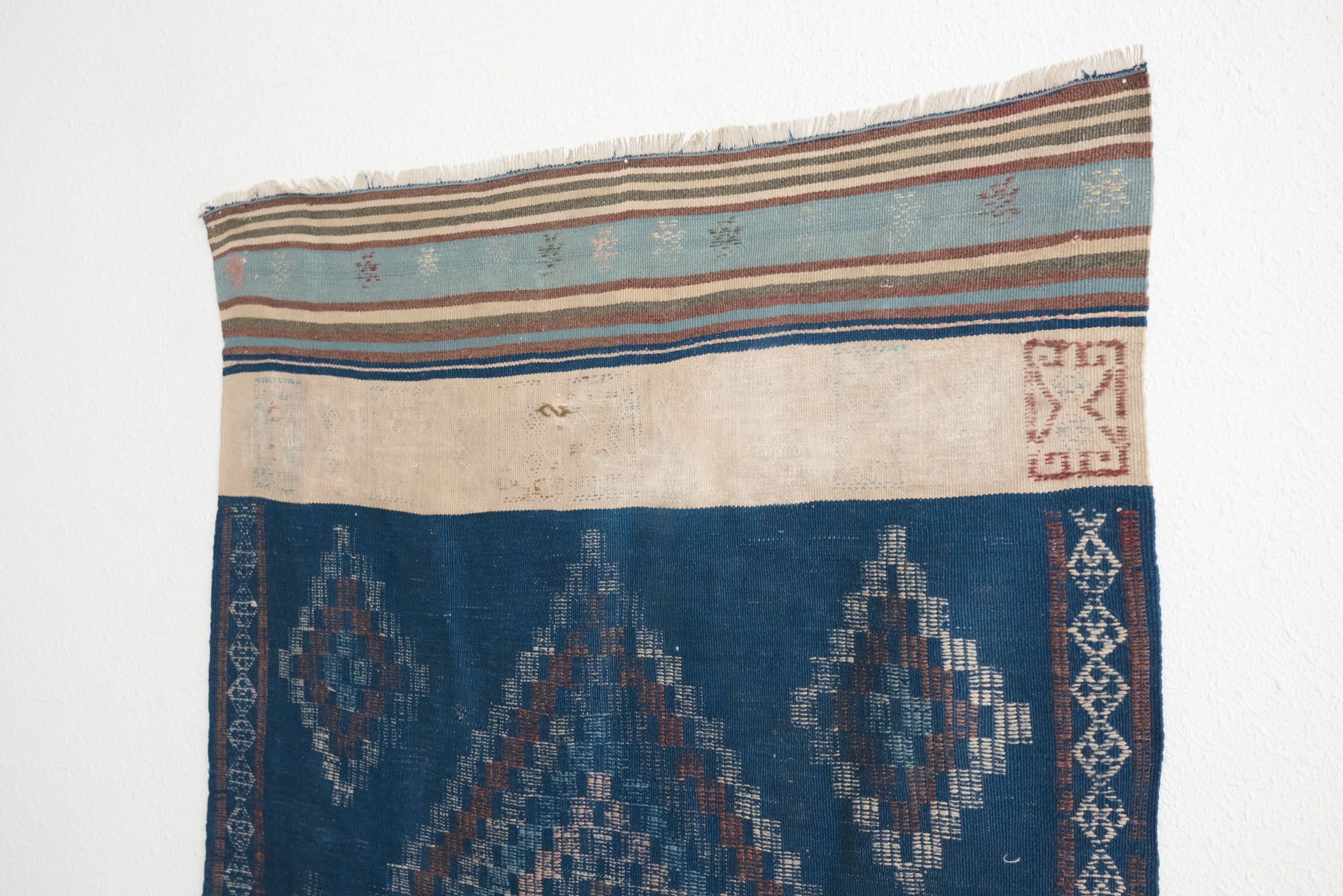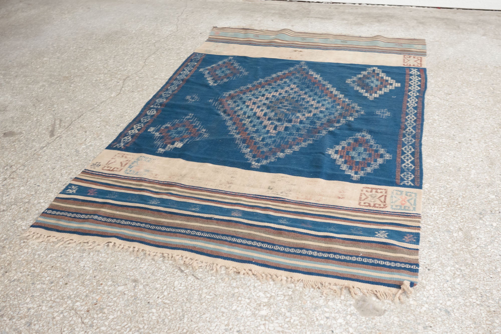 name: Bandanstyle: hand woven, Turkish, Kilim, rug, carpetmaterial: woolcolor: blue, camel, brown, navy, pink, greenage: vintage condition: good, age related wear - see pictures