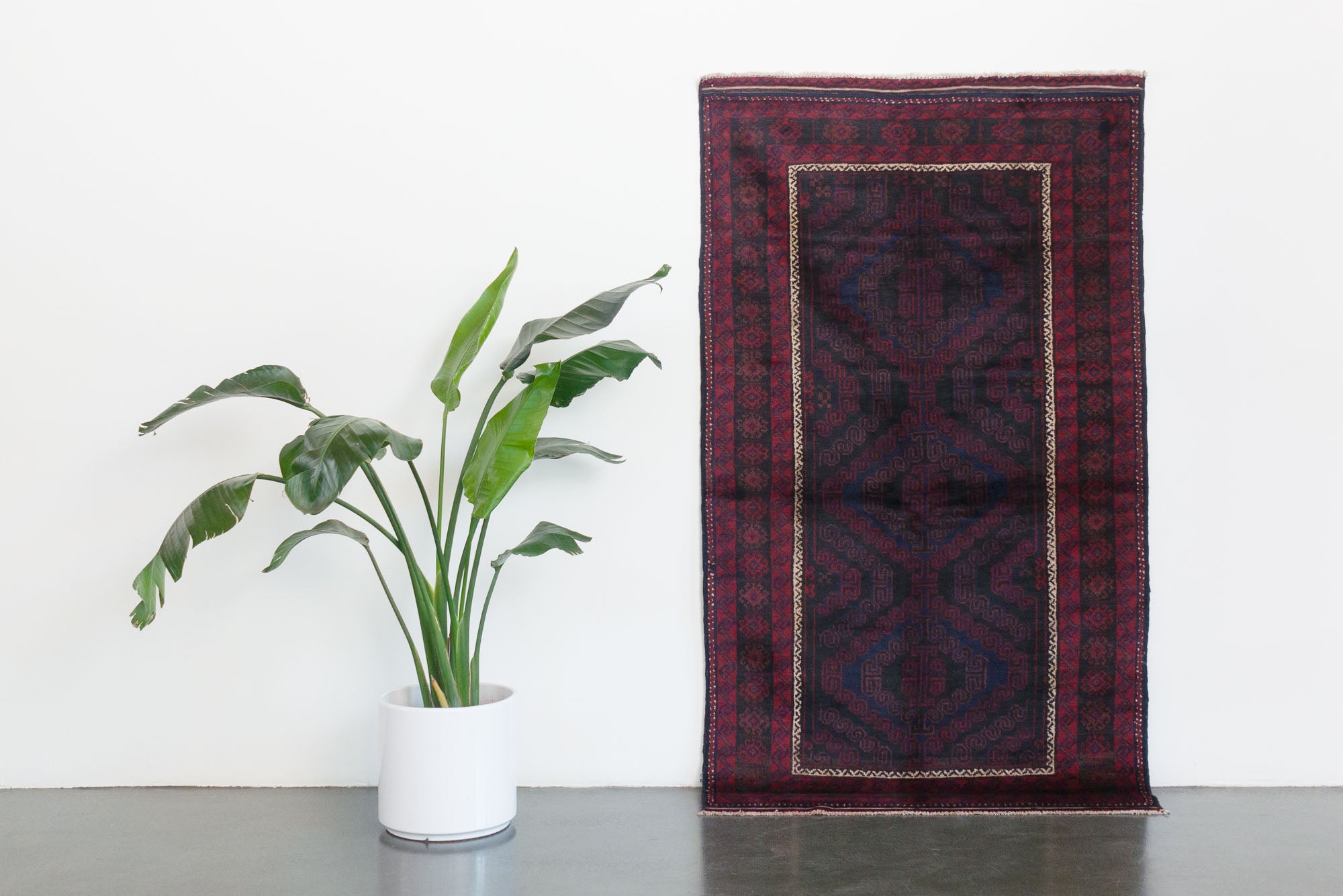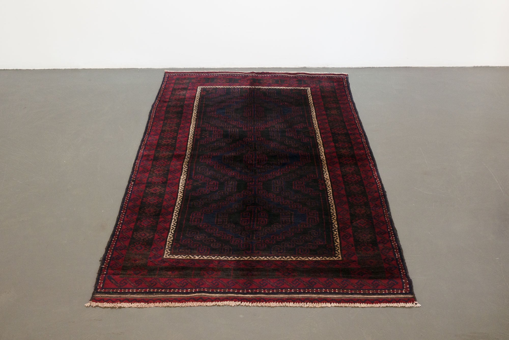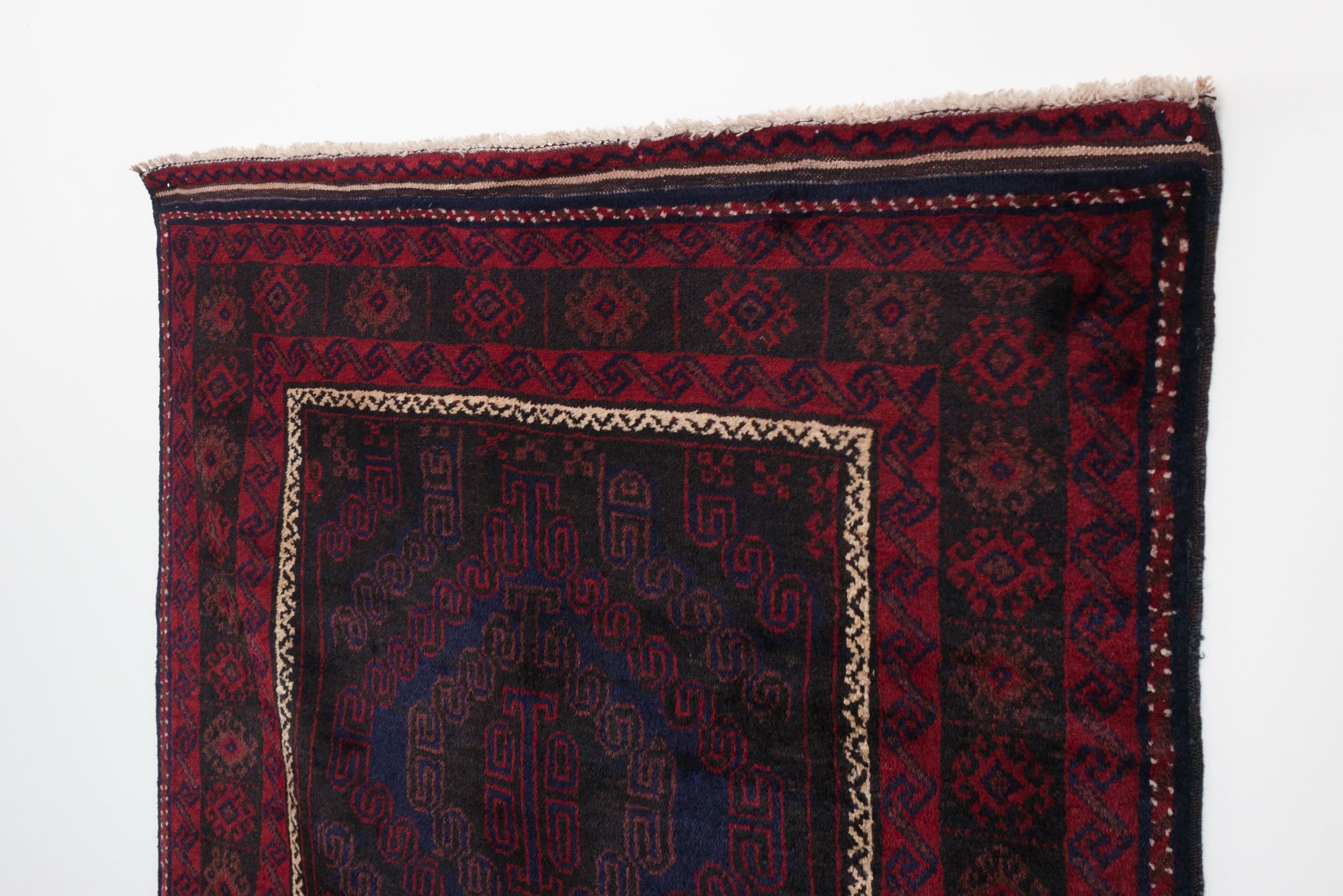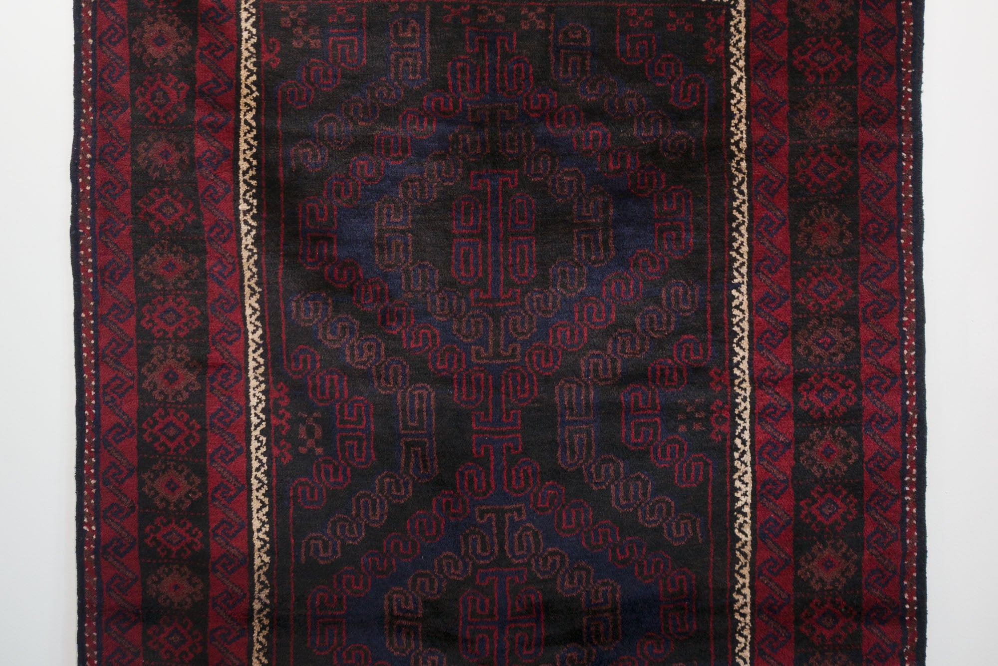 name: Dastgirorigin: Afghanistanstyle: teimani, rug, carpetmaterial: hand knotted woolcolors: black, red, navy, creamage: vintage, 1940-1969condition: good, age related wear - see picturesappraised value: $928sku: a-419