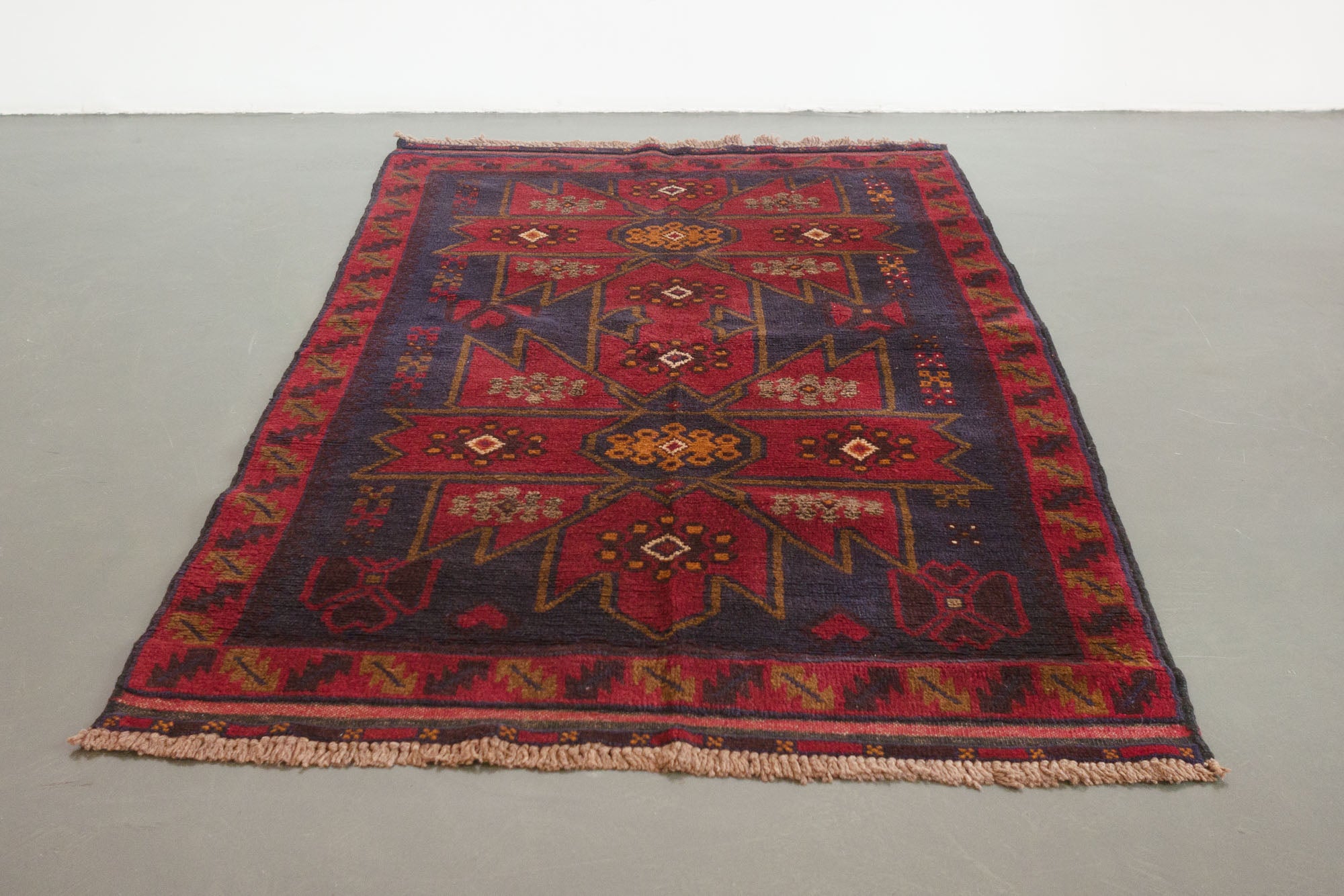name: Aainaorigin: Afghanistanstyle: teimani, rug, carpetmaterial: hand knotted woolcolors: navy, red, orange, cream, purpleage: vintage, 1940-1969condition: good, age related wear - see picturesappraised value: $868