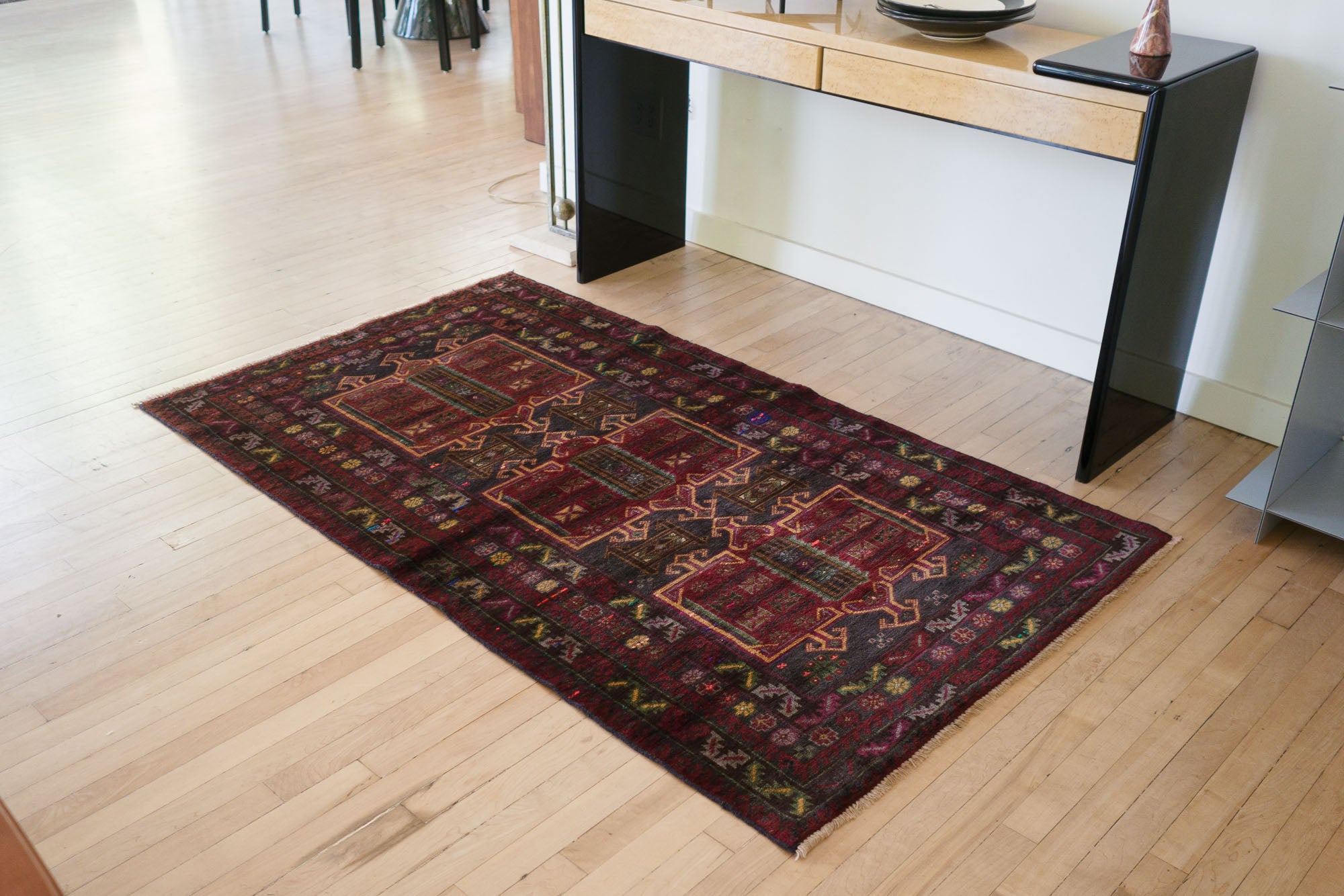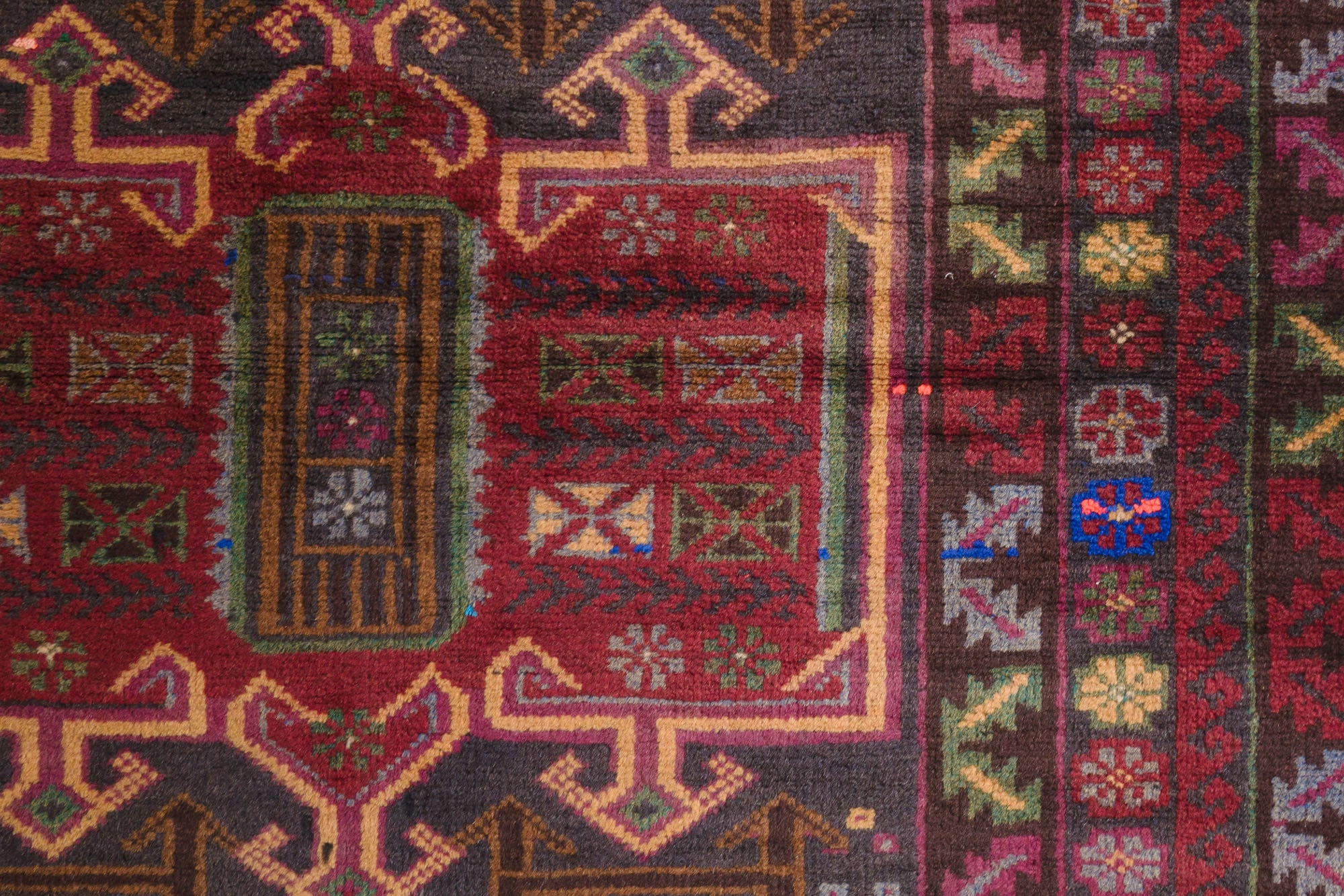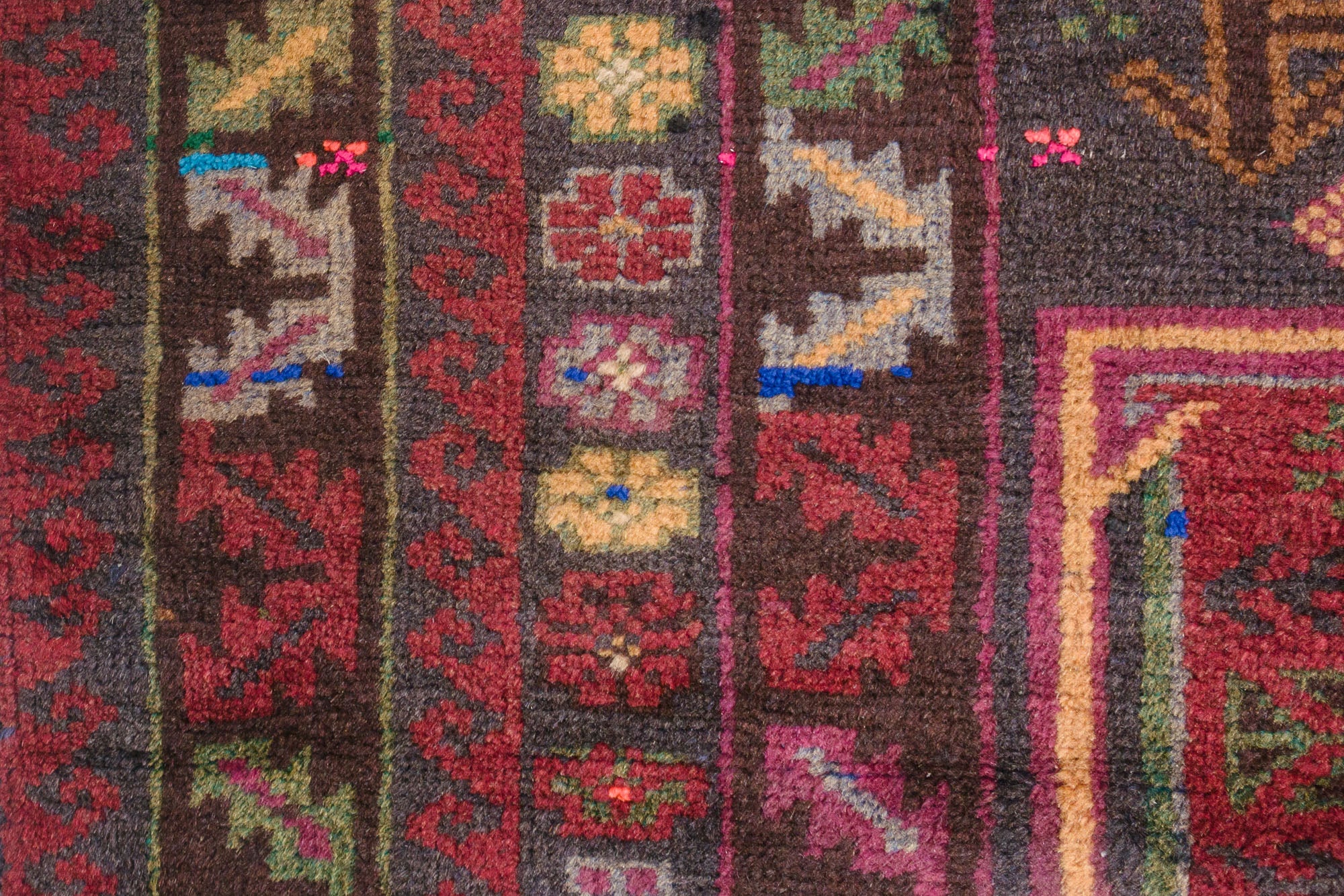 name: Tabaanorigin: Afghanistanstyle: Teimani, geometric, rug, carpetmaterial: hand knotted woolcolor: red, pink, brown, green, blue, yellow, cream, blackage: vintage (1940-1969)condition: good, age related wear - see picturesappraised value: $812sku: a-403
