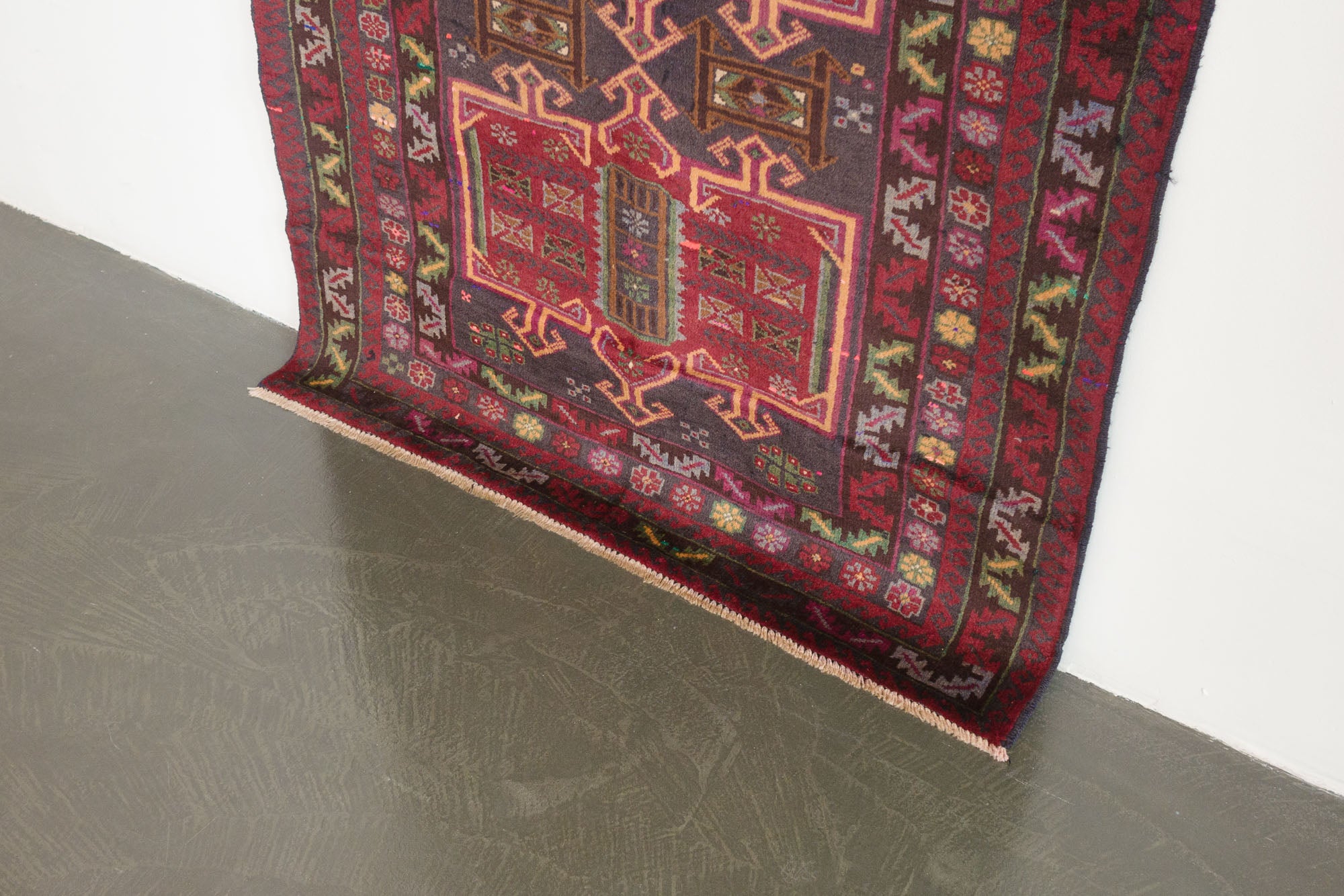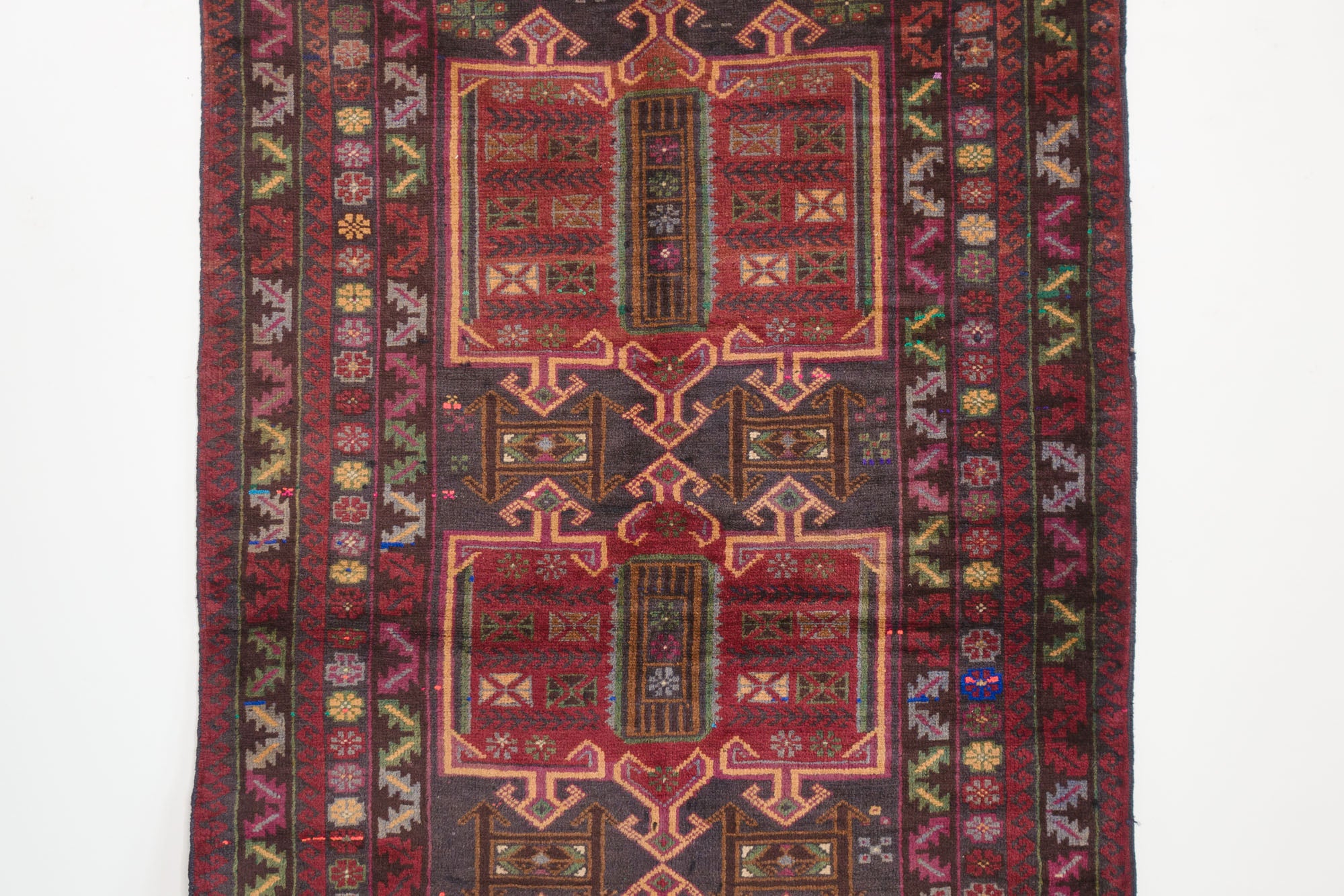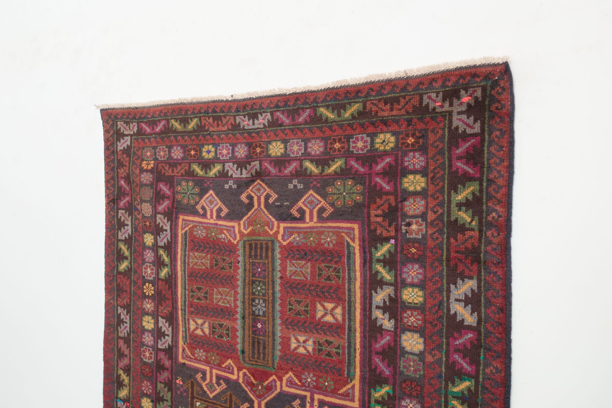 name: Tabaanorigin: Afghanistanstyle: Teimani, geometric, rug, carpetmaterial: hand knotted woolcolor: red, pink, brown, green, blue, yellow, cream, blackage: vintage (1940-1969)condition: good, age related wear - see picturesappraised value: $812sku: a-403