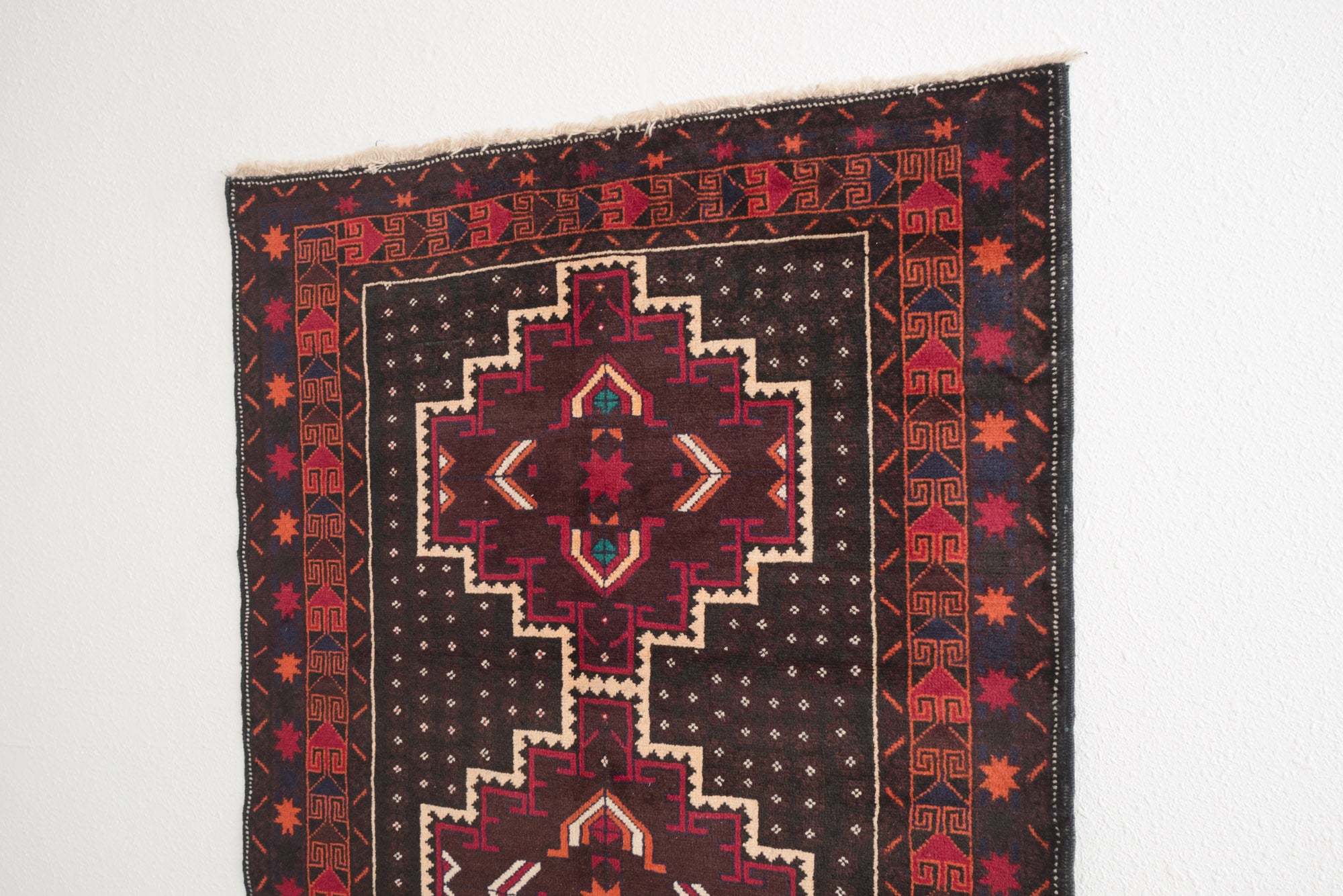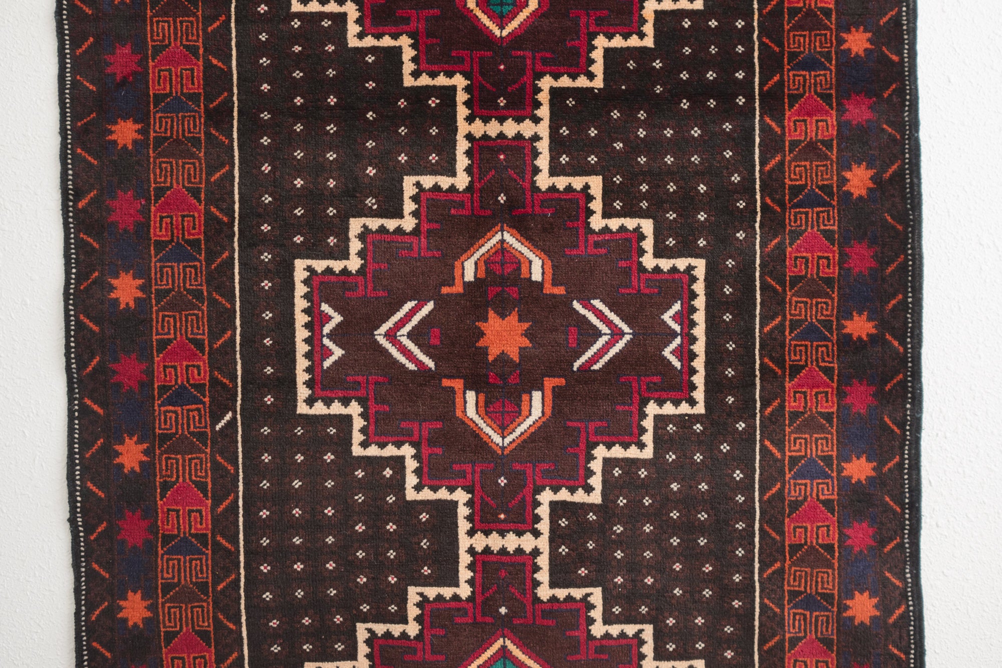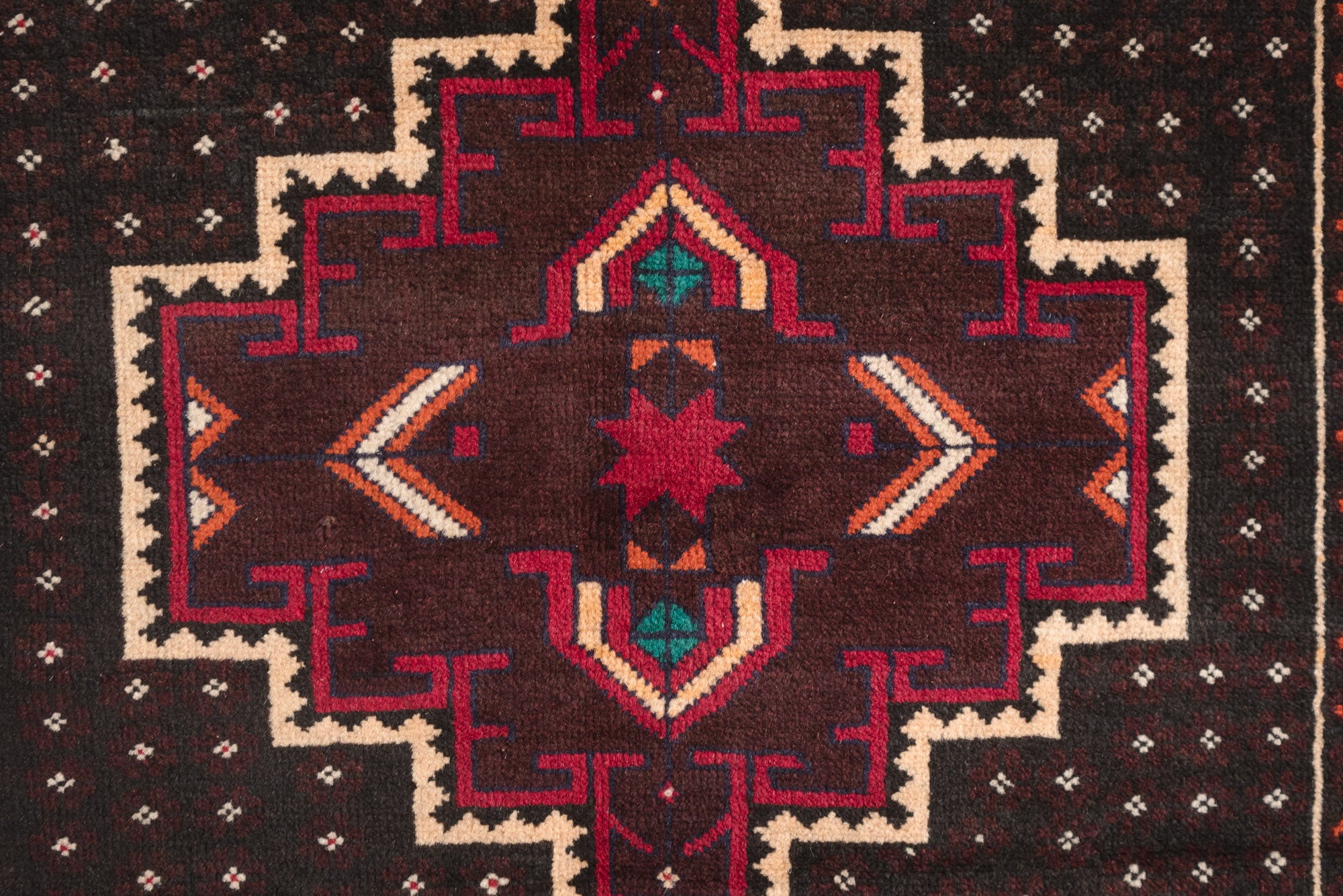 name: Zahurstyle: hand knotted, Pakistani, Baluch, rug, carpetmaterial: woolcolors: orange, teal, cream, black, raspberry, burgundyage: vintage condition: good, age related wear - see pictures