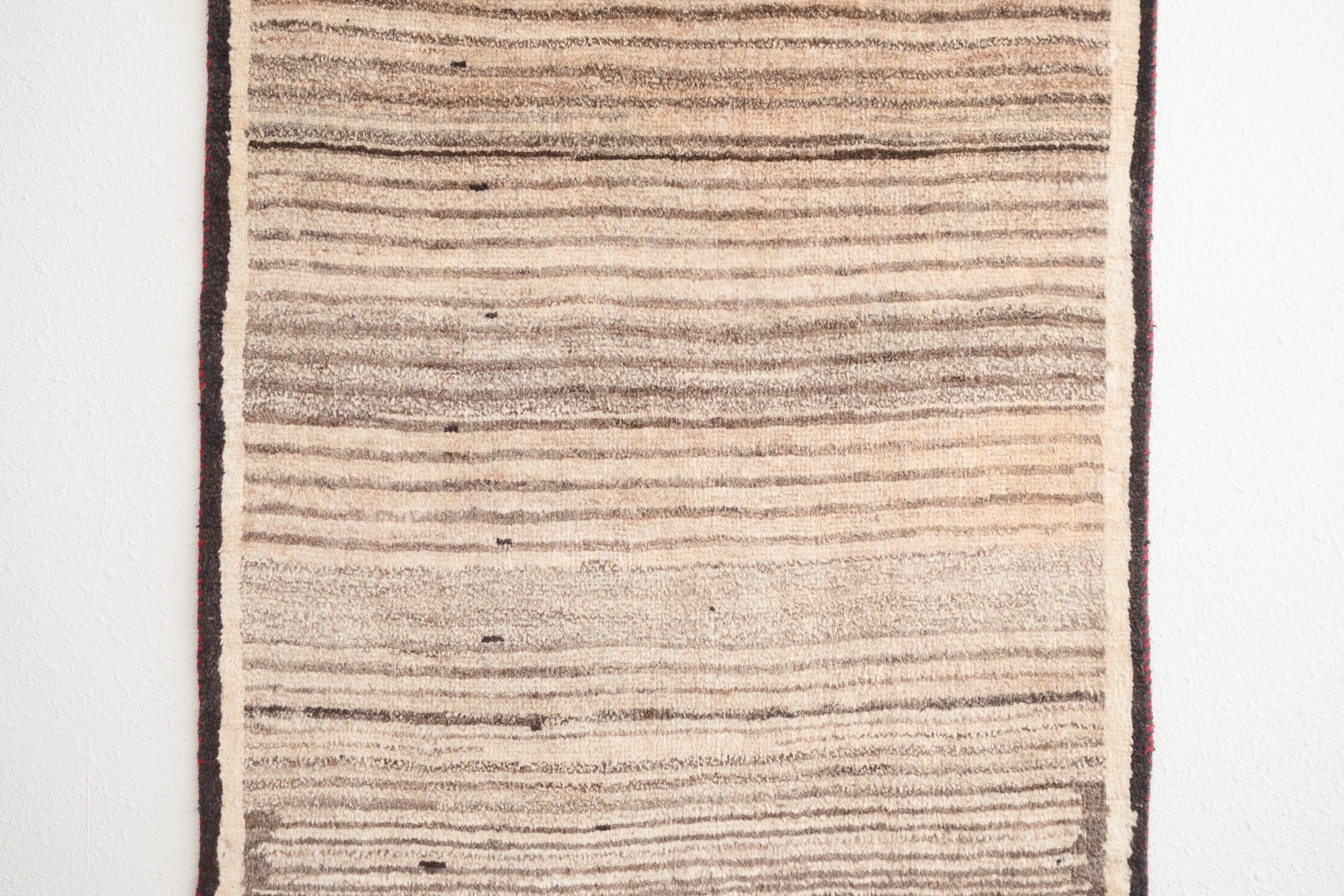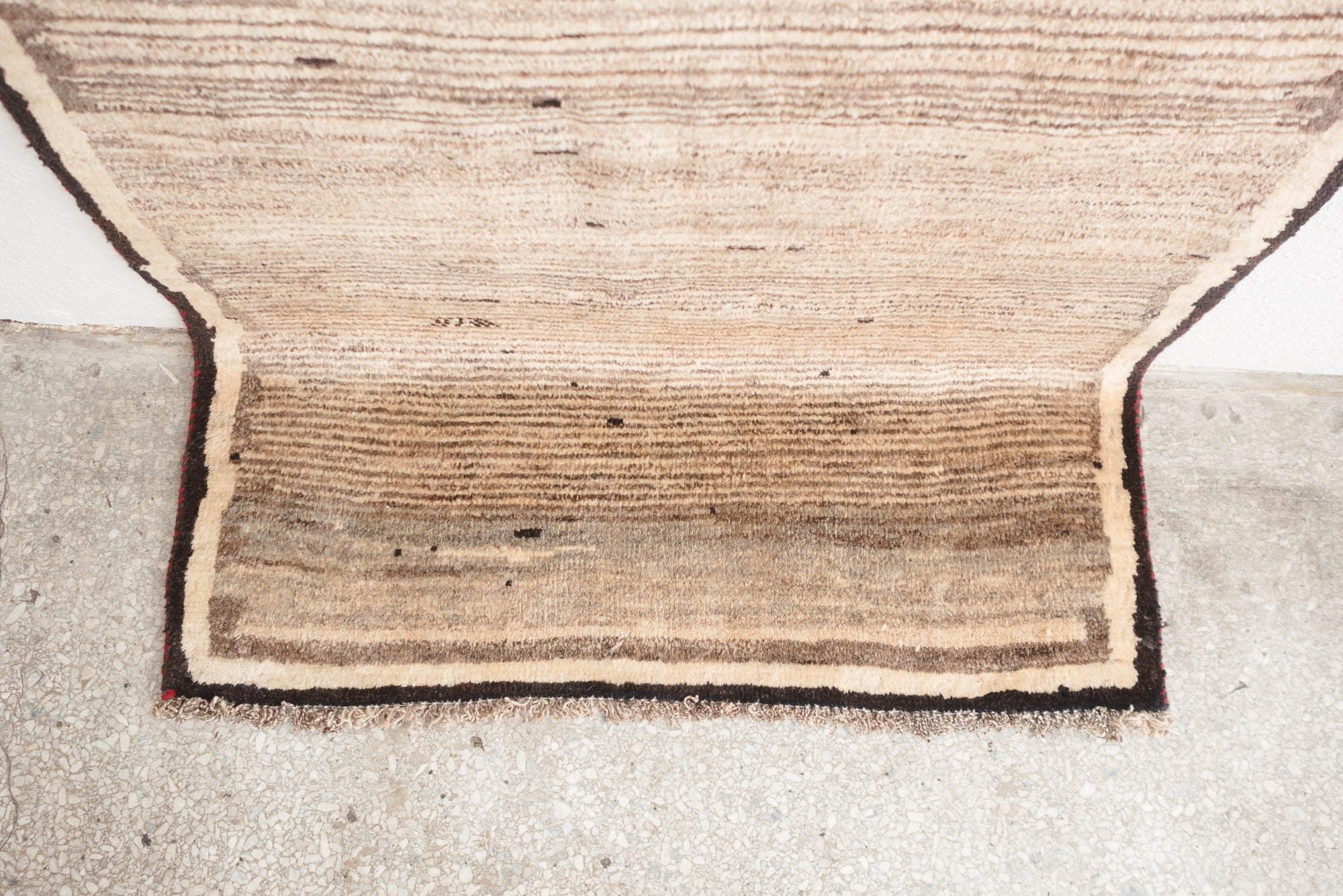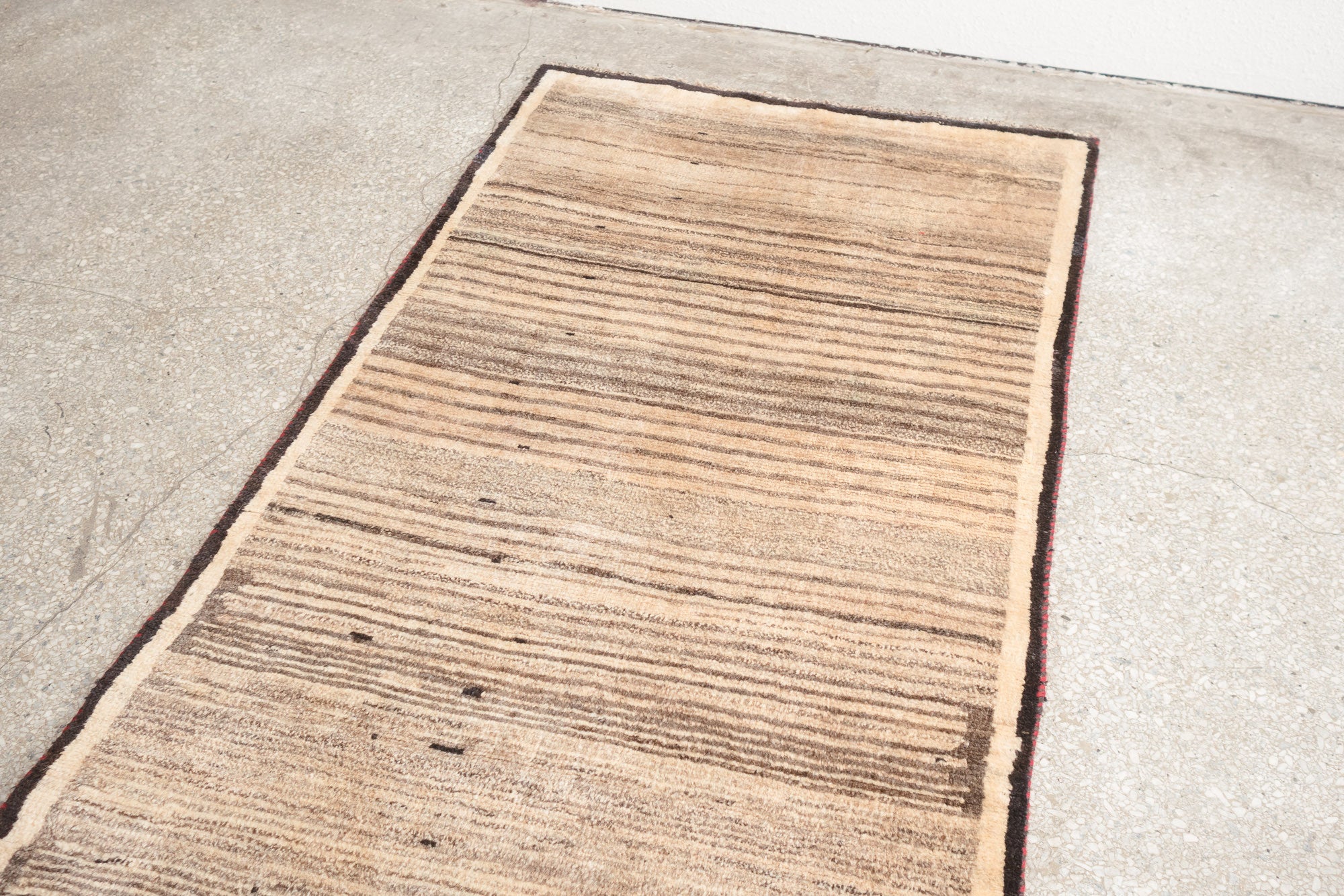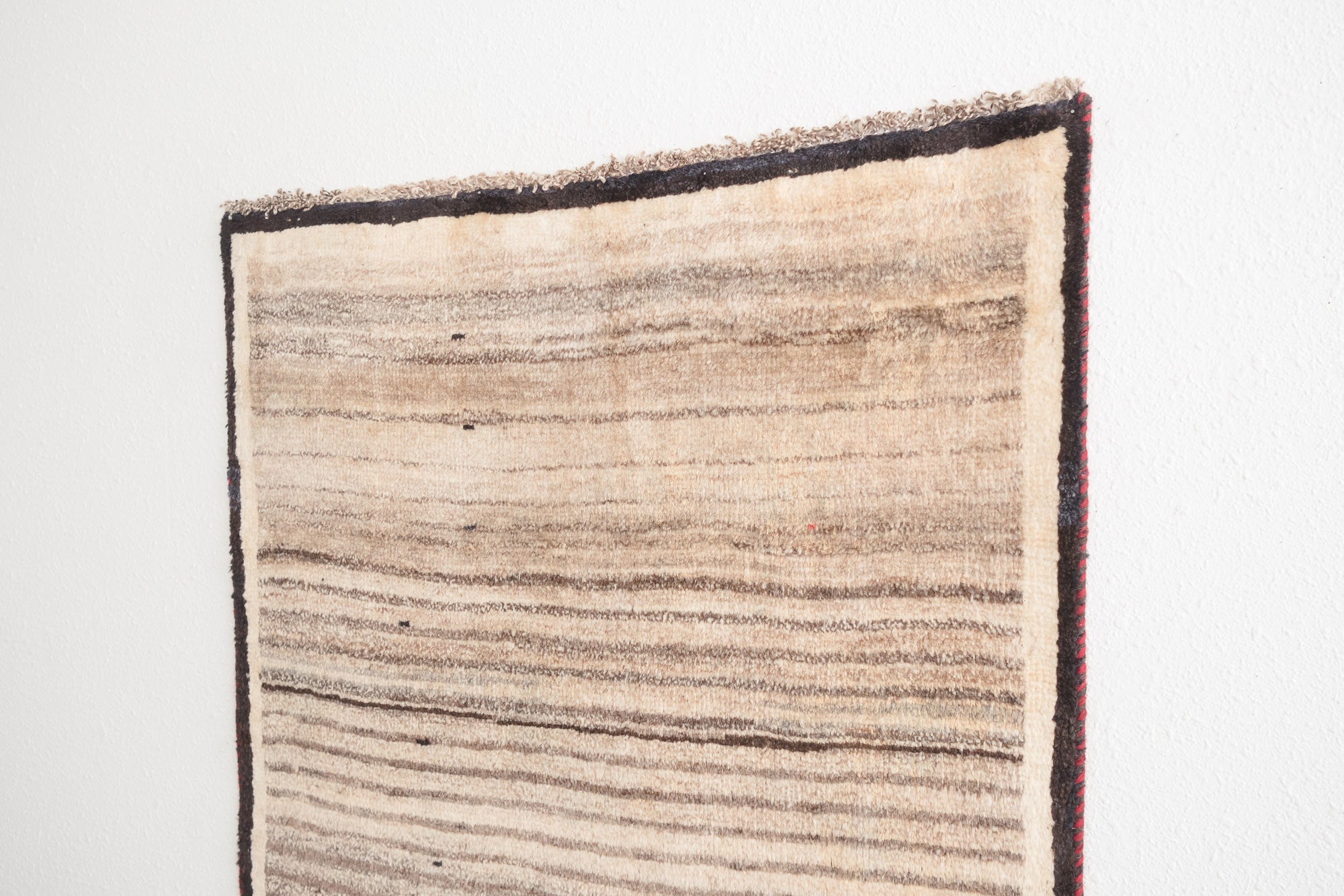 name: Karan style: hand knotted, Persian, Gabbeh, rug, carpet material: wool colors: red, brown, camel, cream, tan, black age: vintage condition: good, age related wear, no holes - see pictures