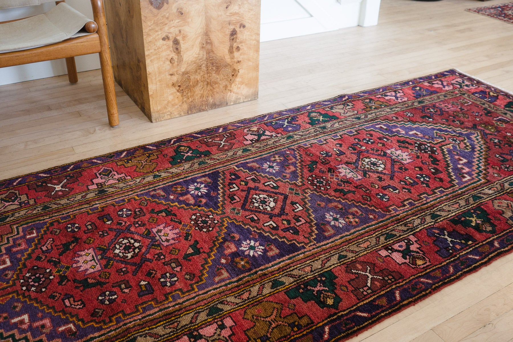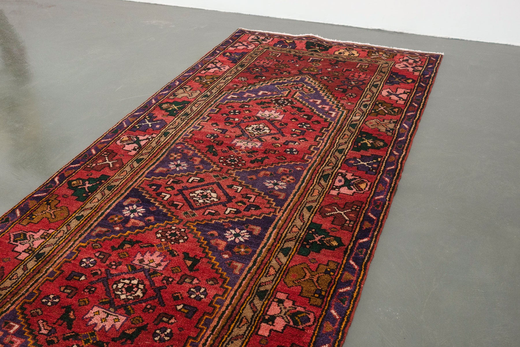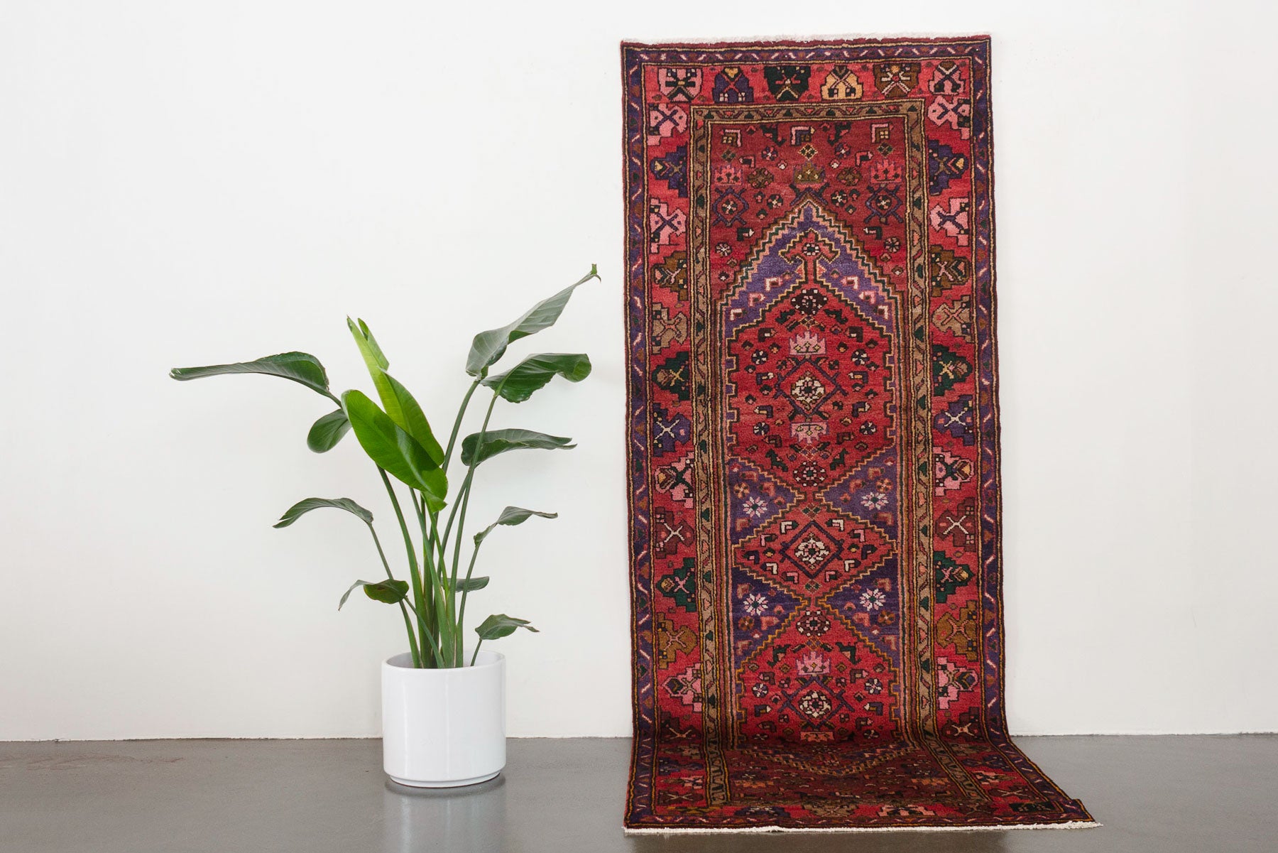 name: Raouforigin: Iran (Persian), Asadabadstyle: rug, runner, carpet material: hand knotted woolcolors: red, browns, green, violet, yellow, pinks, cream age: vintage condition: good, age related wear - see pictures42" x 113" (closest standard rug size is 3.5x9.5)Free domestic shipping on all rugs.Contact us for an international shipping quote.