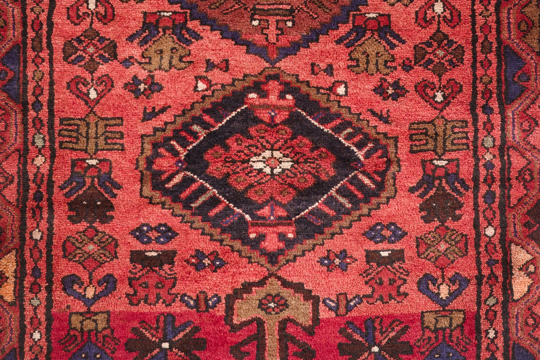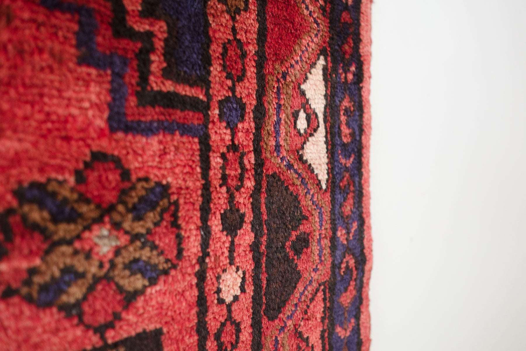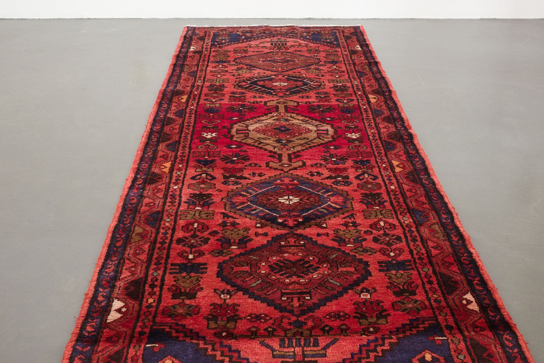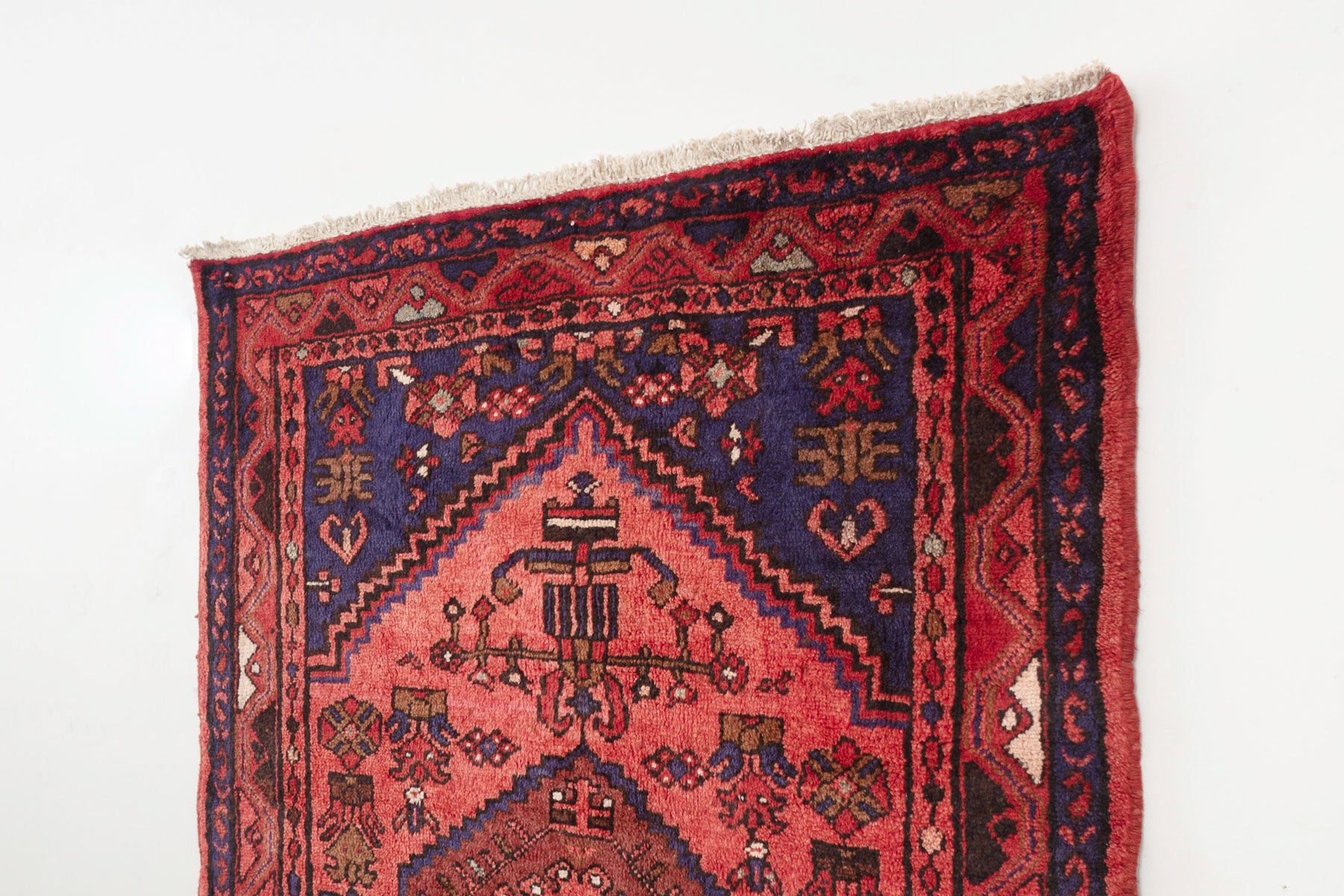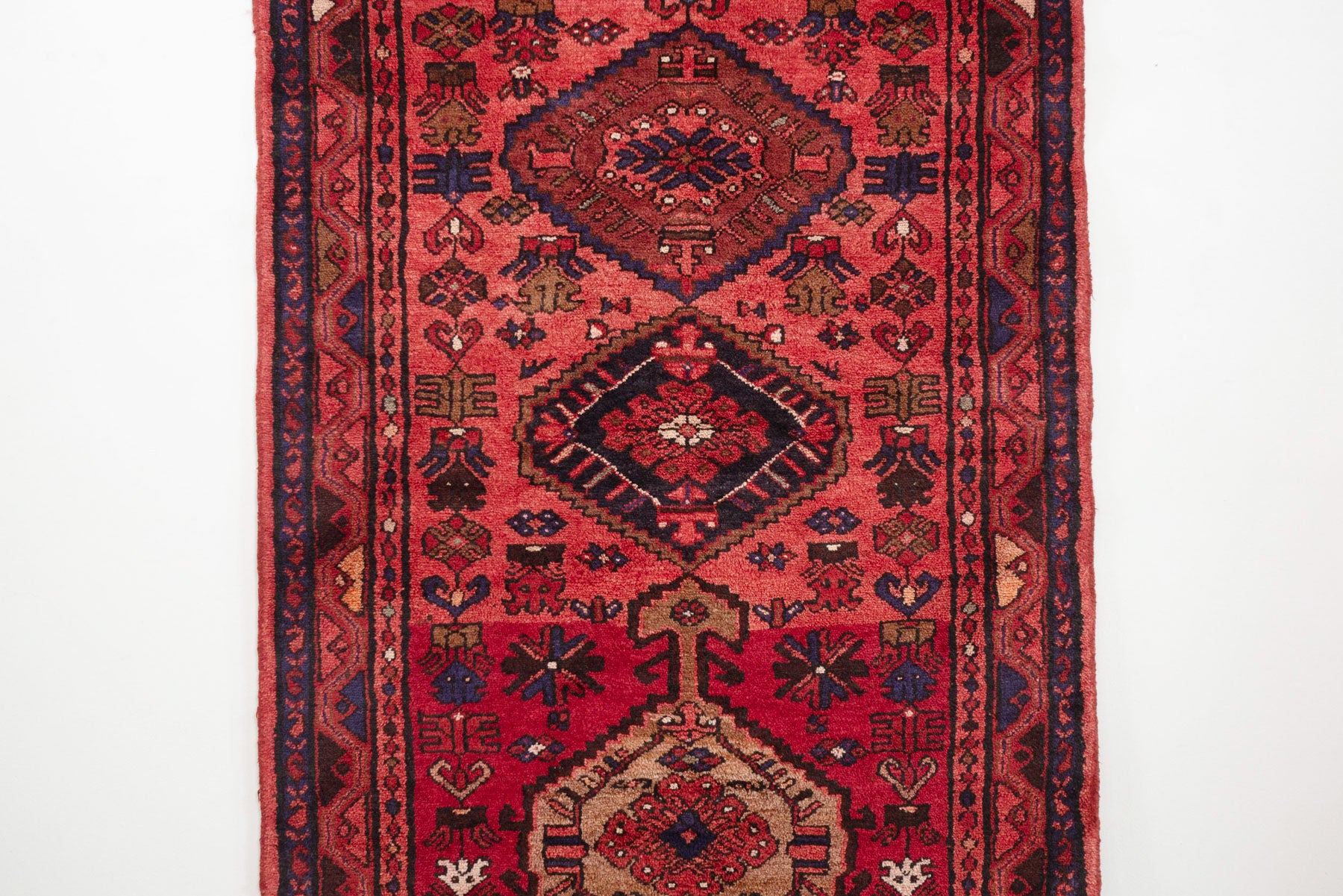 name: Tajfarorigin: Iran (Persian), Koliaistyle: runner, rug, carpetmaterial: hand knotted woolcolors: reds, navy, brown, camel, orange, grey, creamage: vintage 1940-1970condition: good, age related wear - see picturesappraised value: $1,600