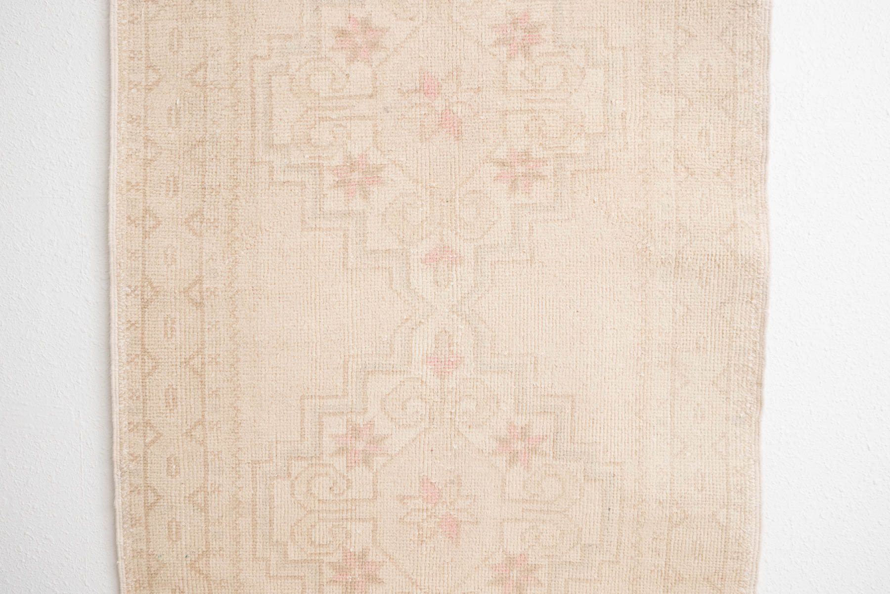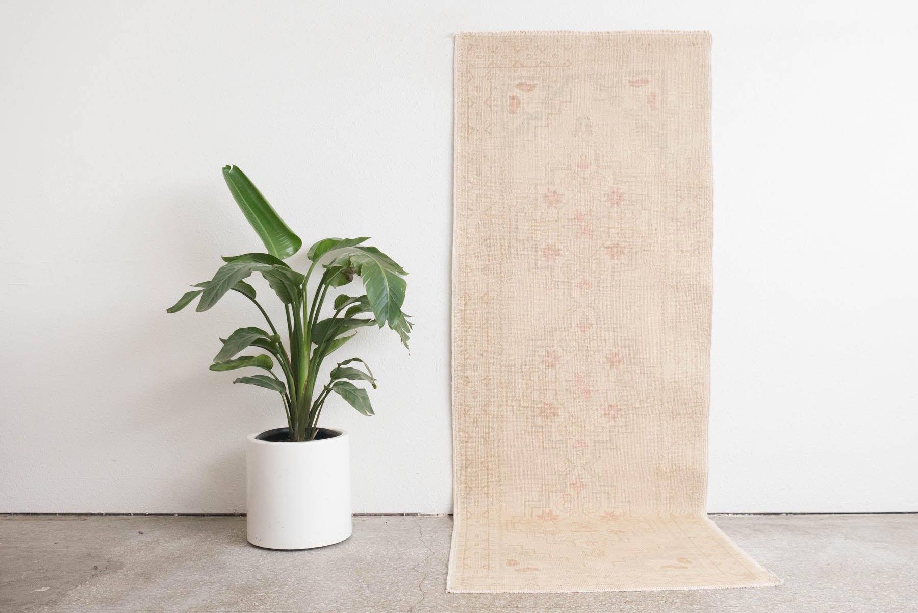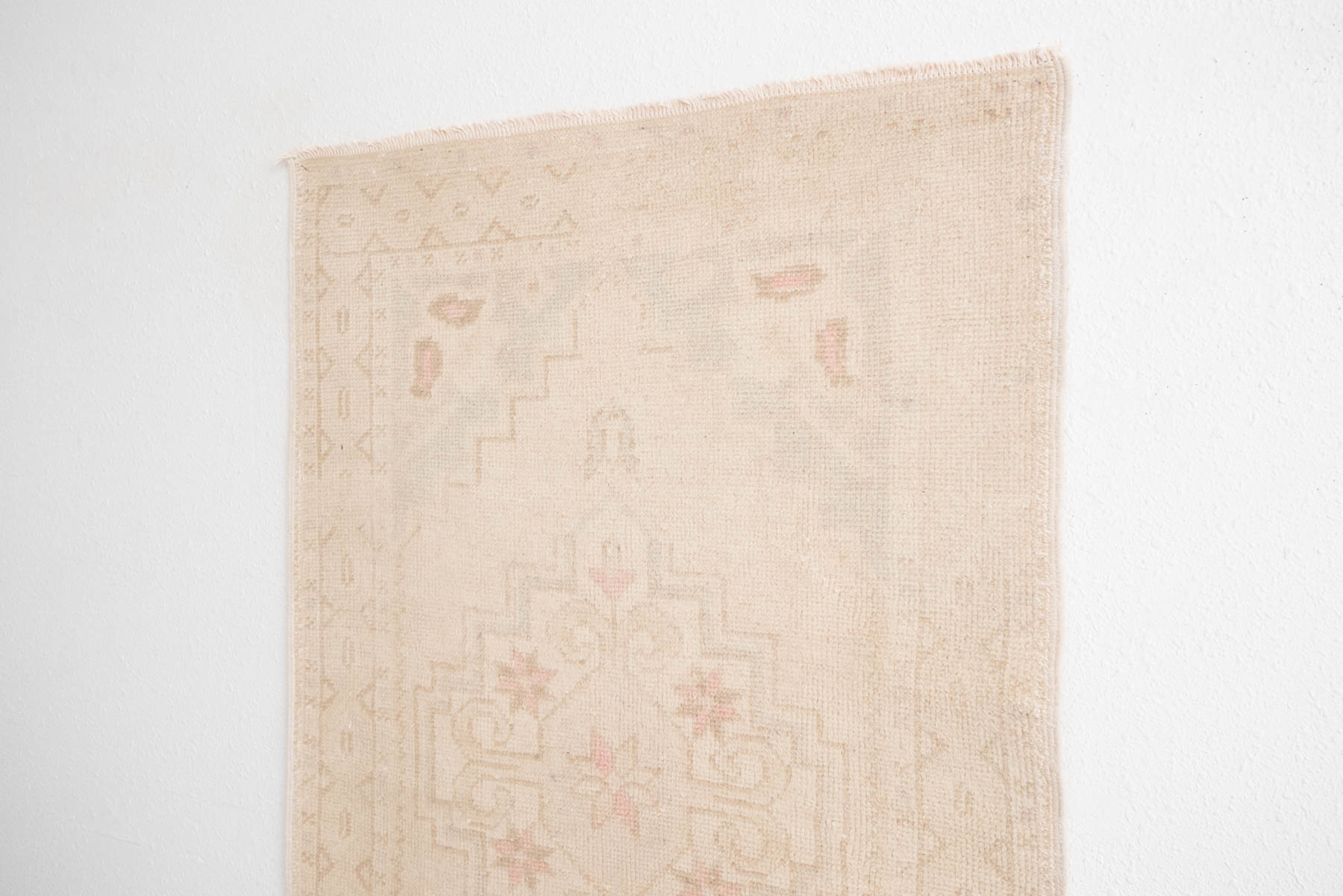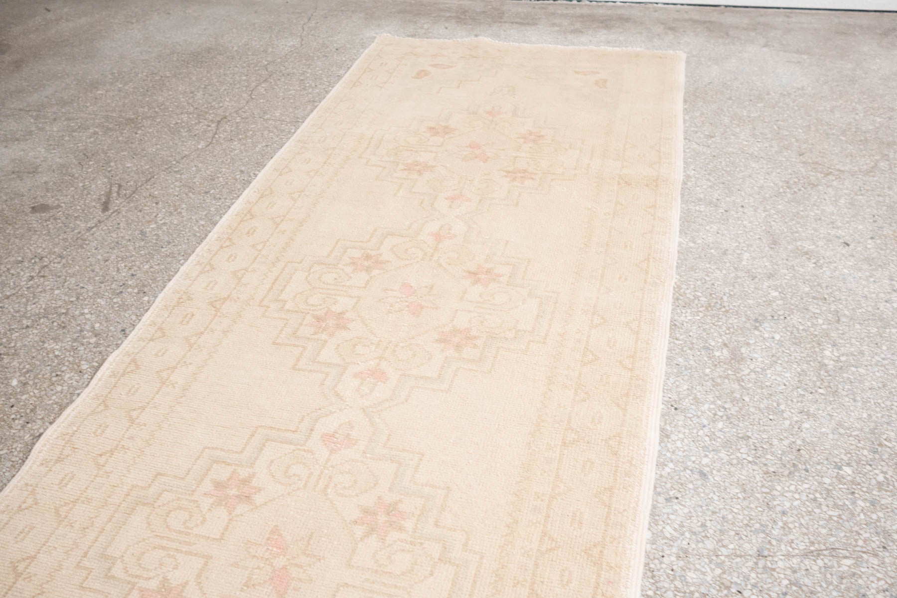 name: Ekmelstyle: hand knotted, Turkish, sunwashed, rug, runner, carpetmaterial: woolcolors: cream, pink, mint, gray, tanage: vintage condition: good, age related wear - see pictures