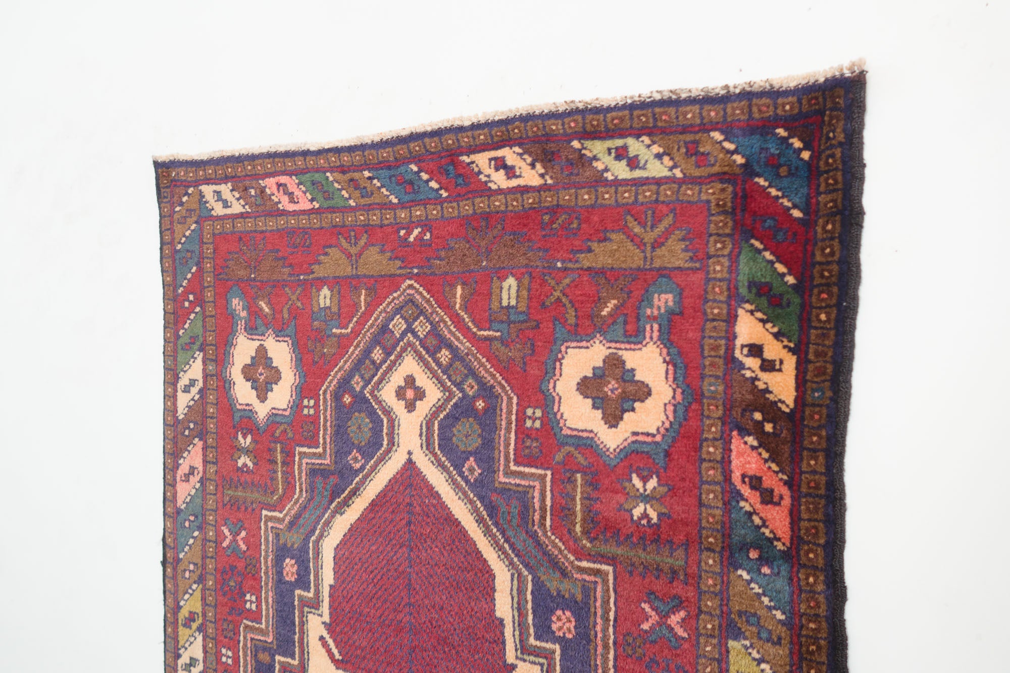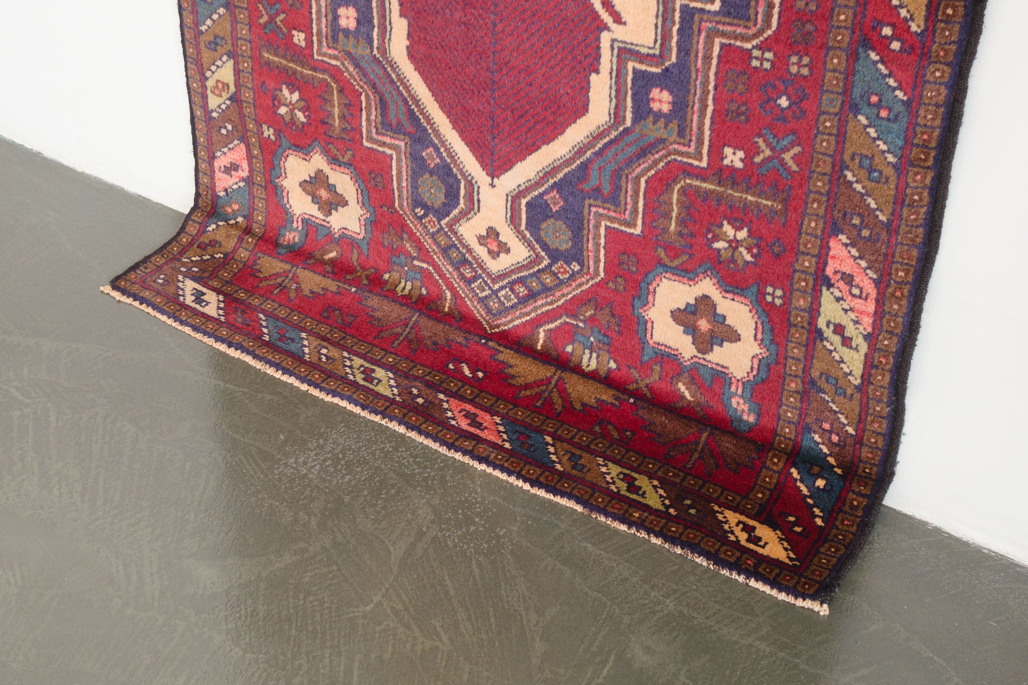 name: Jawidorigin: Afghanistanstyle: Teimani, geometric, rug, carpetmaterial: hand knotted woolcolor: red, pink, blues, greens, browns, creamage: vintage (1940-1969)condition: good, age related wear (dots) - see picturesappraised value: $812