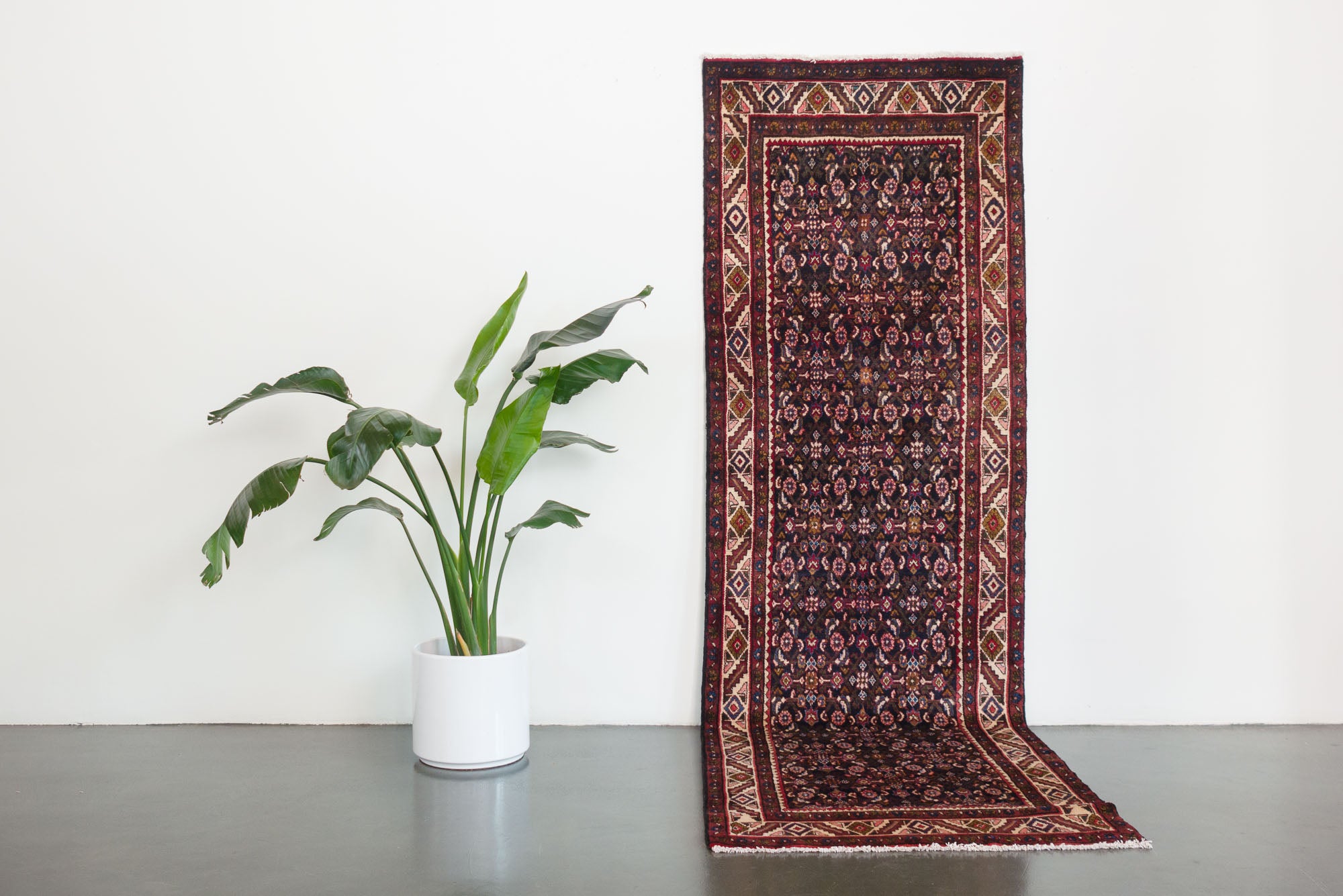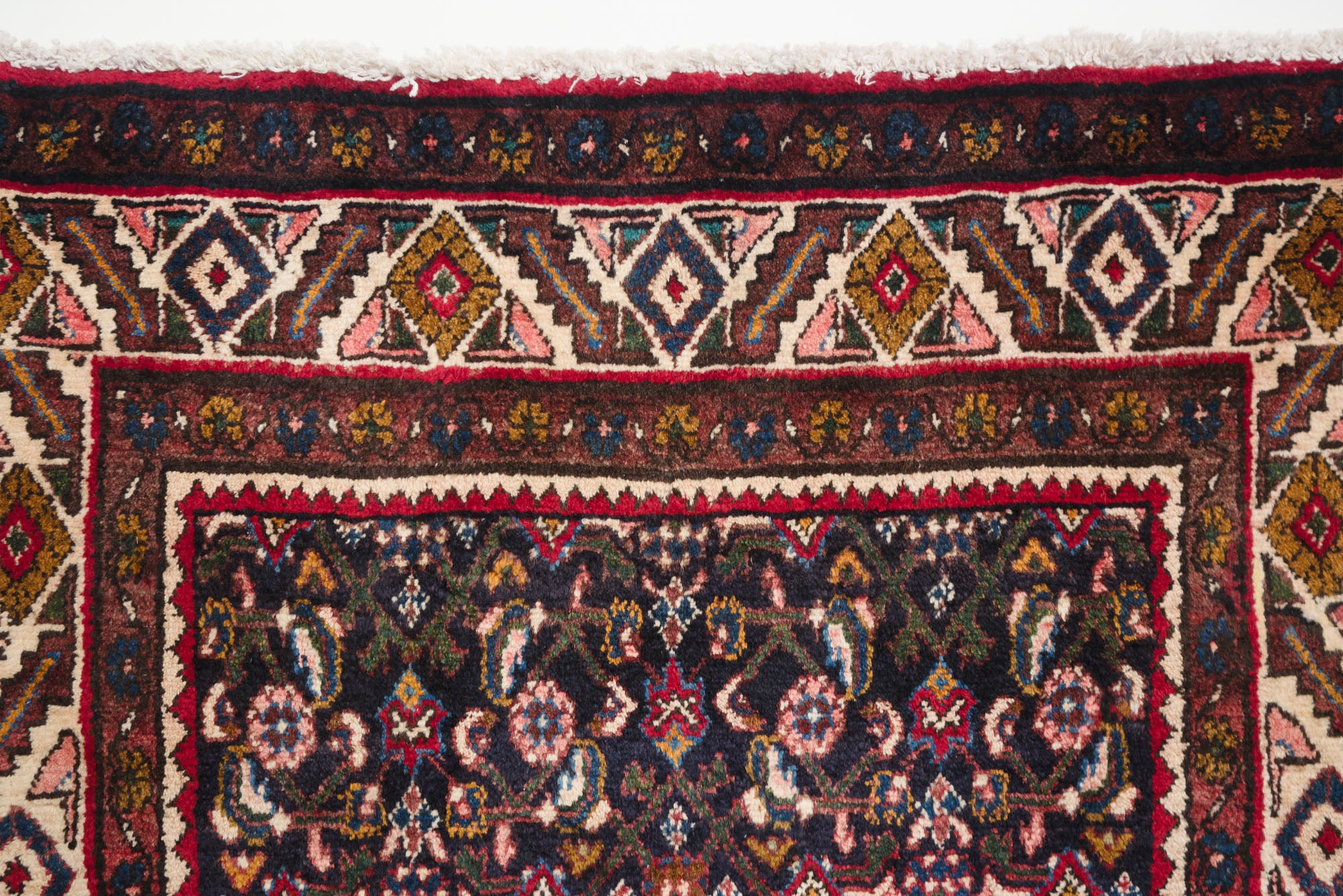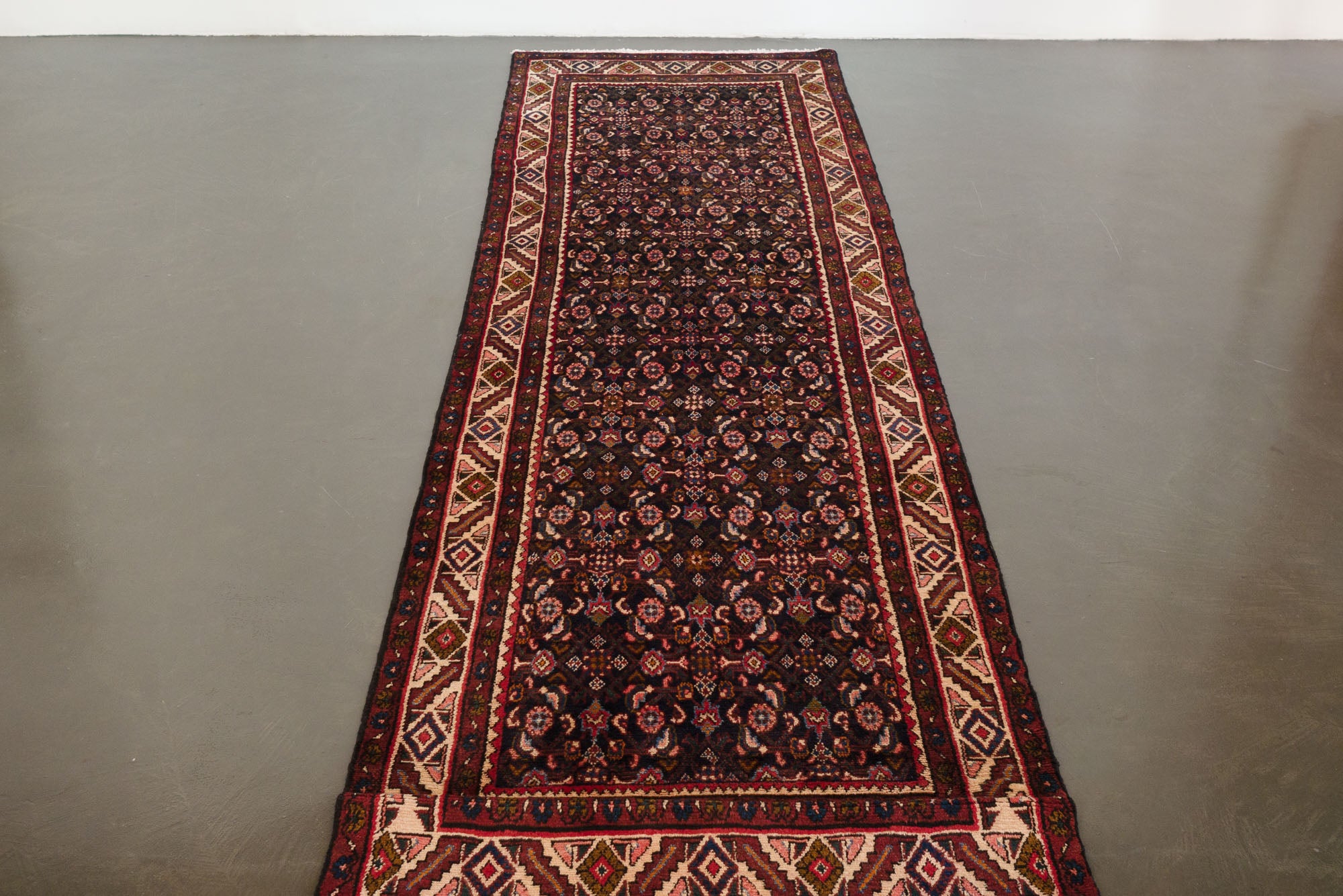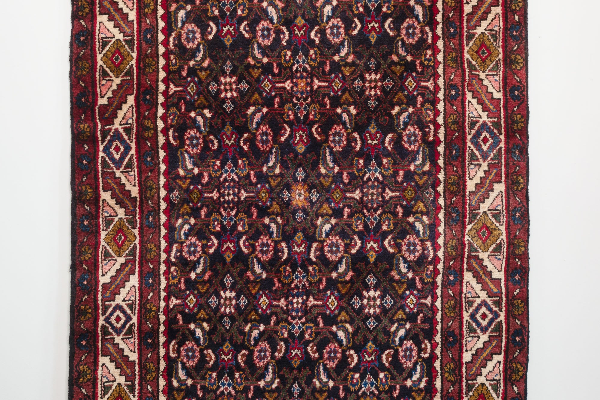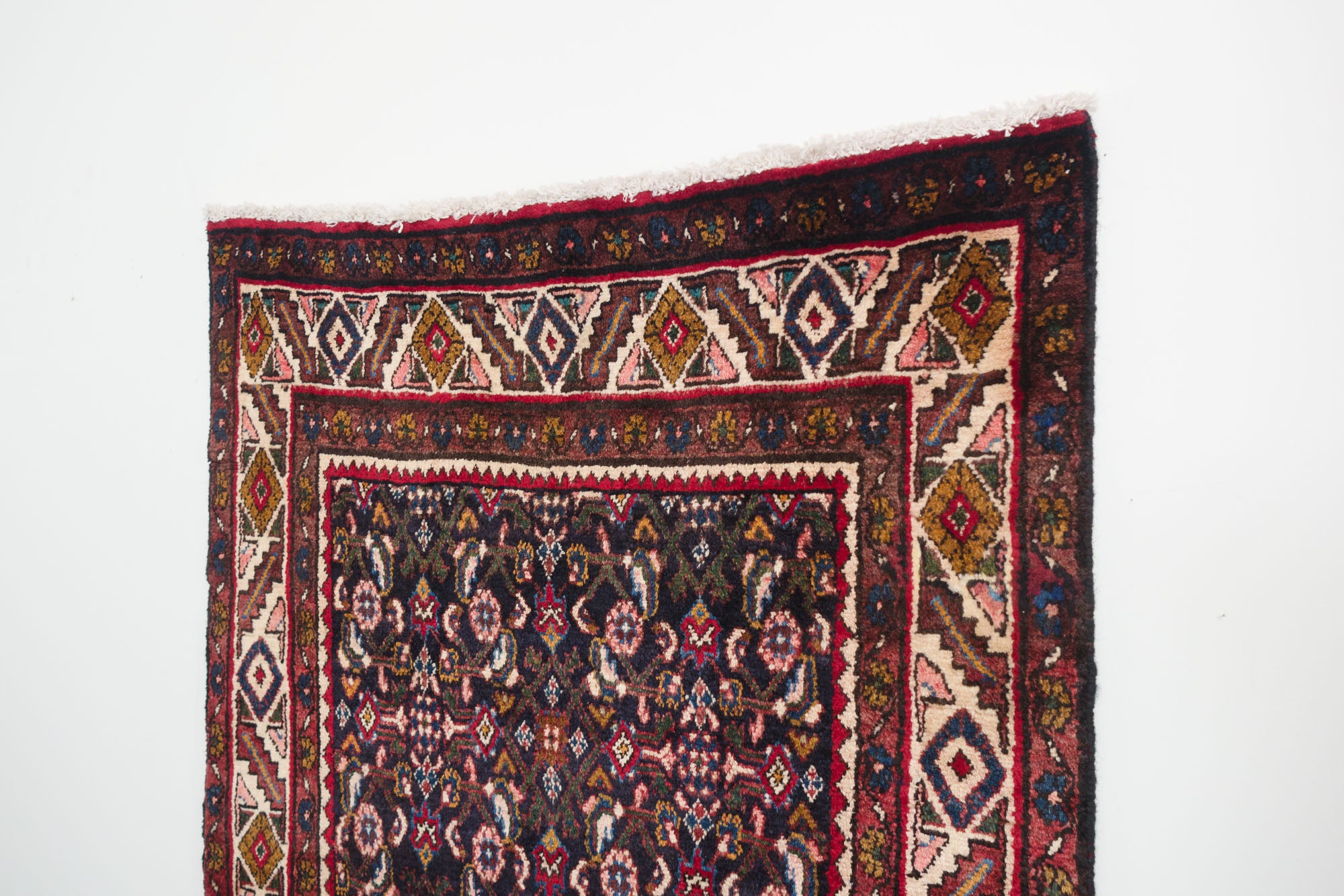 name: Rostamiorigin: Iran (Persian)style: runner, rug, carpetmaterial: hand knotted woolcolors: black, red, yellow, brown, cream, blue, greenage: vintage, 1940-1970condition: good, age related wear - see picturesappraised value: $1280sku: p-1109