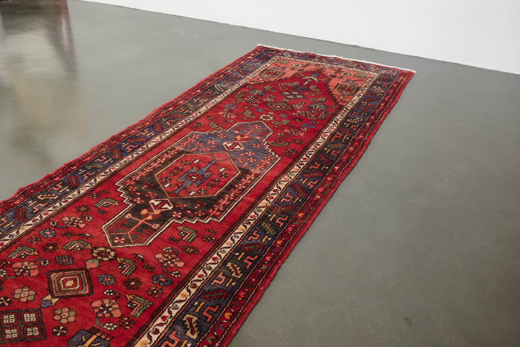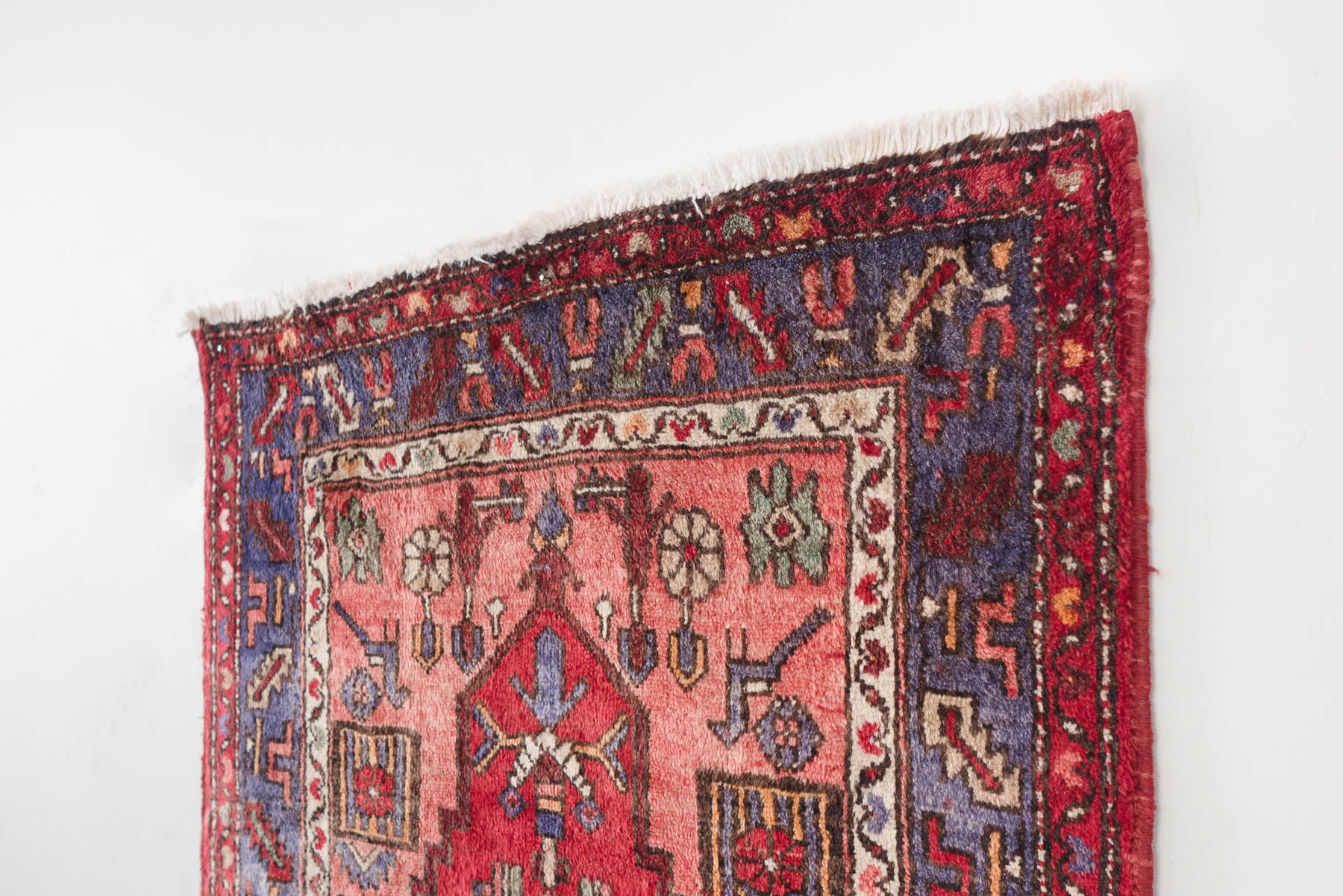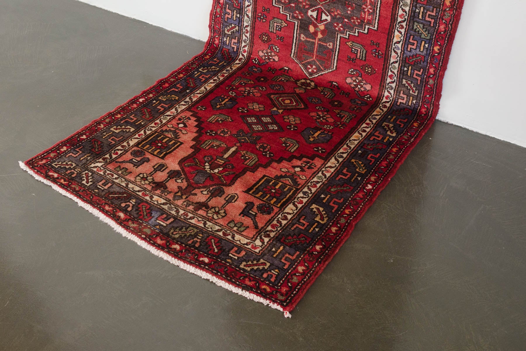 name: Samyarorigin: Iran (Persian)style: rug, runner, carpetmaterial: hand knotted woolcolors: red, burgundy, salmon, slate grey, tanage: vintage condition: good, age related wear - see pictures40" x 120" (closest standard rug size is 3x10)Free domestic shipping on all rugs.Contact us for an international shipping quote.