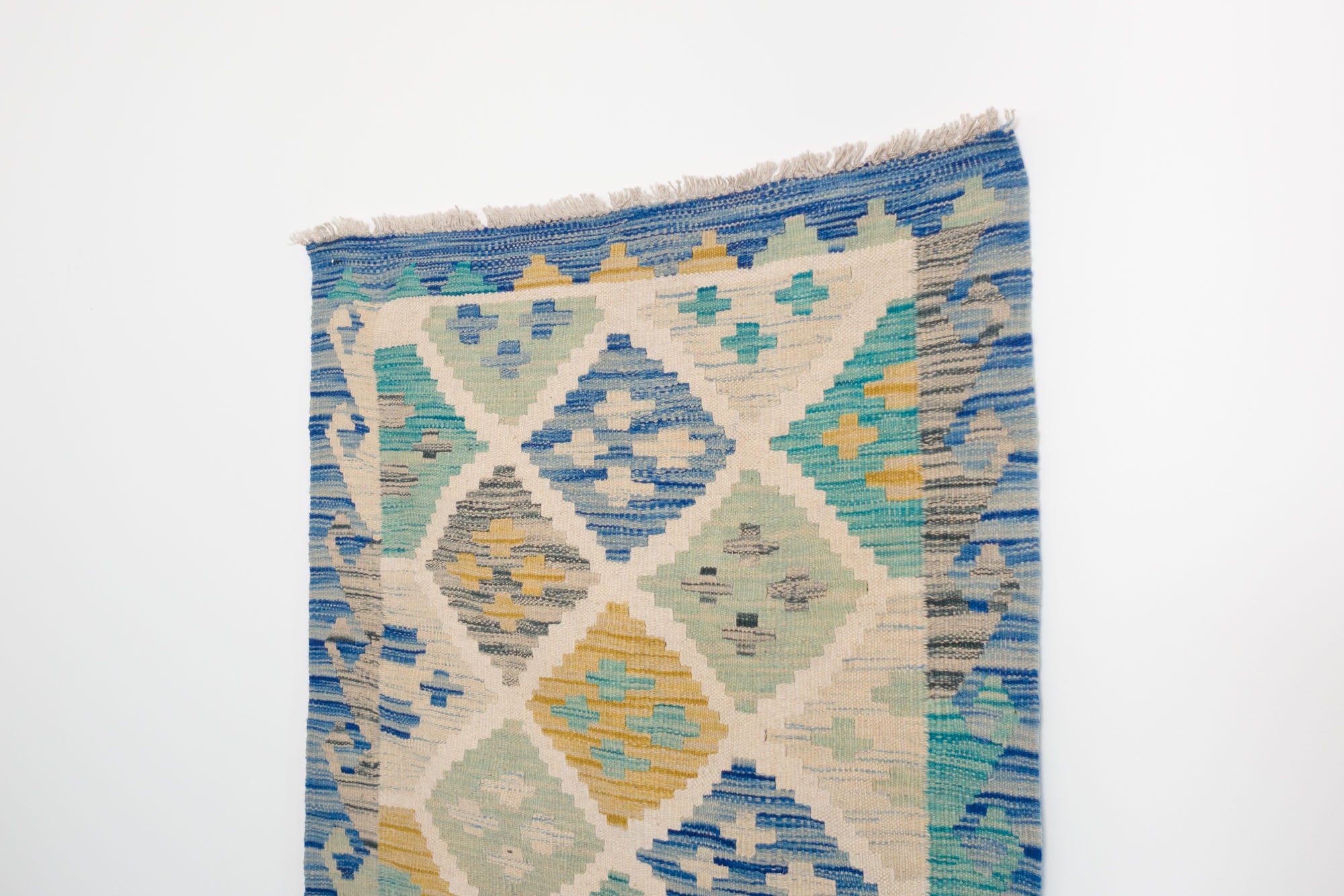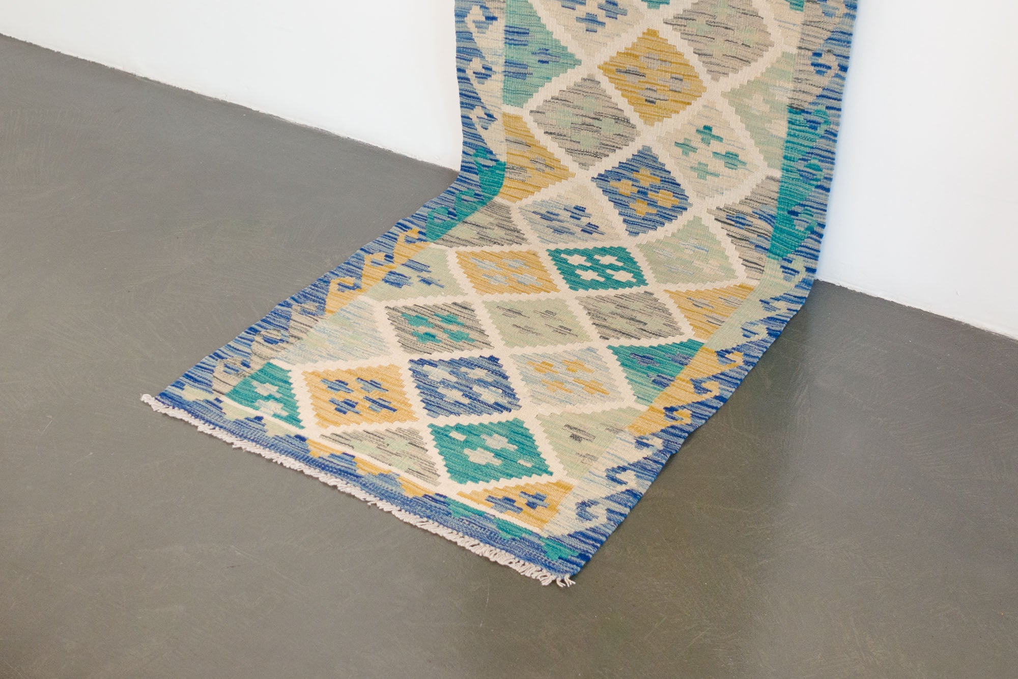 name: Binayorigin: Turkeystyle: kilim, runner, rug, carpetmaterial: hand woven woolcolors: blue, yellow, teal, gray, cream, tanage: vintage, 1940-1970condition: good, age related wear - see picturesappraised value: $832