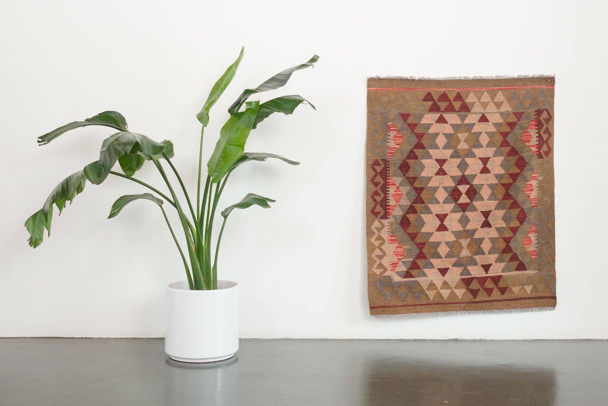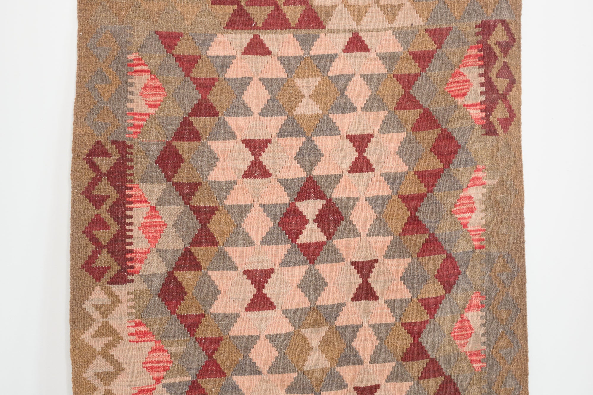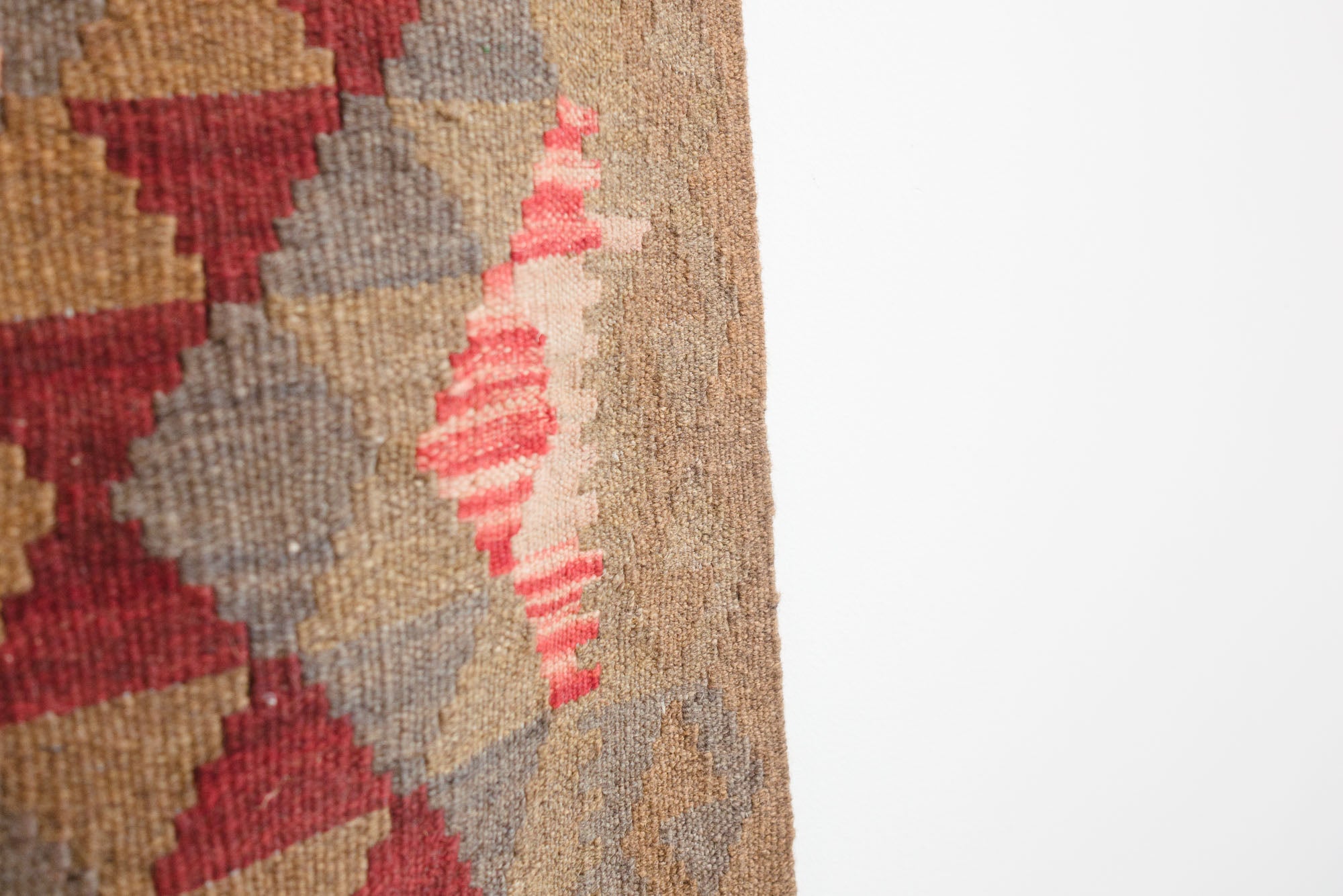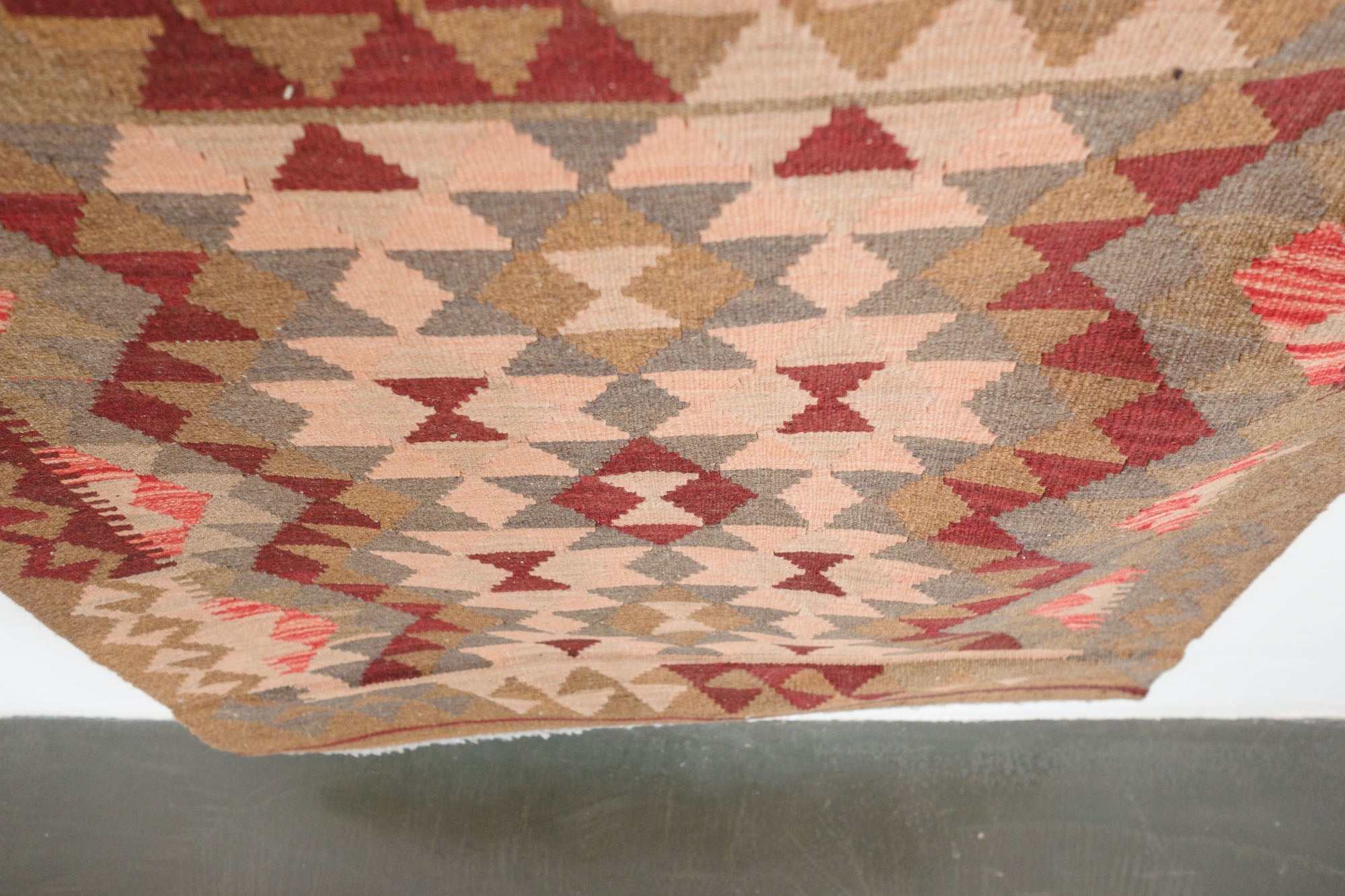 name: Beyazorigin: Turkey, Kashkolistyle: flat weave, kilim, rug, carpetmaterial: hand woven wool color: red, pink, brown, tan, grayage: vintage, 1940-1969condition: good, age related wear - see picturesappraised value: $488