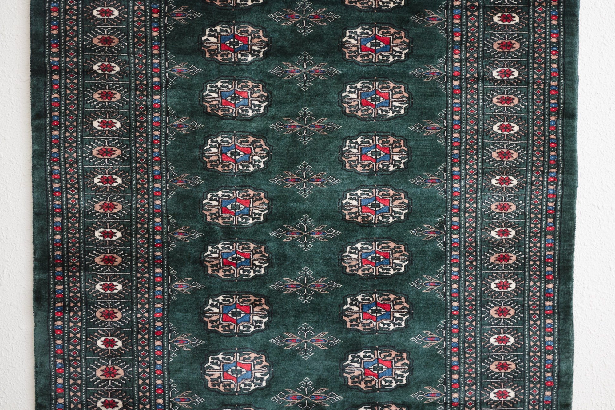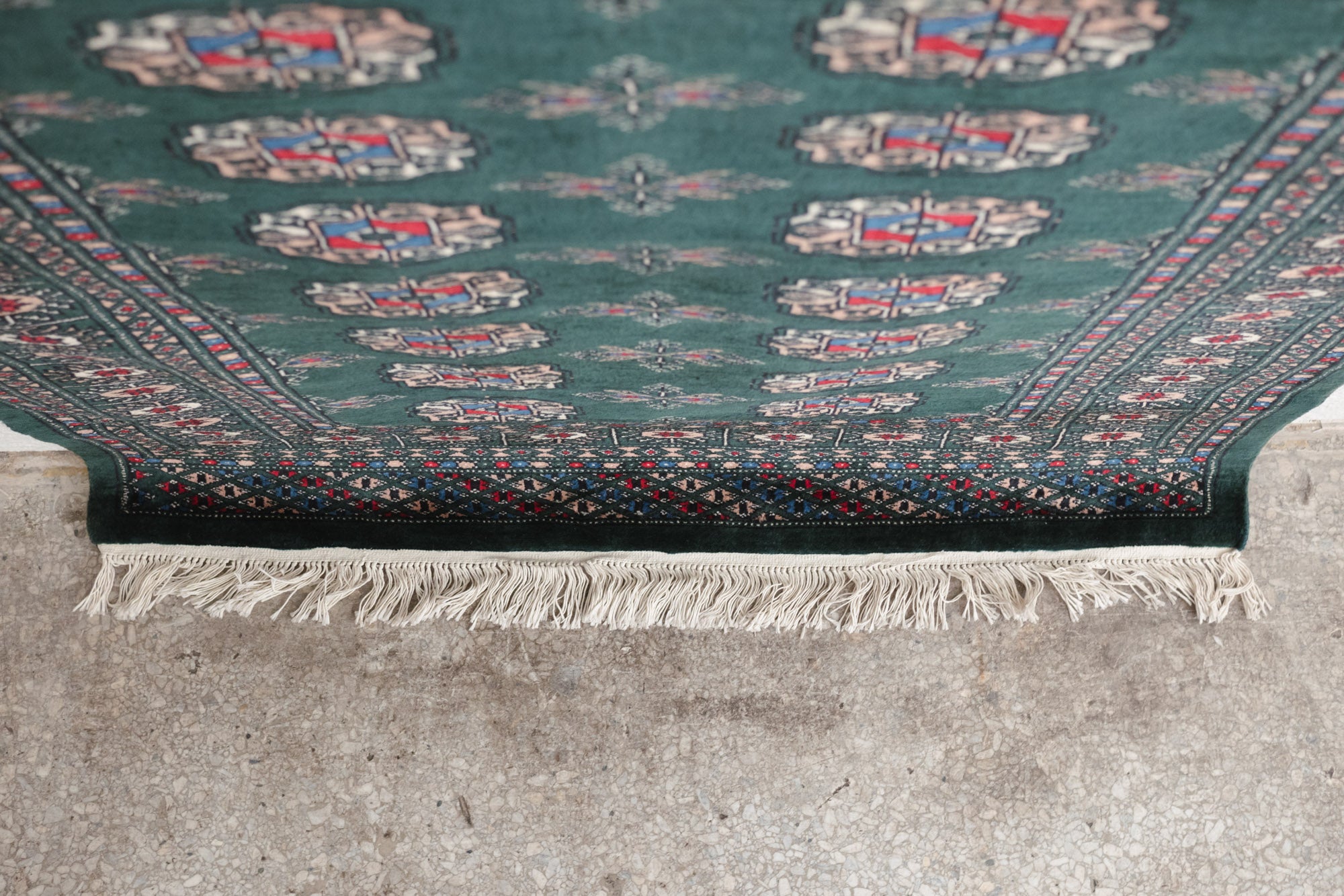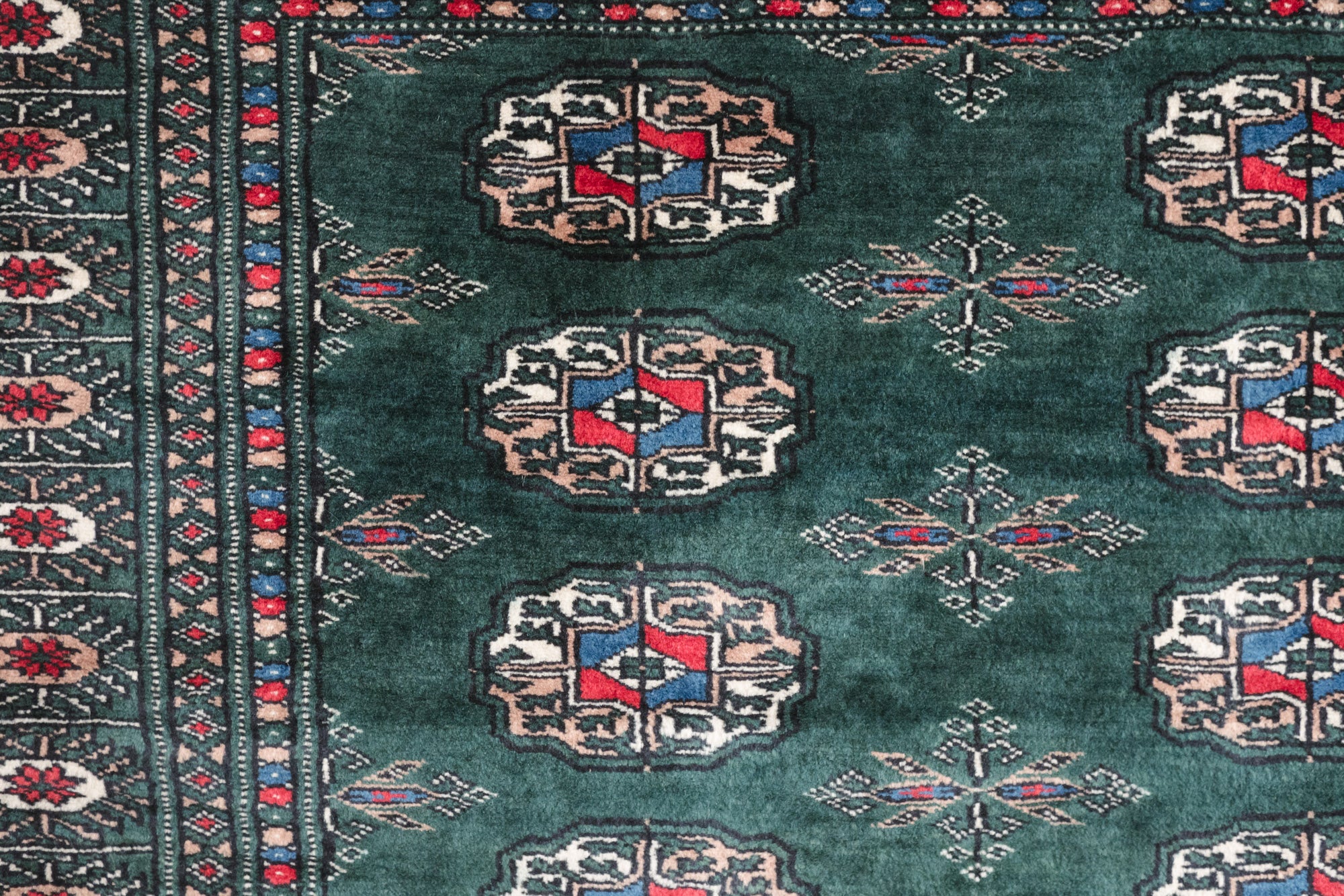 name: Korin style: hand knotted, Pakistani, Peshawar, Bokhara, rug, carpet material: wool colors: red, camel, cream, black, blue, dark green age: new condition: good, age related wear - see pictures
