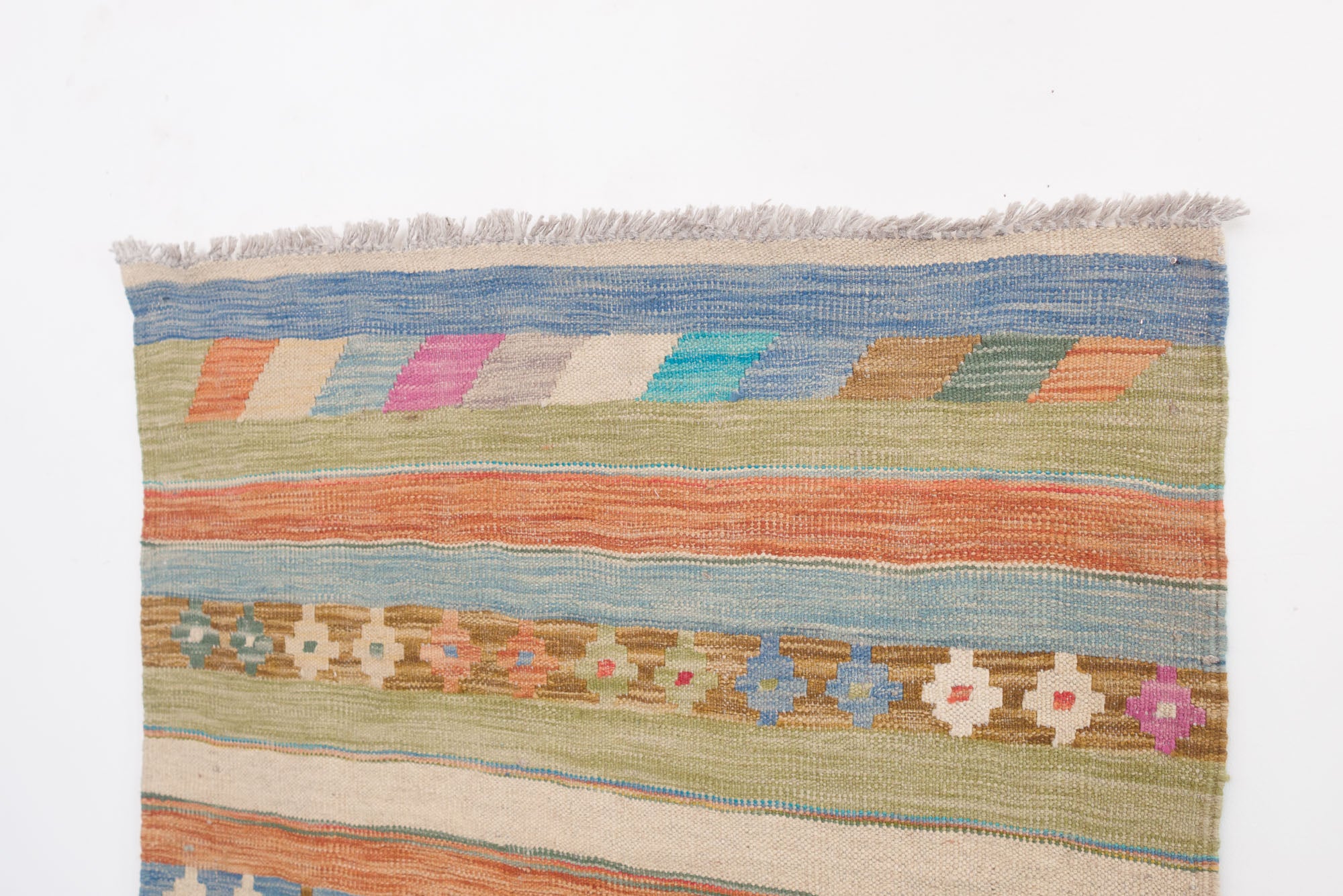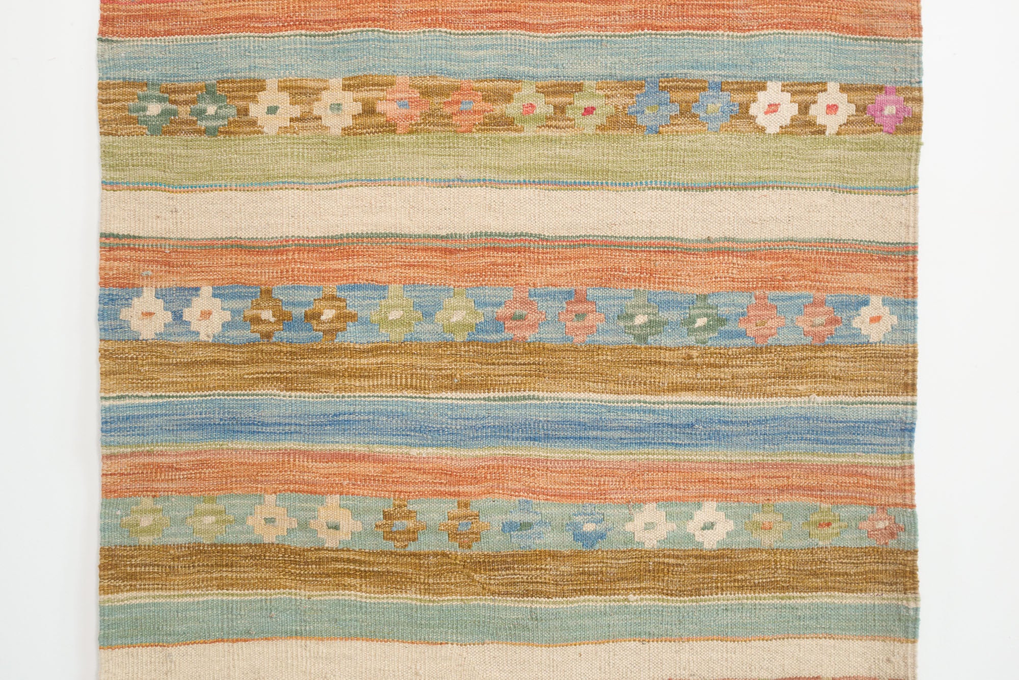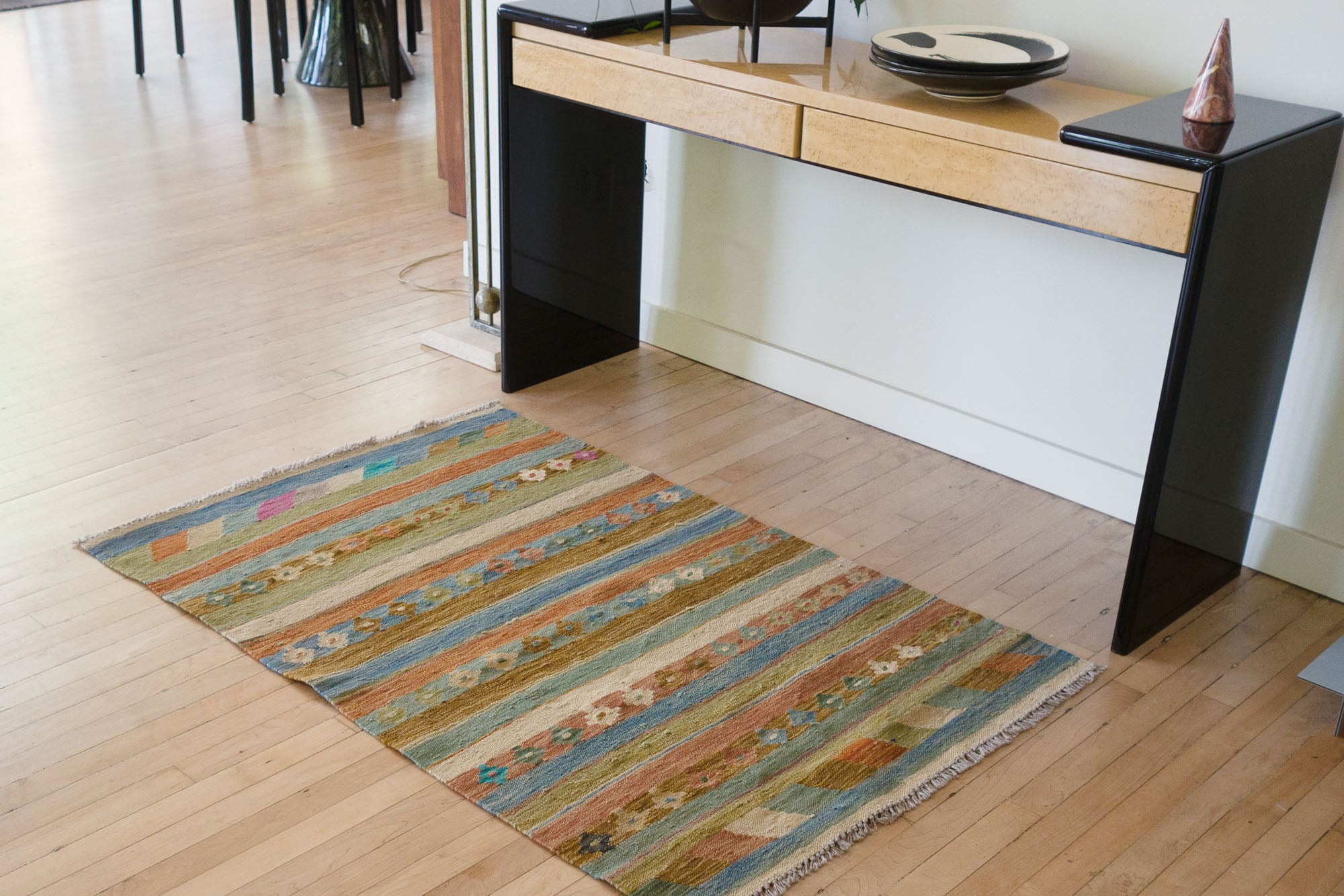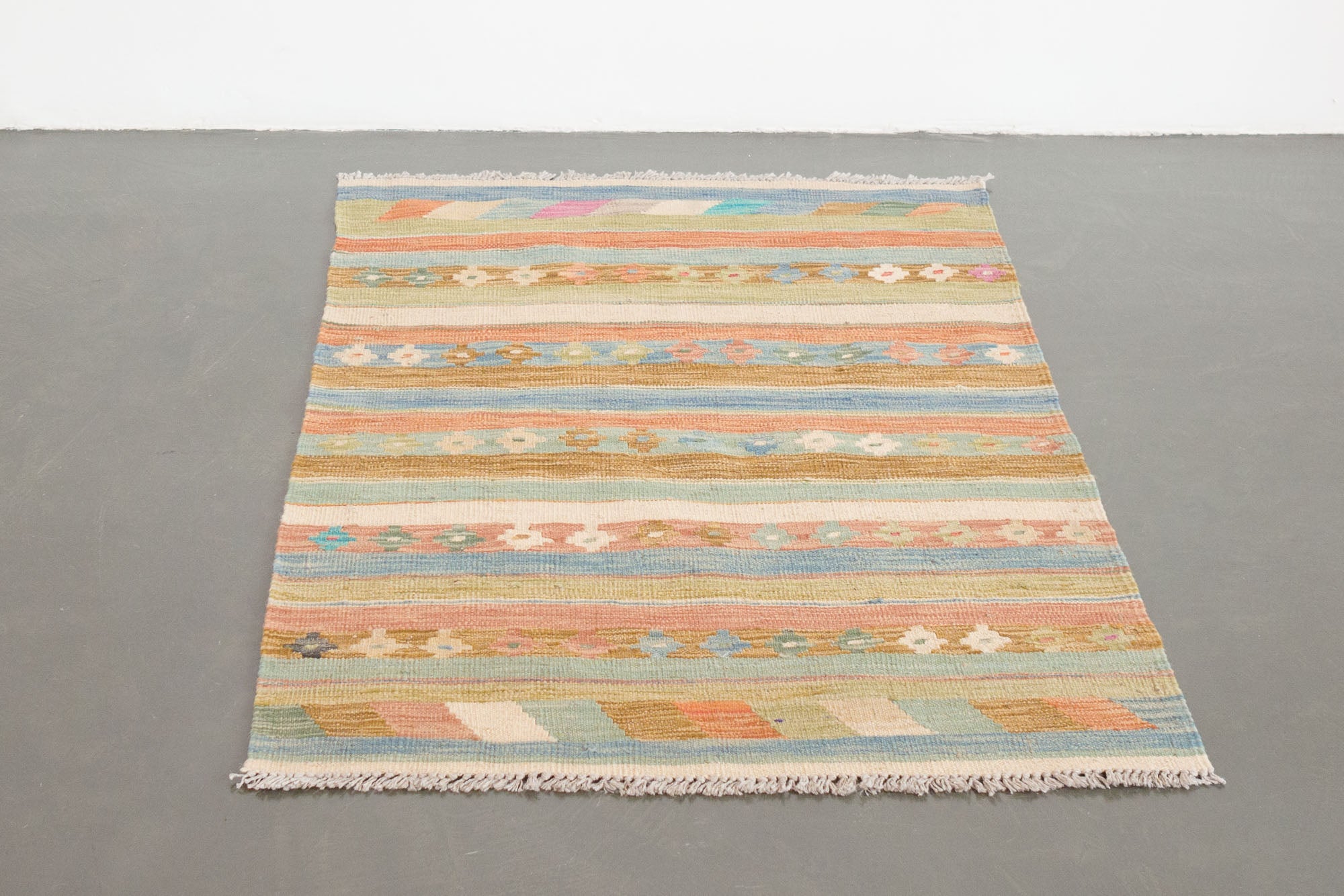 name: Asimorigin: Turkey, Kashkulistyle: flat weave, kilim, rug, carpetmaterial: hand woven wool color: pink, blues, greens, cream, orange age: vintage (1940-1969)condition: good, age related wear - see picturesappraised value: $564