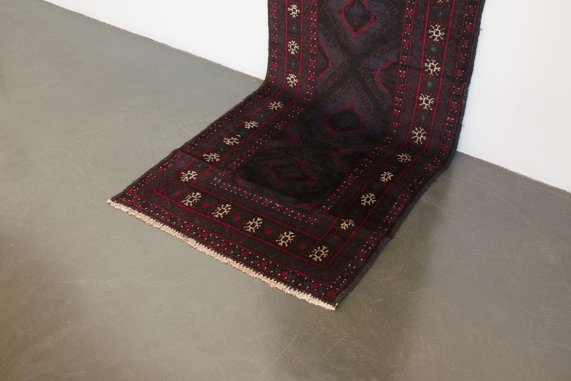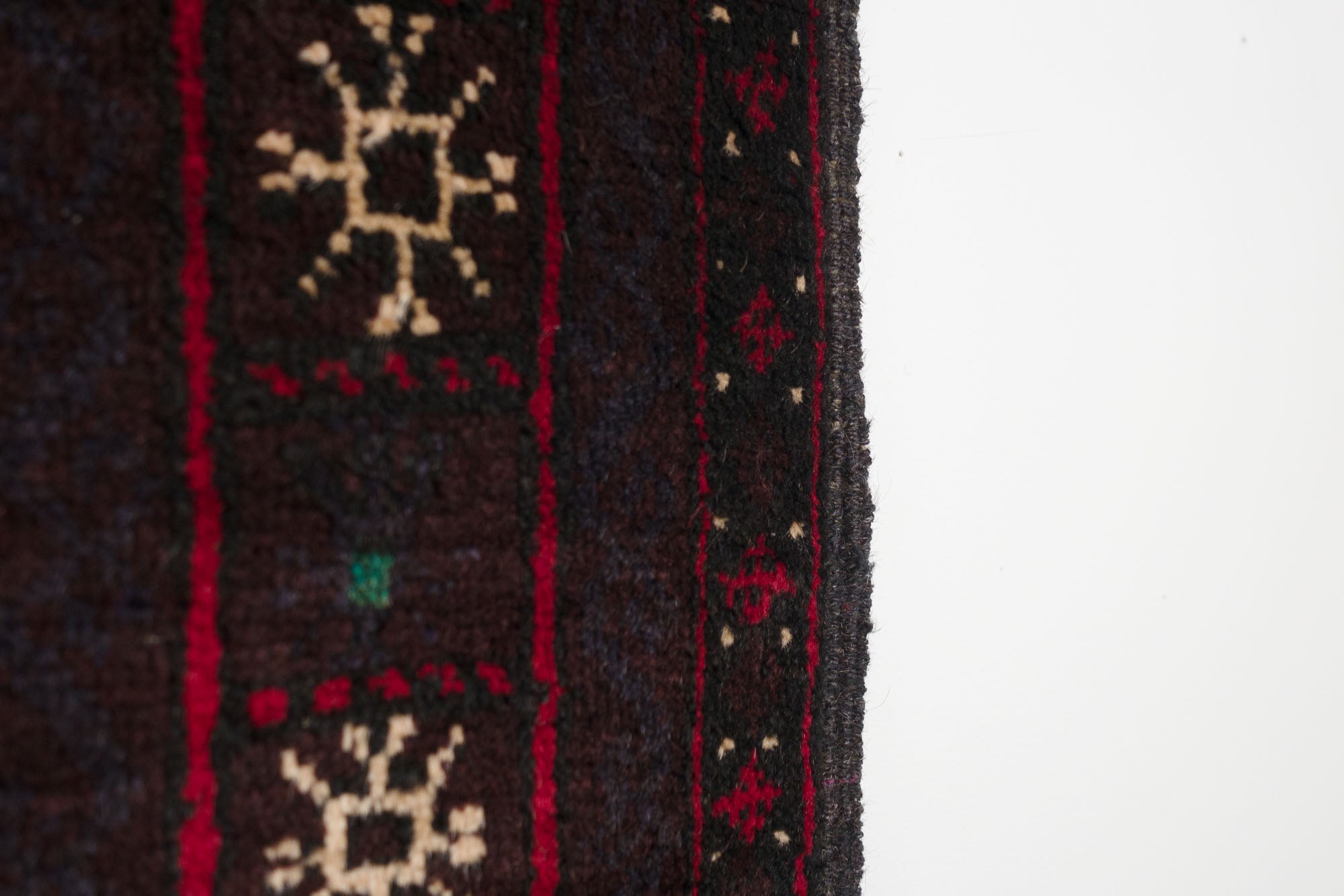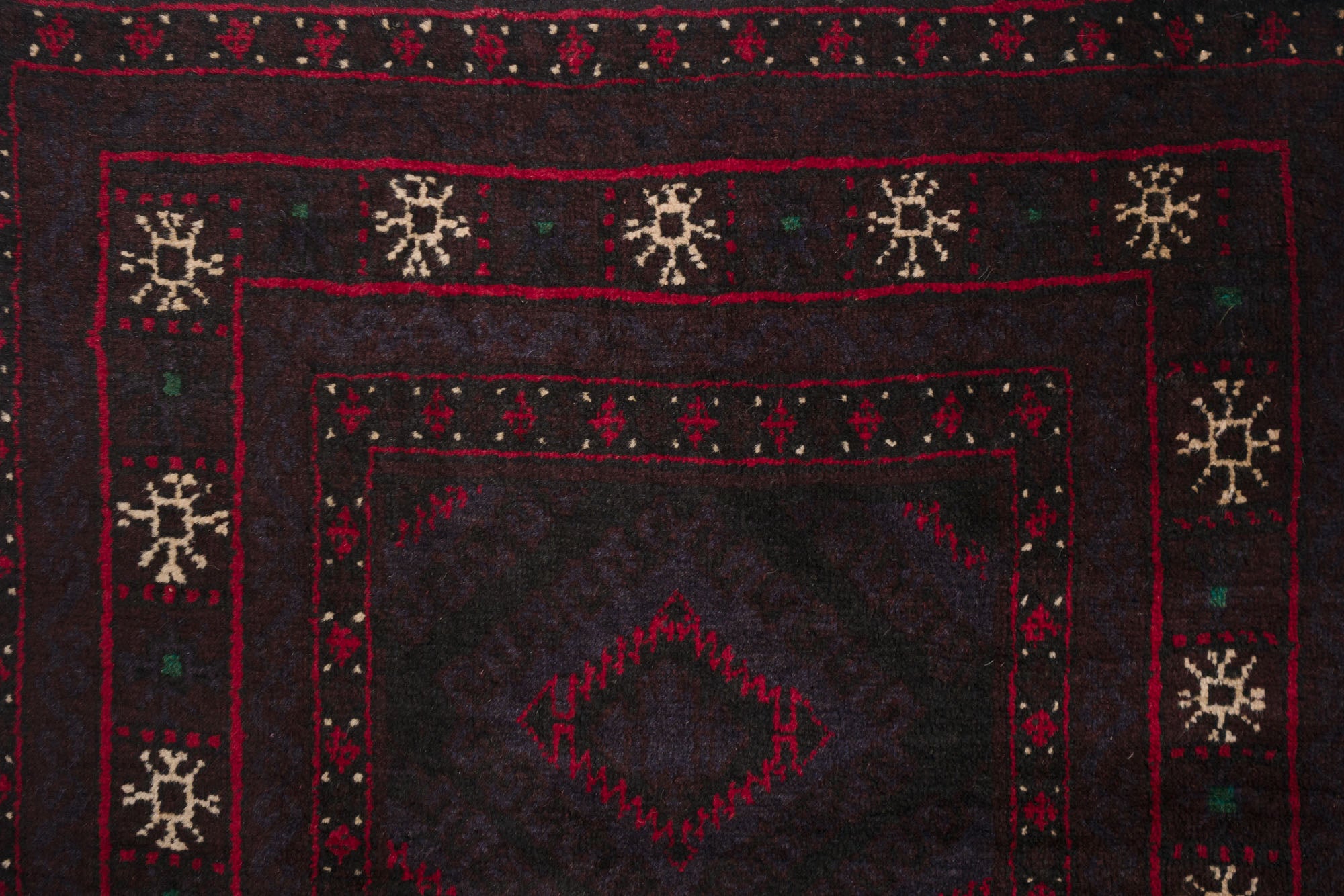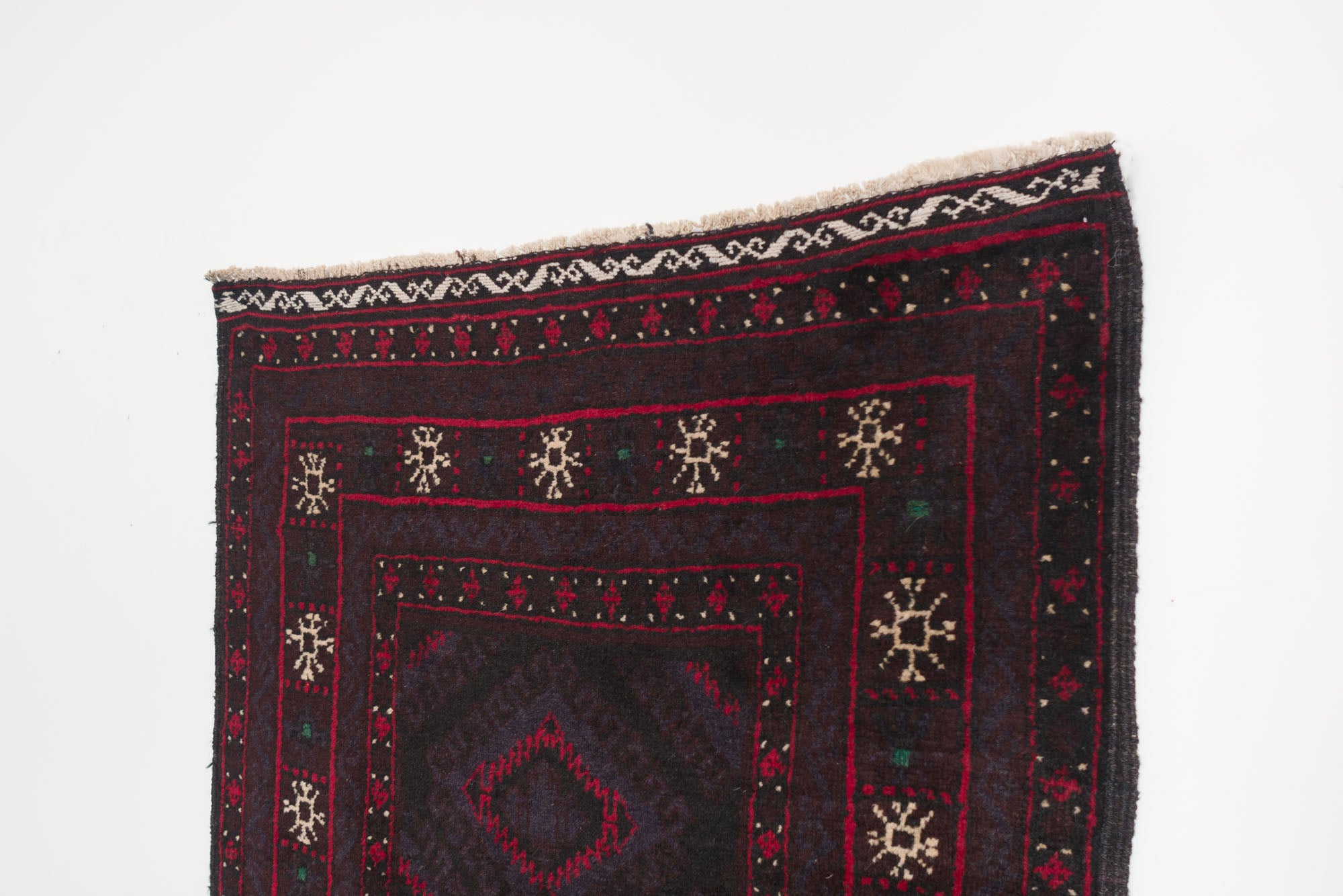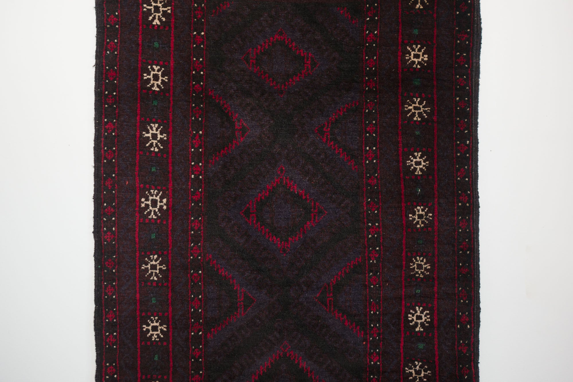 name: Rehaorigin: Afghanistanstyle: rizbaft, runner, rug, carpetmaterial: hand knotted woolcolors: red, brown, navy, cream, green, blackage: vintage, 1940-1969condition: good, age related wear - see picturesappraised value: $1104sku: a-422