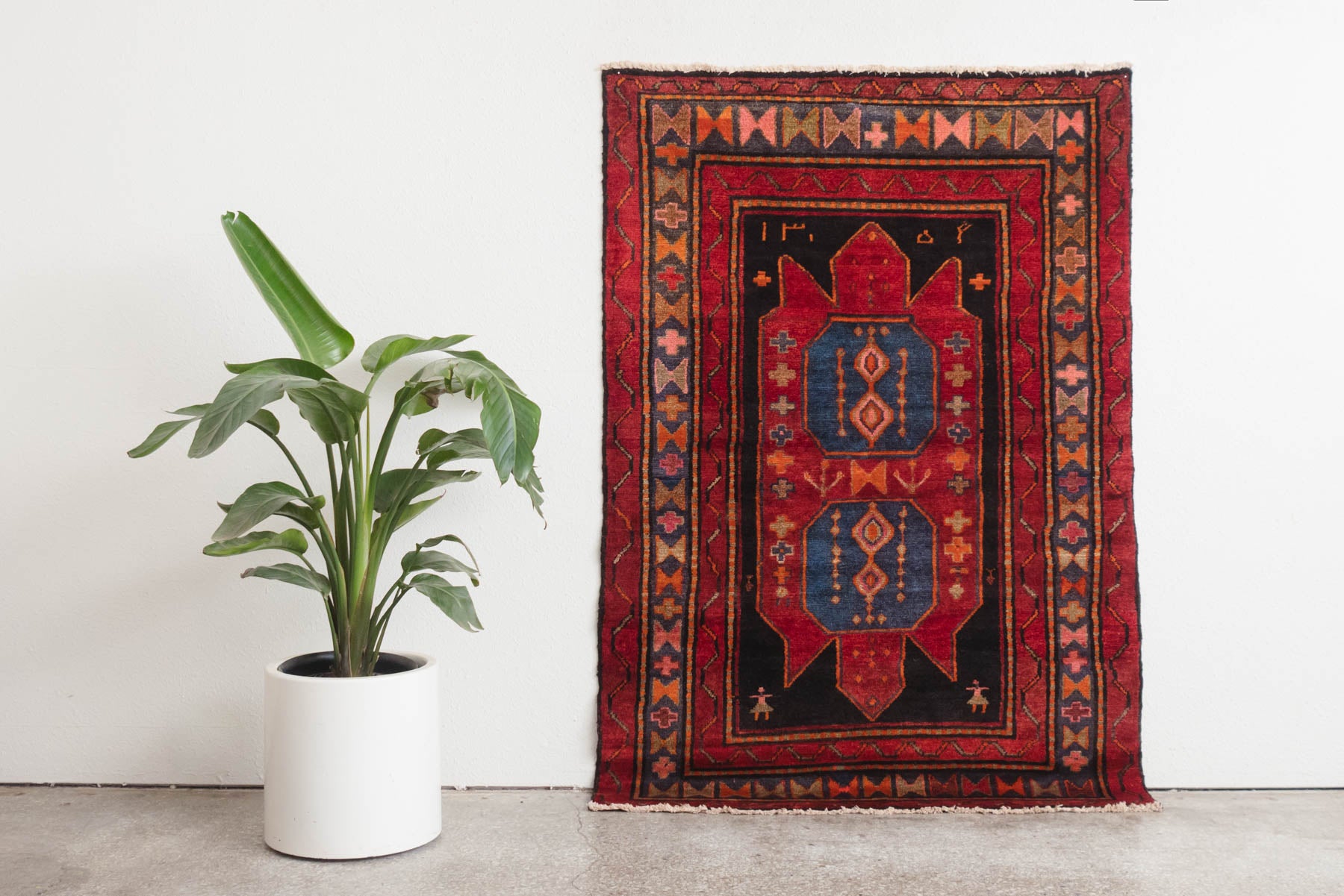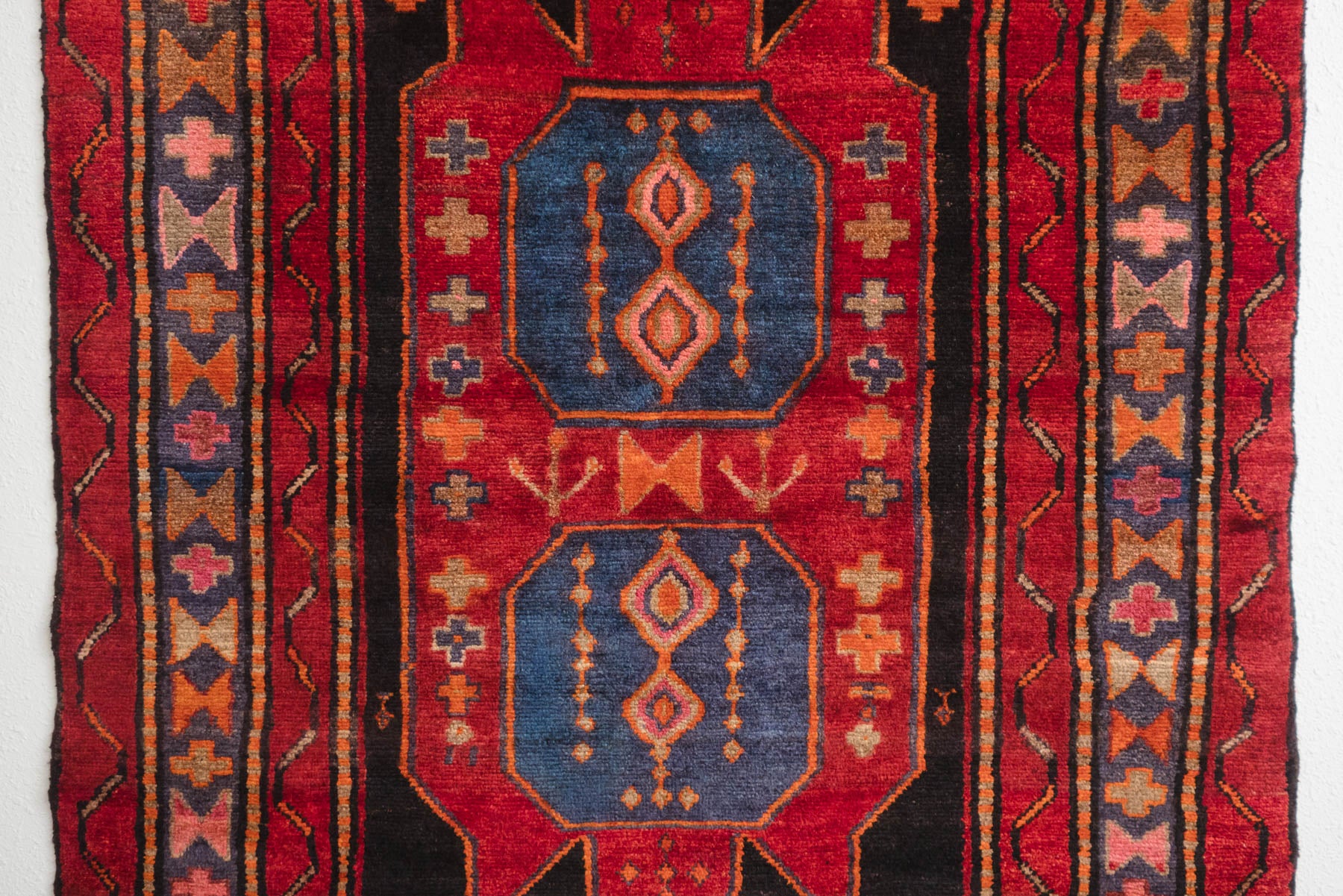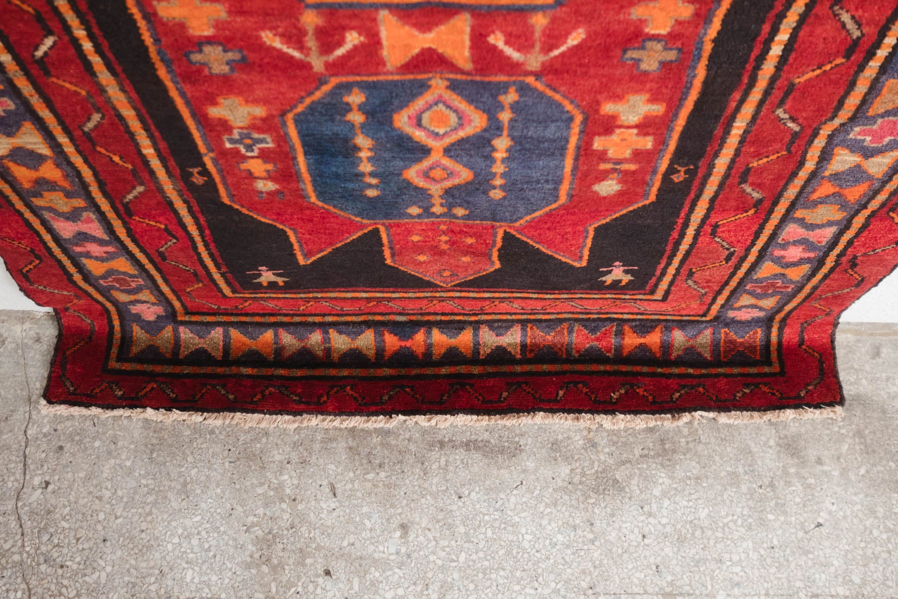 name: Behnamstyle: hand knotted, Persian, rug, carpet material: woolcolors: red, orange, navy, black, burgundy, brown, pinkage: vintage condition: good, age related wear - see pictures
