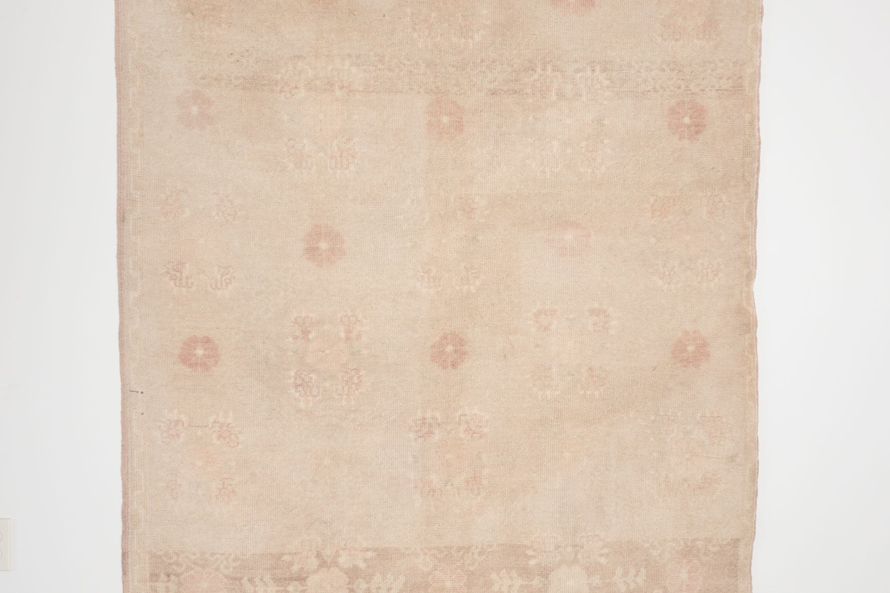 name: Berrinstyle: hand knotted, Turkish, sunwashed, rug, carpetmaterial: woolcolors: pink, tan, cream, camelage: vintage condition: good, age related wear - see pictures