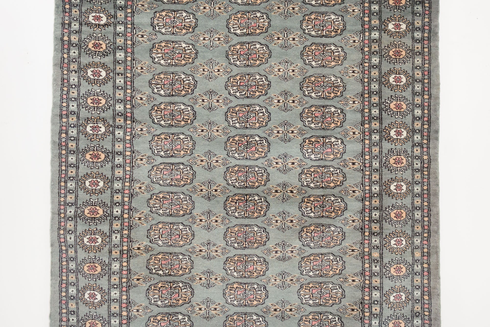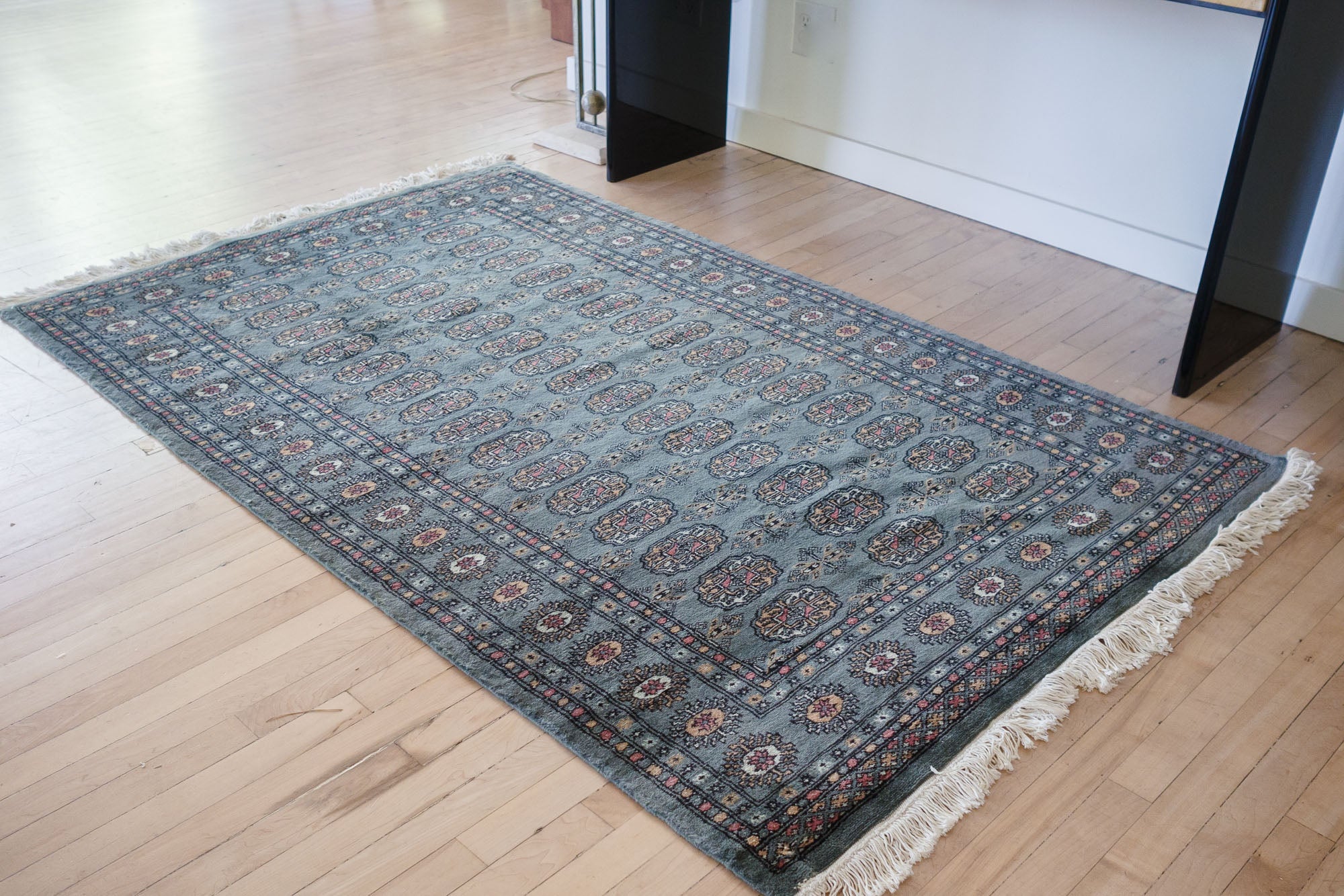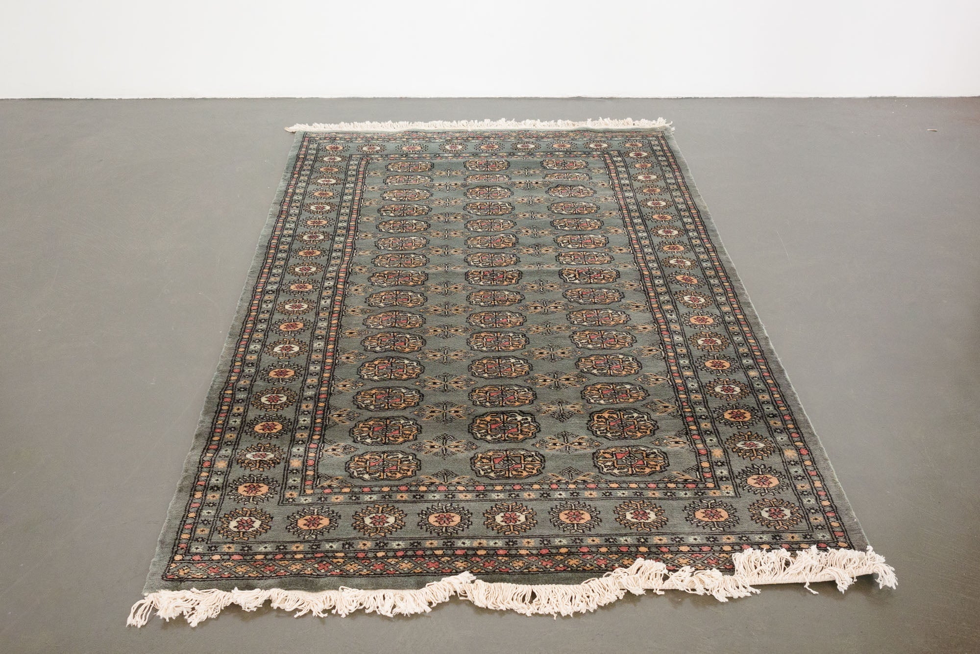 name: Jabeerorigin: Pakistanstyle: Peshawar Bokhara, rug, carpetmaterial: hand knotted woolcolors: green, pink, black, cream, tanage: vintagecondition: good, age related wear - see picturesappraised value: $1,000