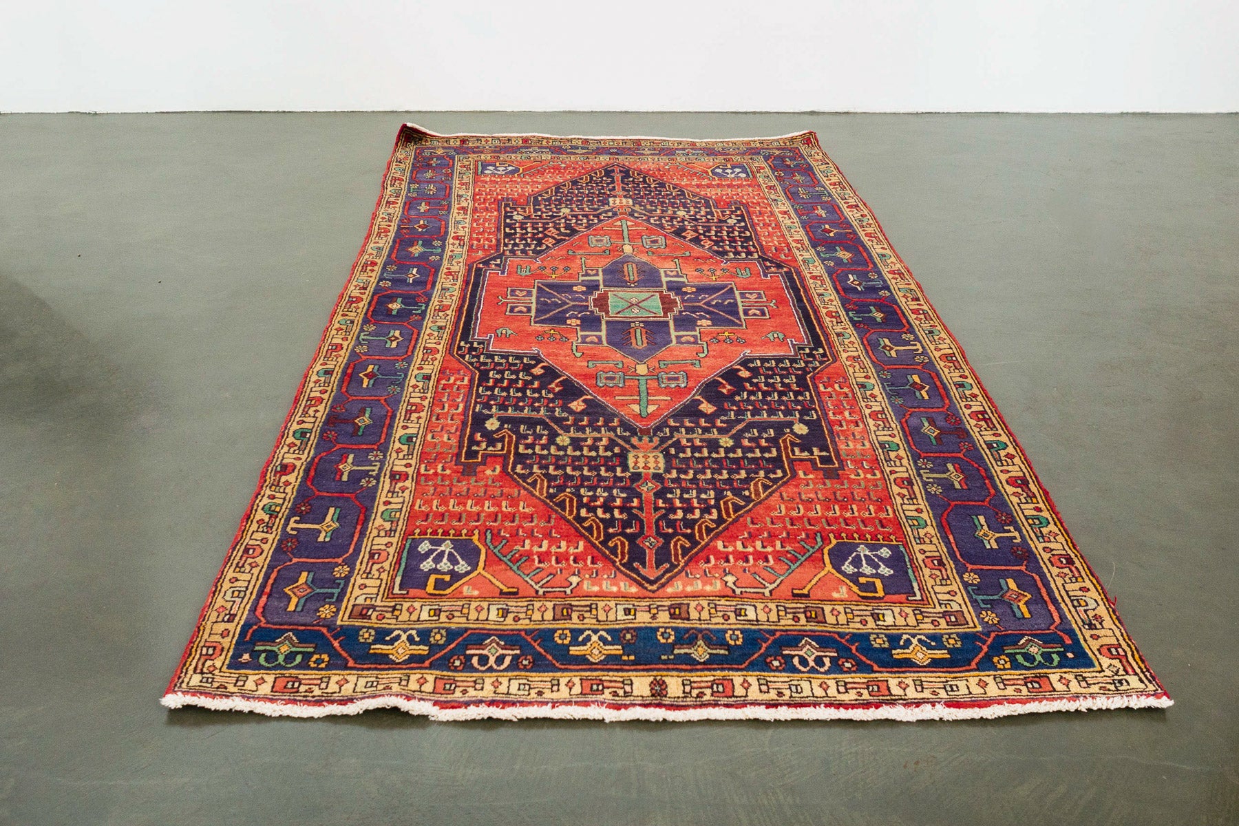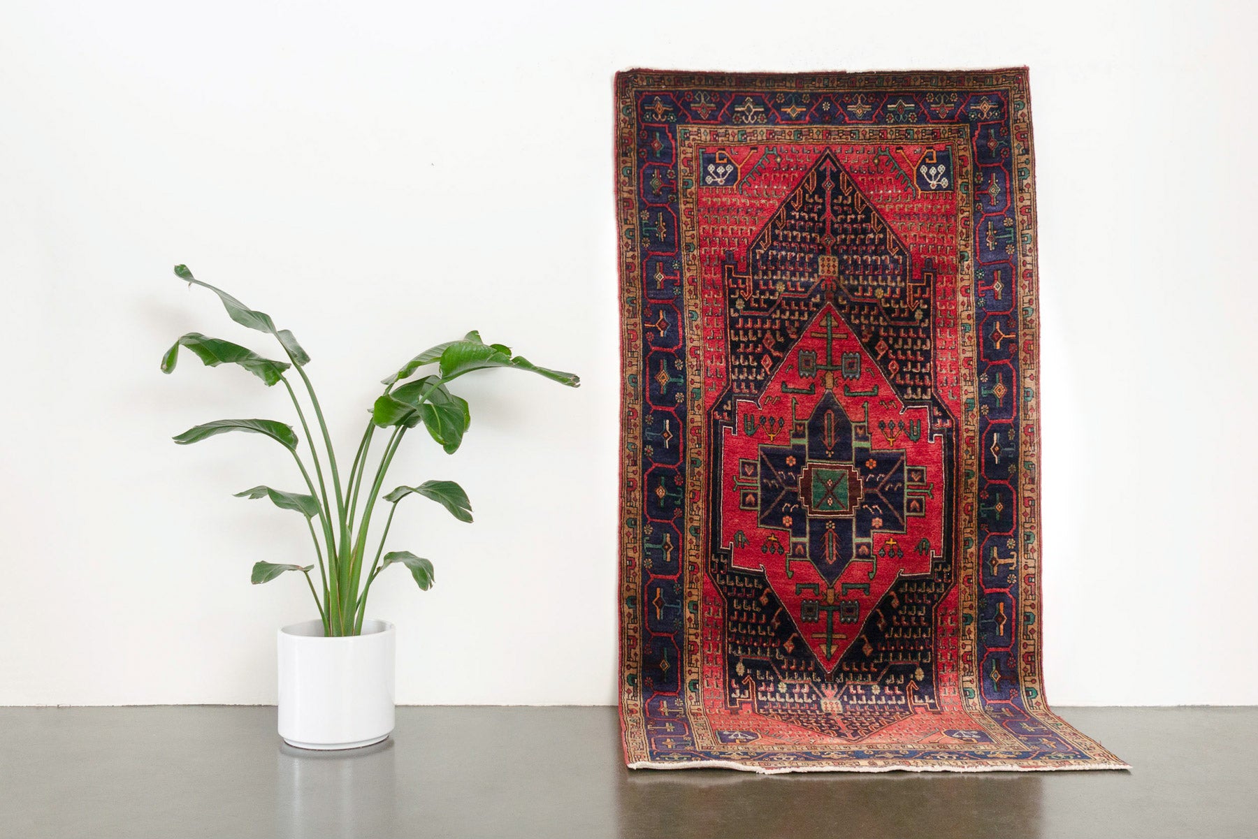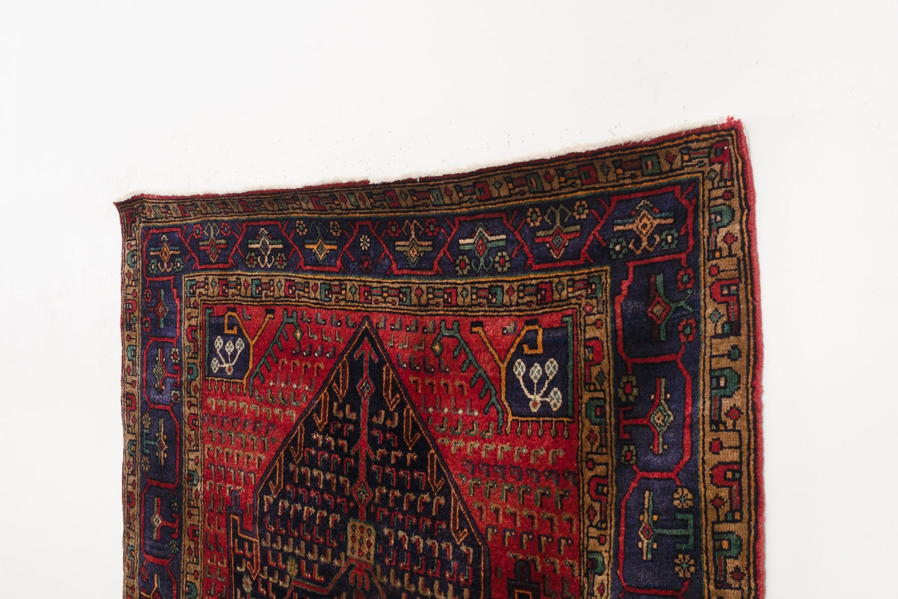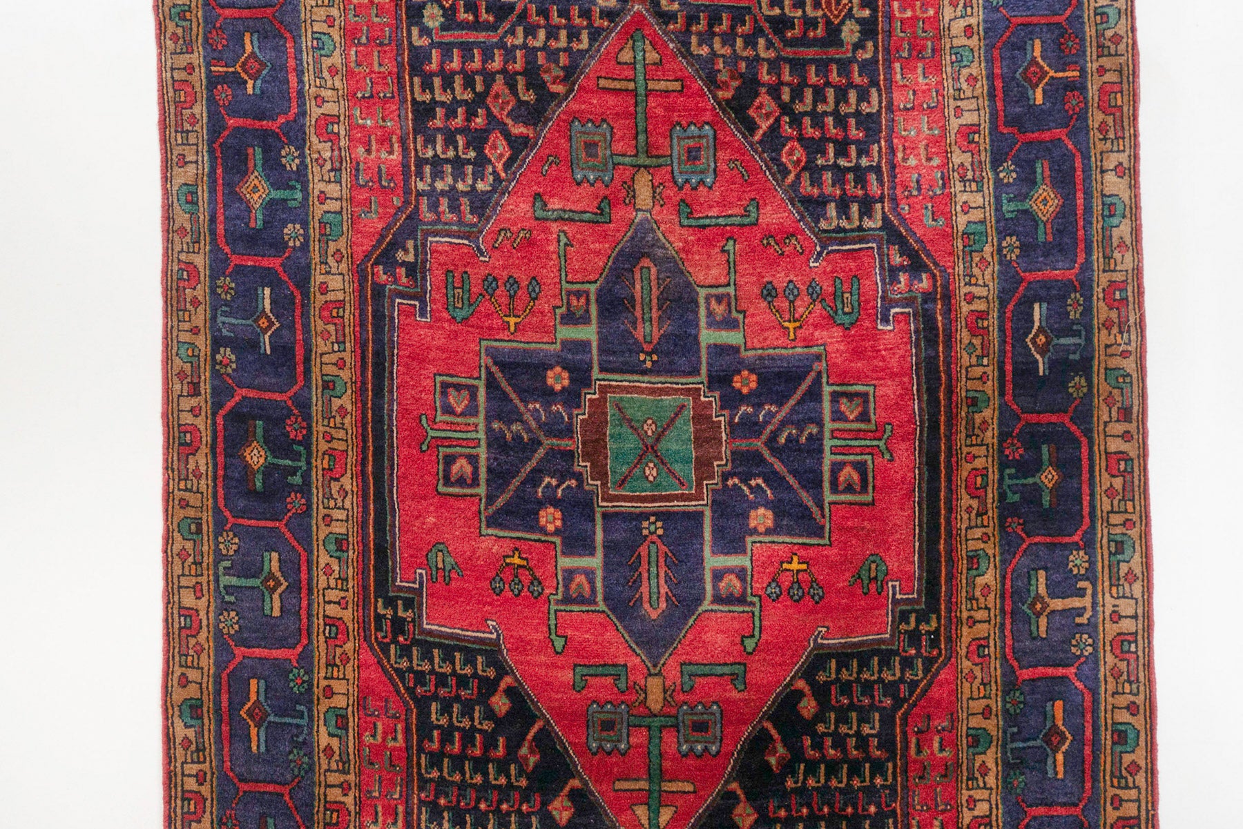 name: Bastamorigin: Iran (Persian), Nahavandstyle: runner, rug, carpetmaterial: hand knotted woolcolors: red, navy, green, camel, oranges, browns, creamage: vintage, 1940-1970condition: good, age related wear - see picturesappraised value: $2,756