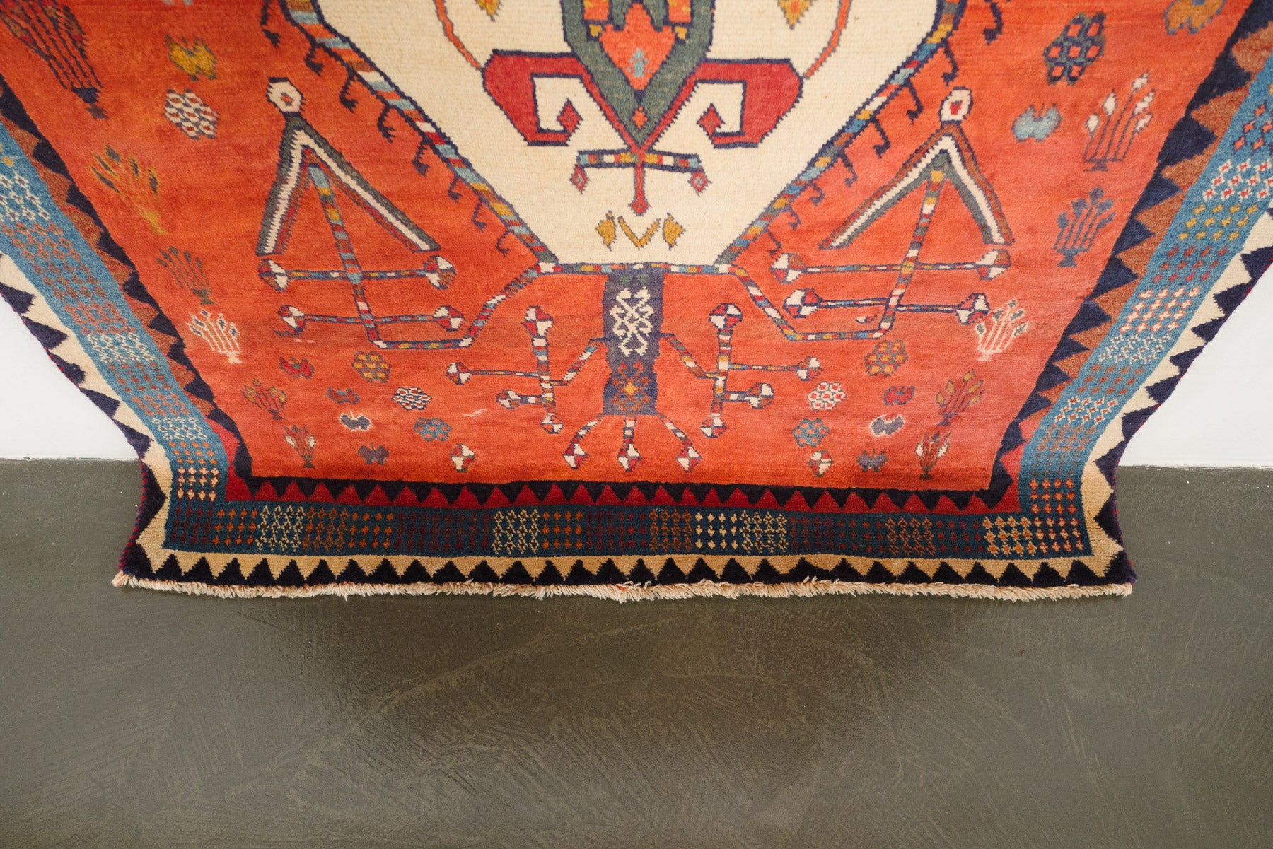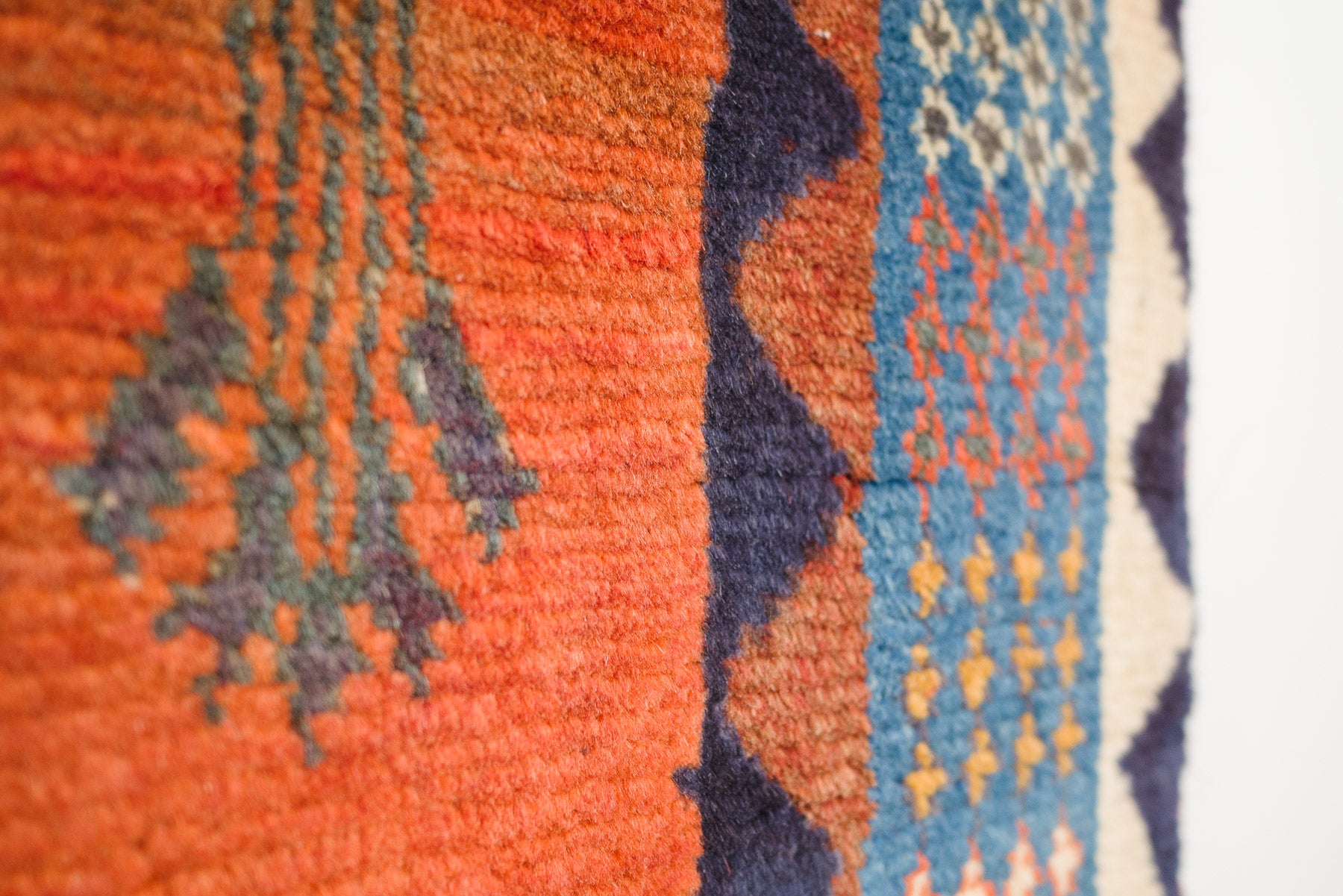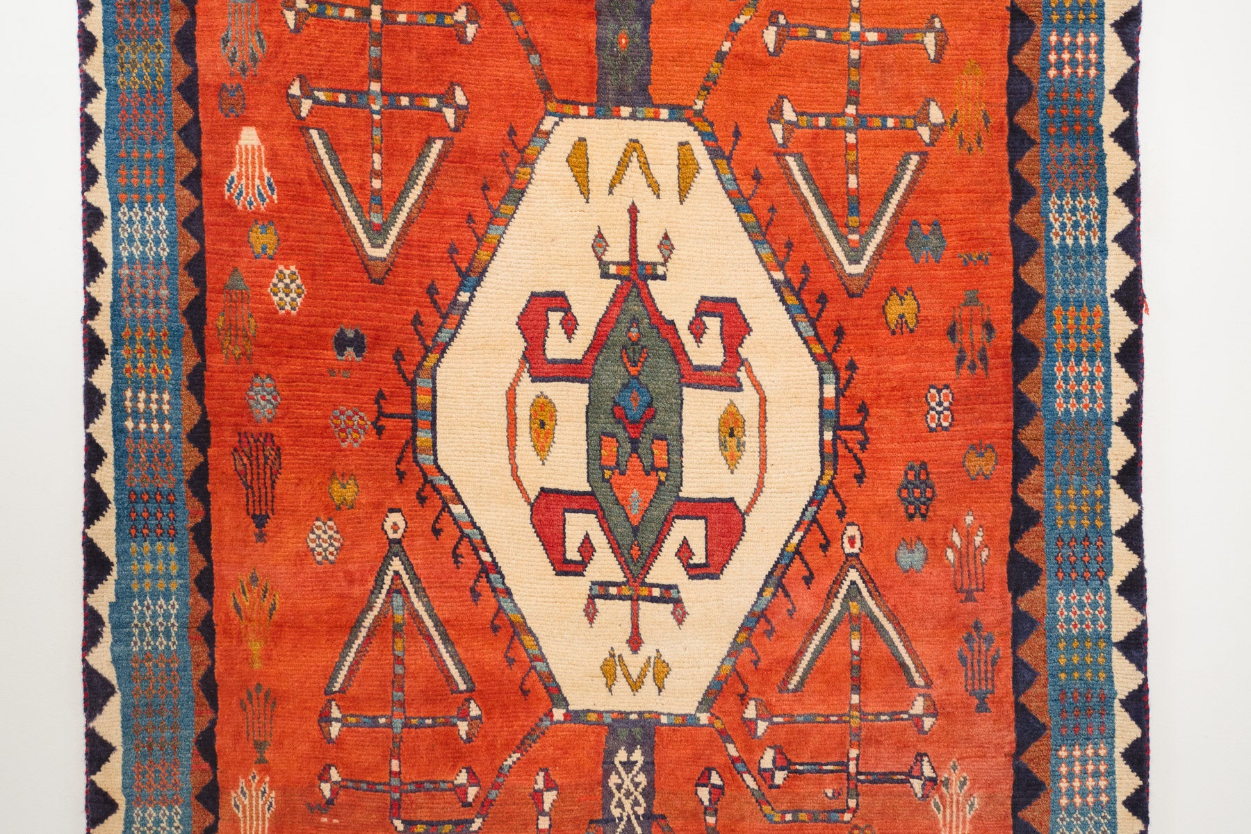 name: Bavandorigin: Iran (Persian), Gabbehstyle: runner, rug, carpetmaterial: hand knotted woolcolors: red, orange, cream, blue, navy, yellow, grayage: vintage, 1940-1970condition: good, age related wear - see picturesappraised value: $1,848