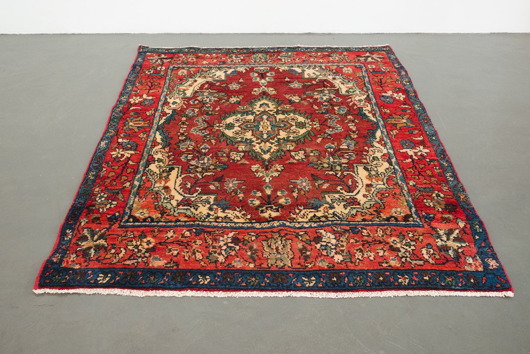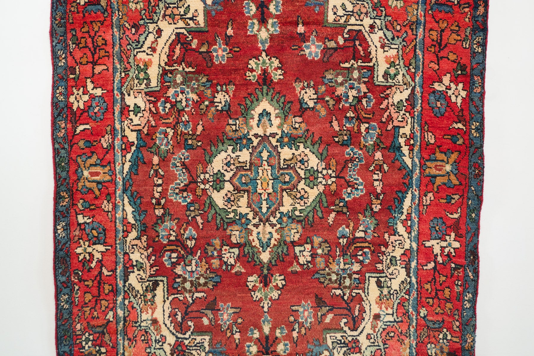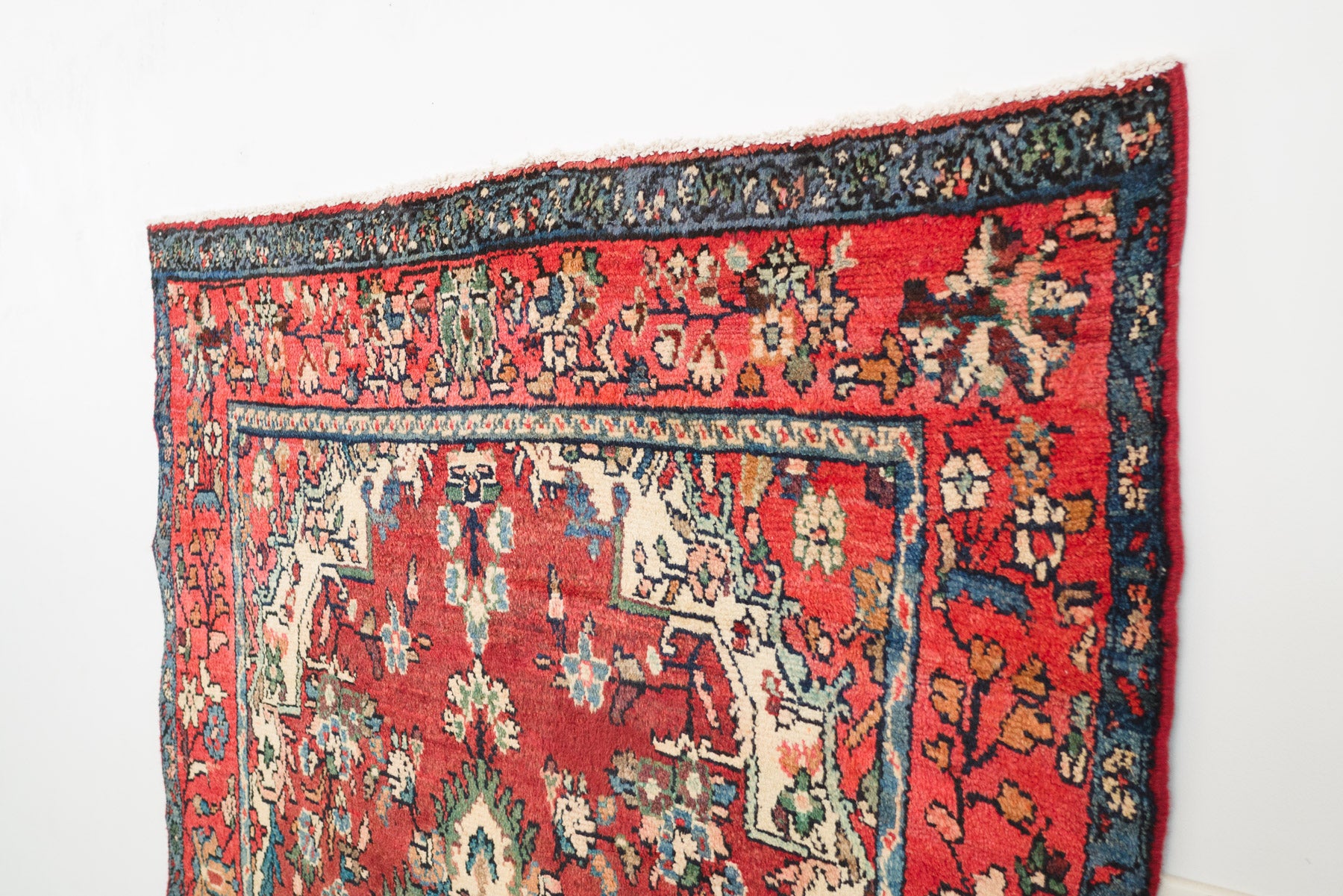 name: Bahmanorigin: Iran (Persian)style: rug, carpetmaterial: hand knotted woolcolors: reds, cream, navy, green, purple, yellow, orangeage: vintage, 1940-1970condition: good, age related wear - see picturesappraised value: $1,980