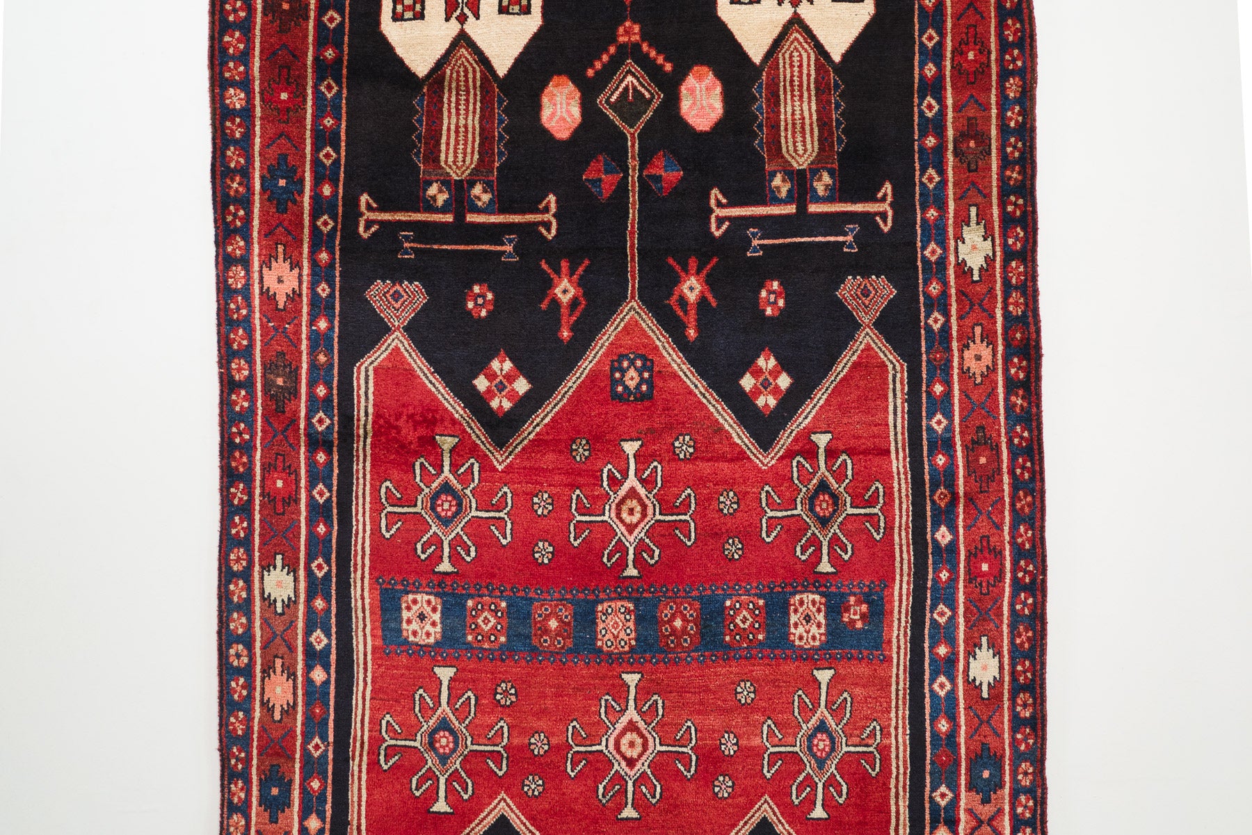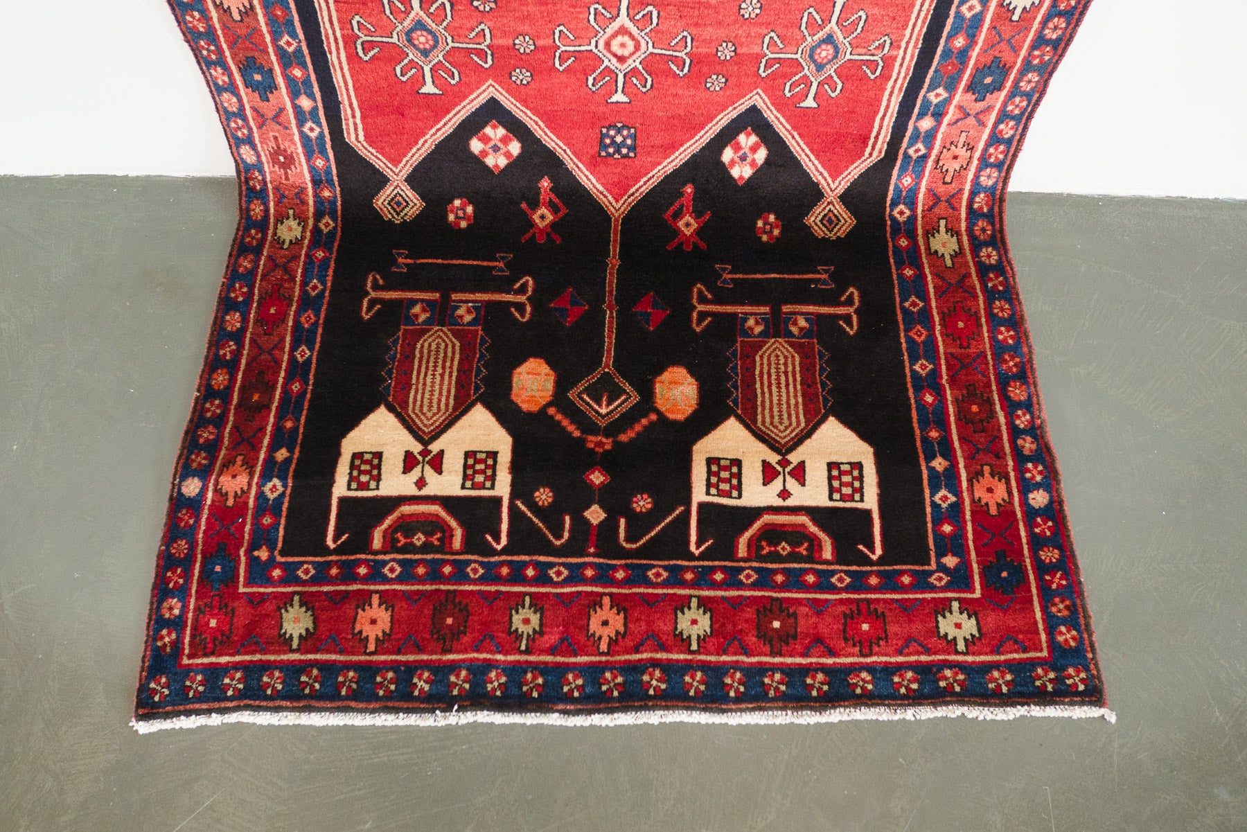name: Bashirorigin: Iran (Persian), Zanjanstyle: runner, rug, carpetmaterial: hand knotted woolcolors: black, red, navy, cream, tan, pinksage: vintage, 1940-1970condition: good, age related wear - see picturesappraised value: $2,684