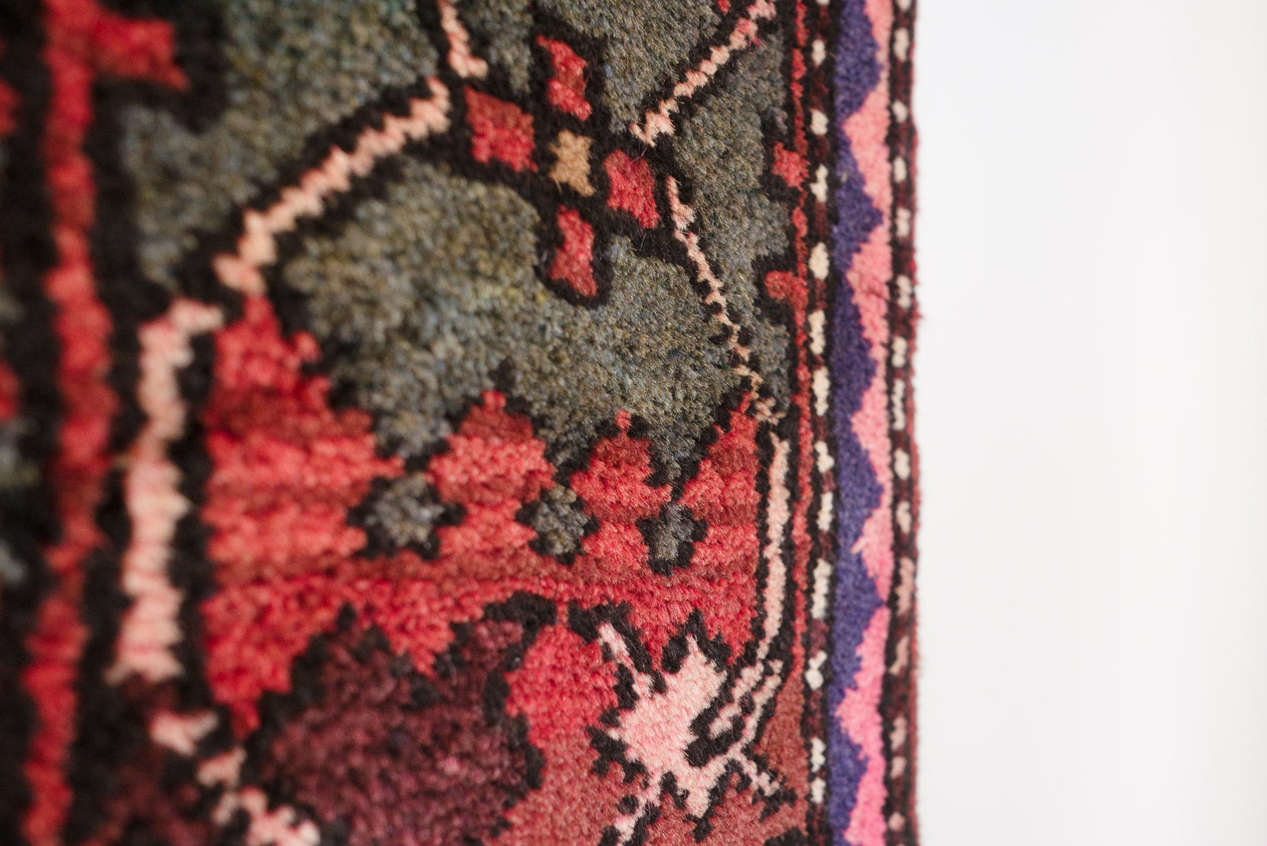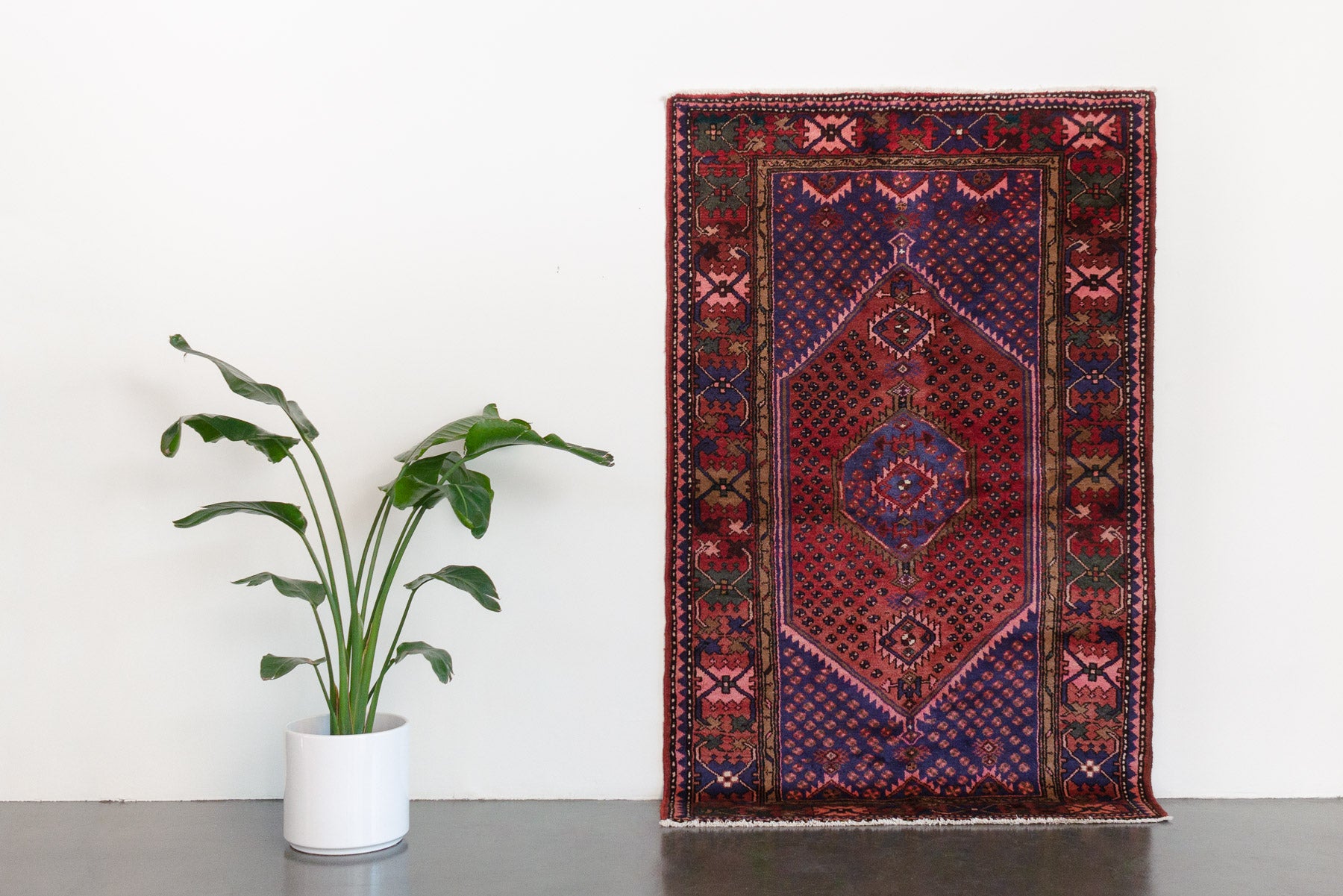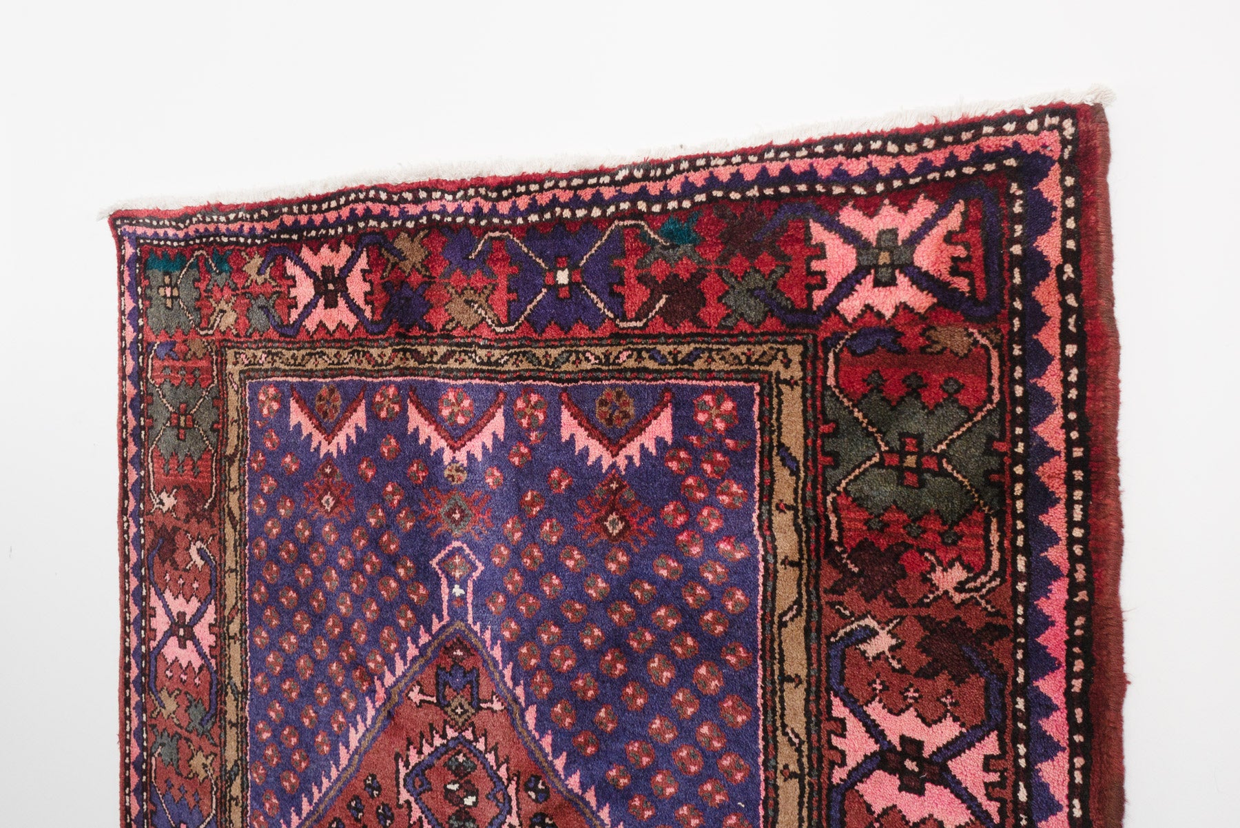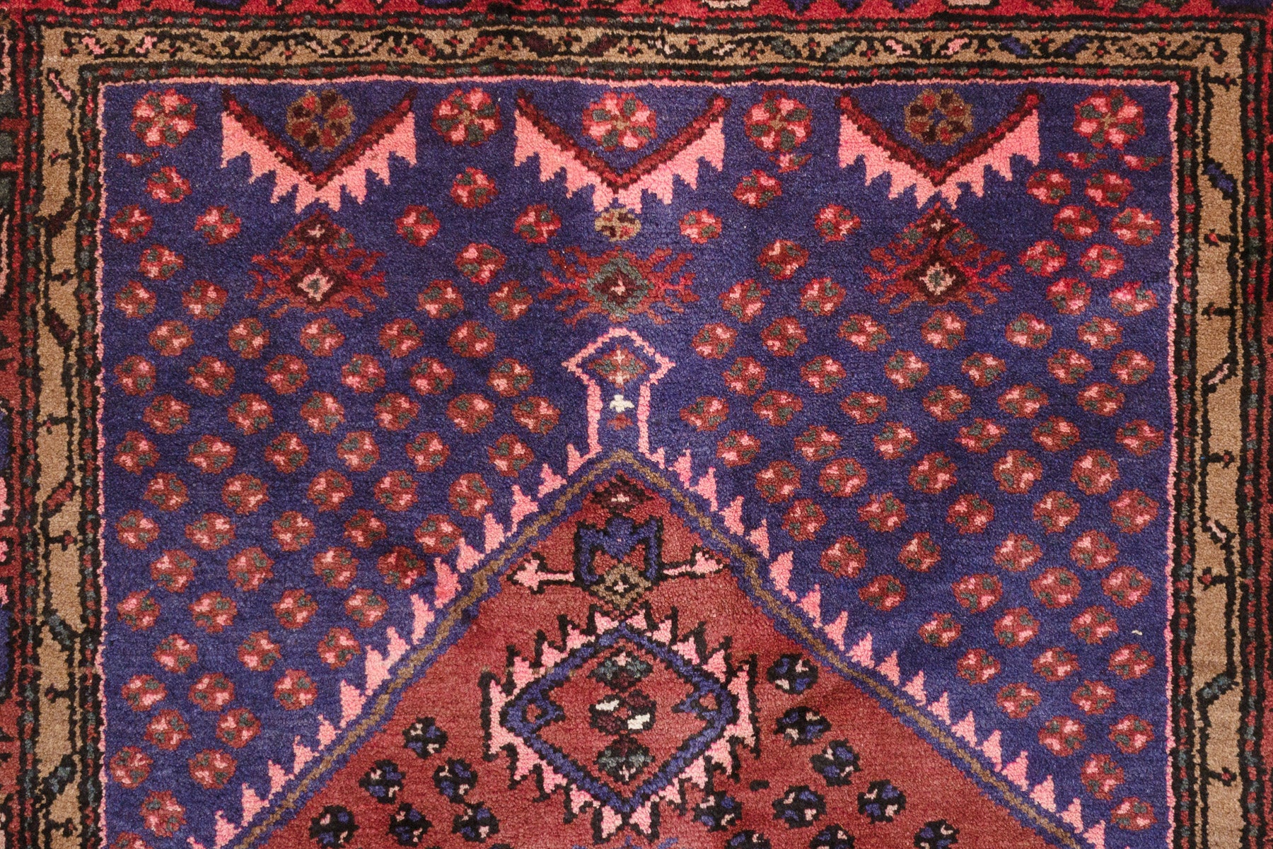 name: Behradorigin: Iran (Persian)style: rug, carpetmaterial: hand knotted woolcolors: navy, reds, pinks, camel, green, creamage: vintage, 1940-1970condition: good, age related wear - see picturesappraised value: $2,632