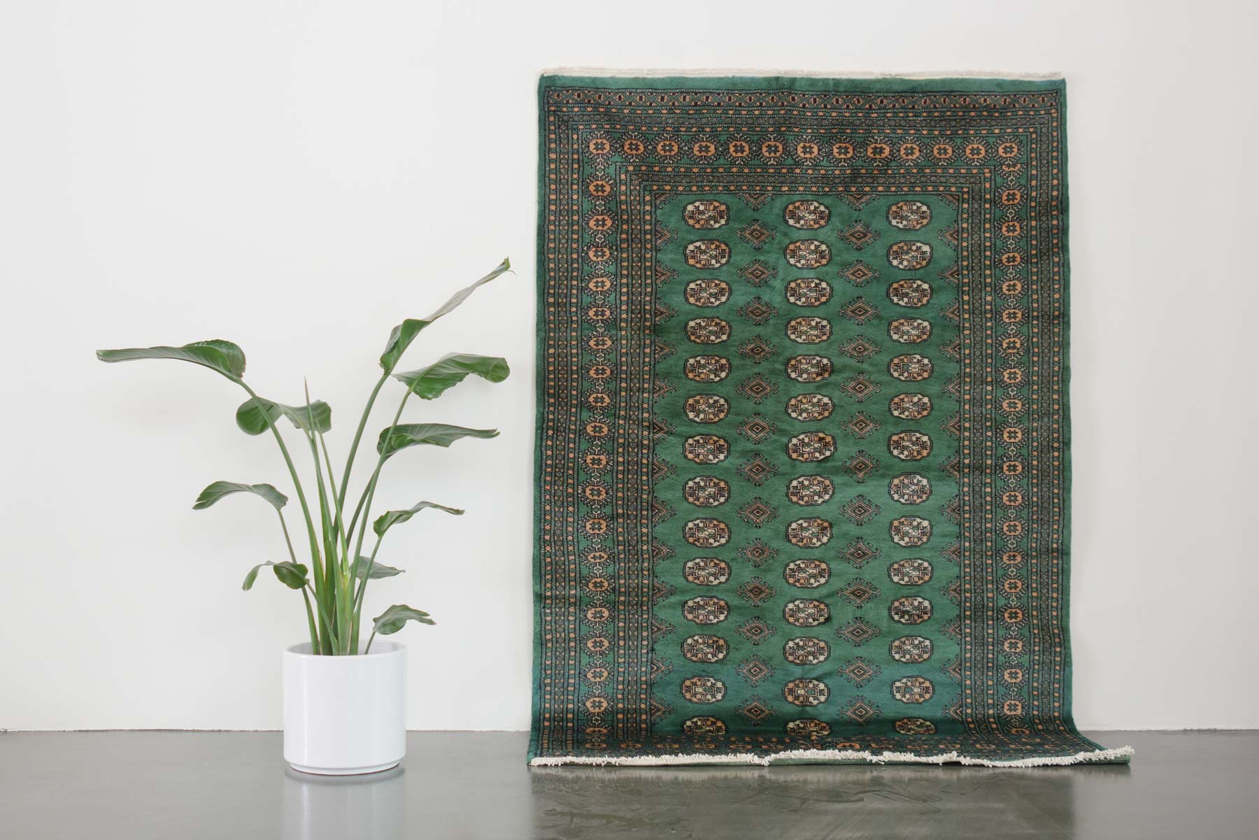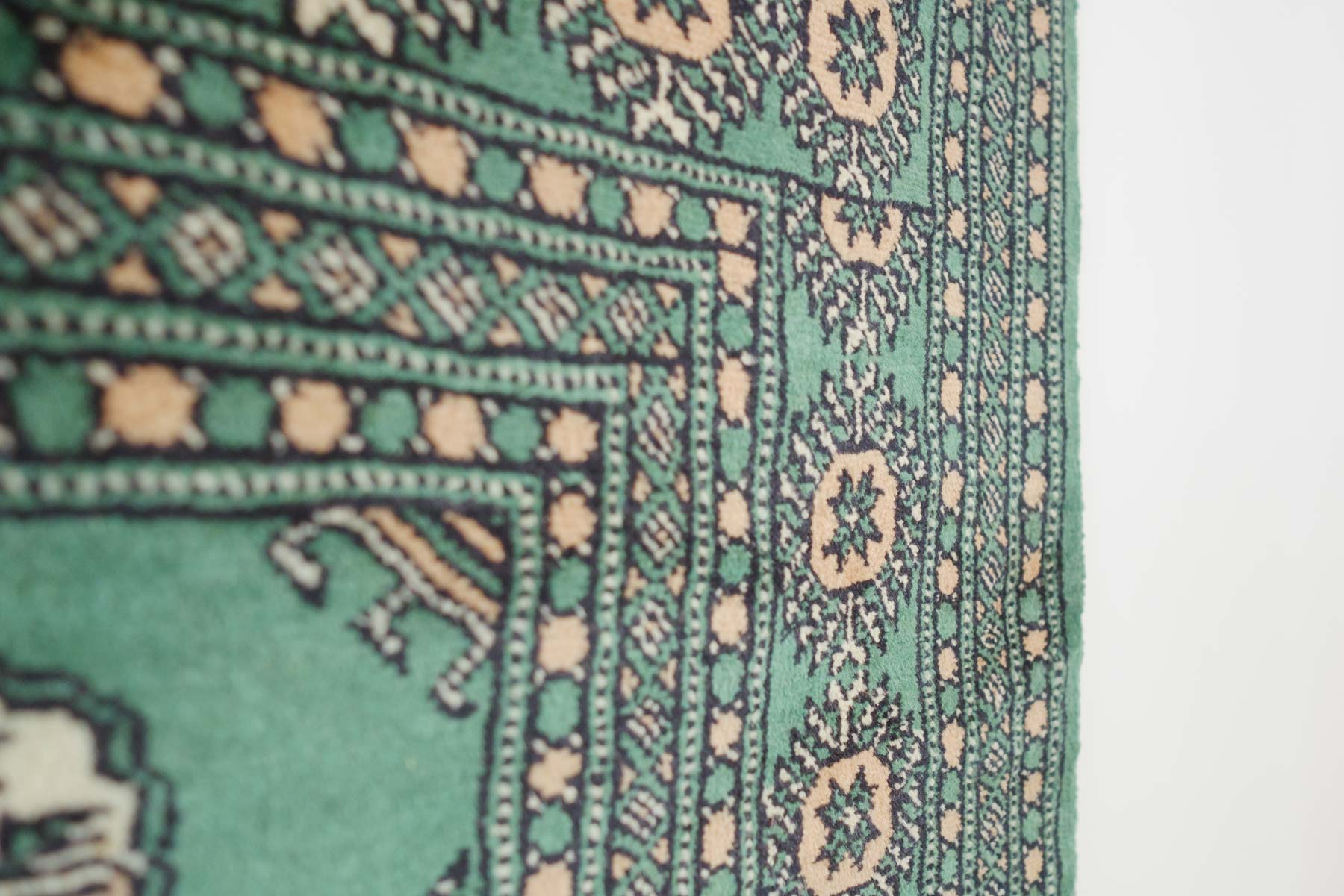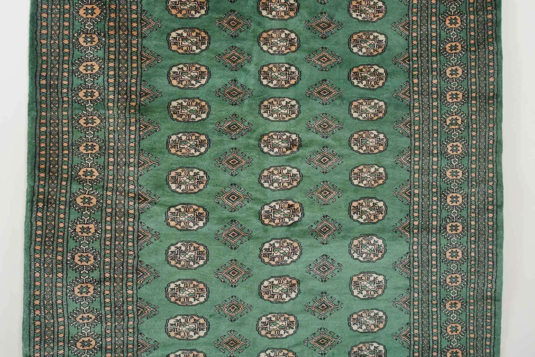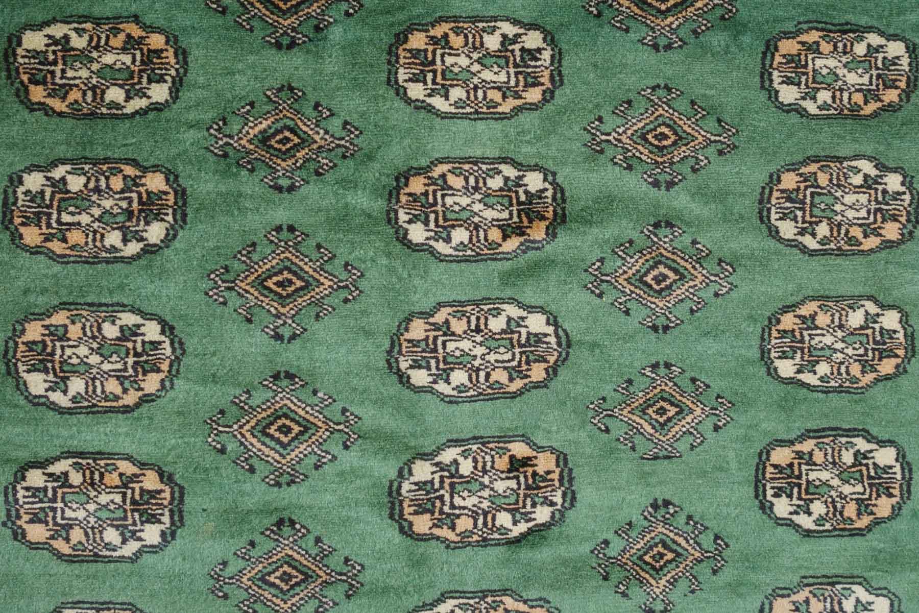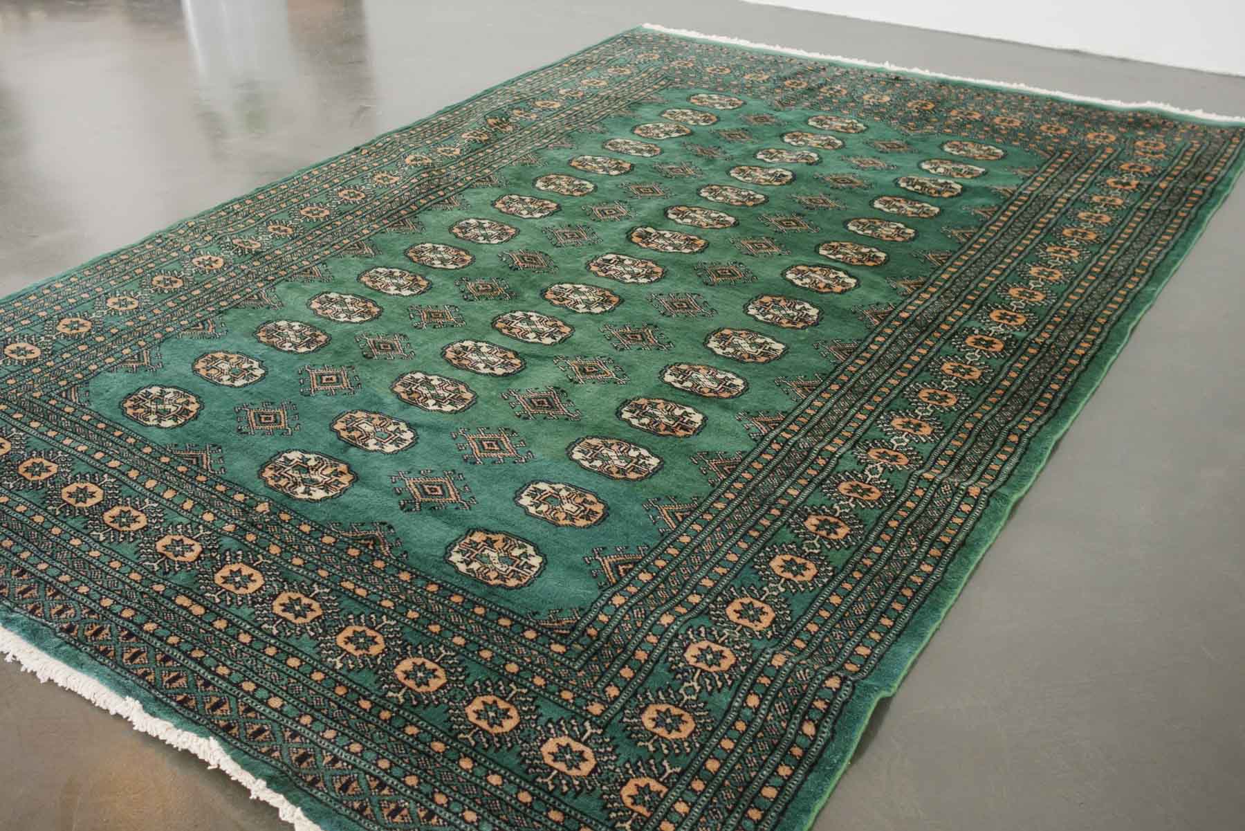 name: Dema origin: Pakistan style: rug, carpet material: hand knotted wool colors:green, camel, cream, black age: vintage condition: good, age related wear - see pictures